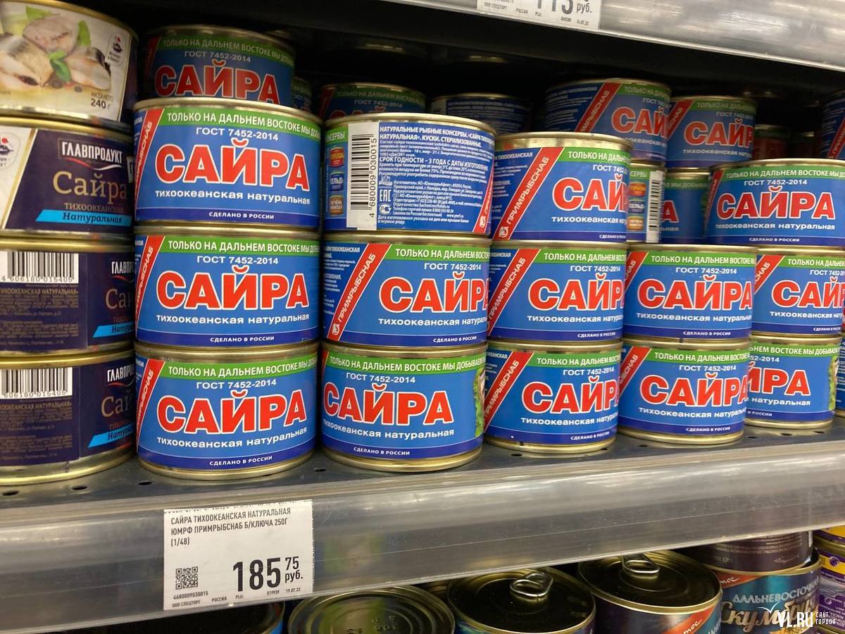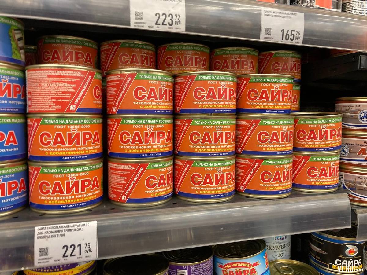 Сайра ушла в океан и стала недосягаемой для российских судов ещё в прошлом году, поэтому стоимость консервов так резко выросла. Сайра от «Доброфлота» натуральная и с маслом в «Самбери» сегодня стоит 229,98 рубля за баночку 254 г. Сайра с маслом и без объёмом 230 г от производителя «Вианг» обойдётся в 149,98 рубля за баночку. Сайра от «Южморрыбфлота» стоит 129,99 рубля за 250 г.
