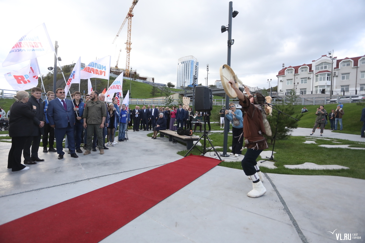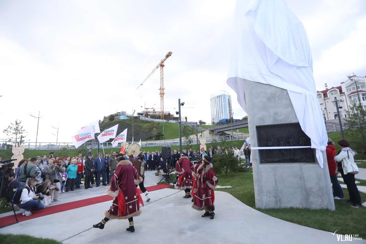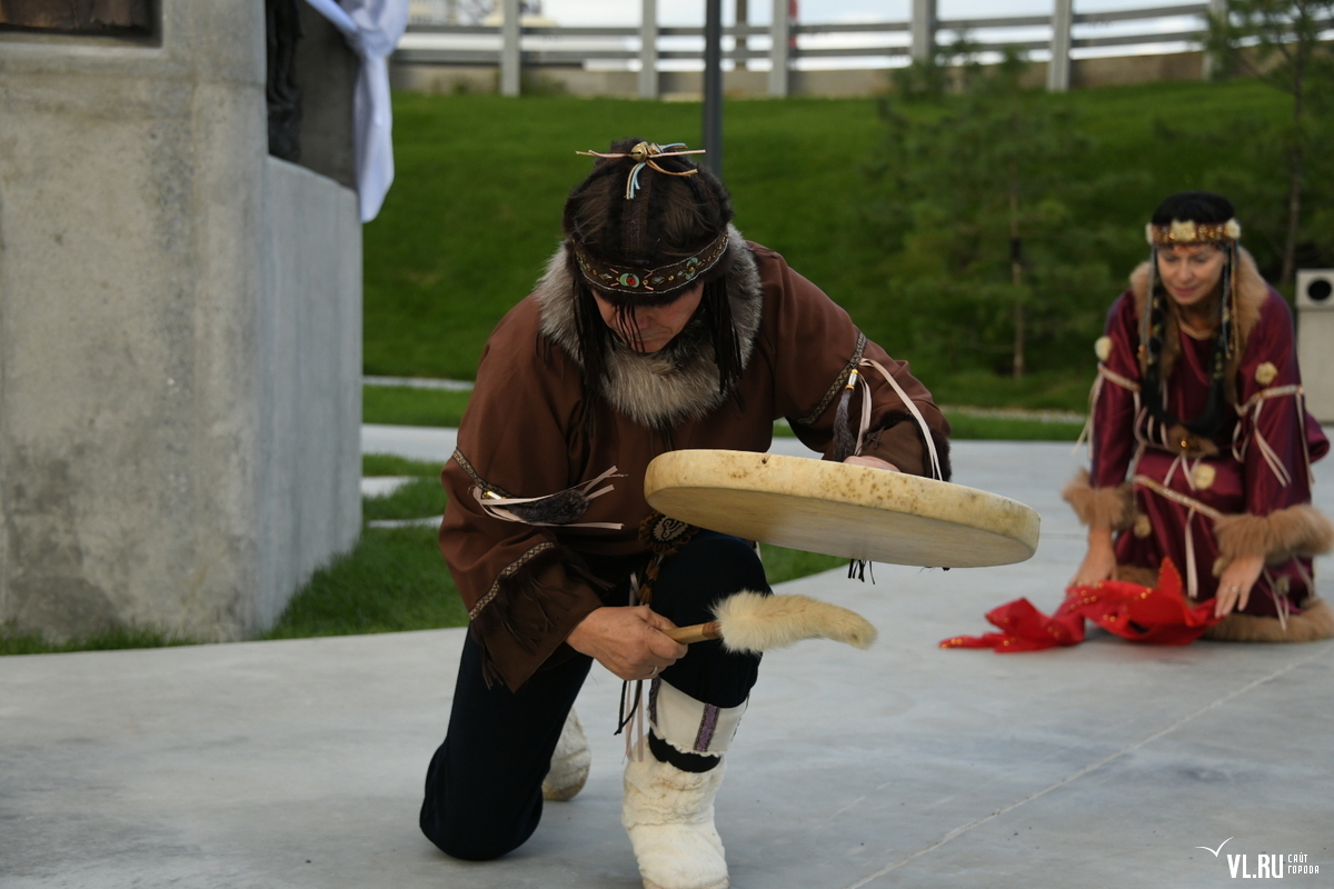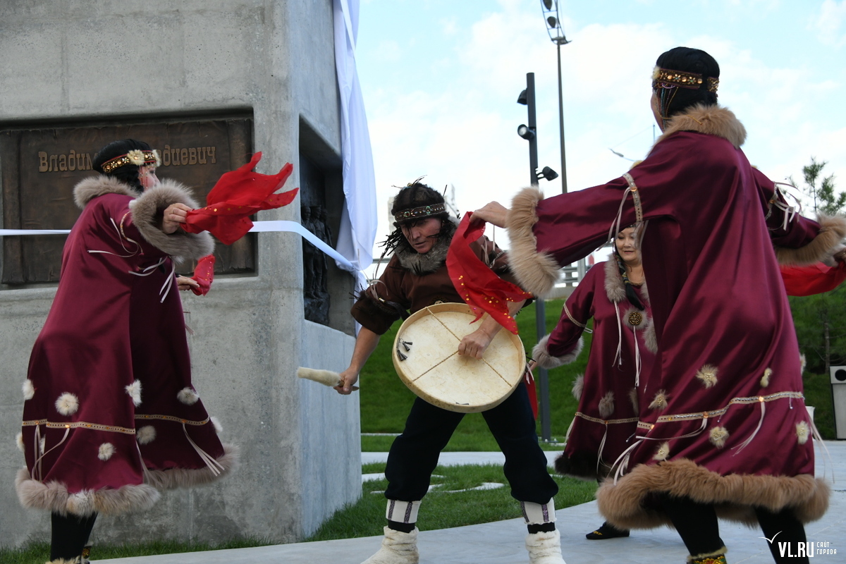 Непосредственно церемонию открытия монумента сегодня предварял хореографический номер, представивший танец коренных народов Дальнего Востока. После этого (и нескольких торжественных речей) в присутствии гостей и прессы полог с монумента был снят. Сдёрнули ткань втроём: глава края Олег Кожемяко, глава Владивостока Константин Шестаков и председатель попечительского совета Центра «Амурский тигр» Константин Чуйченко. Затем последовали традиционные «фотосессии».
