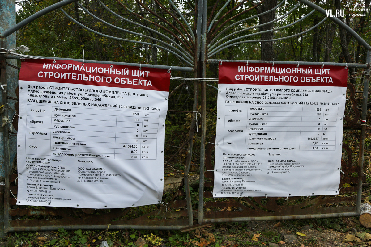 Также застройщик готовит к строительным работам и соседний участок 25:28:050025:3285 площадью всего 1,5 га – здесь информационный стенд сообщает, что новый ЖК будет называться «Садгород». Судя по кадастровой карте, крупных объектов на данной территории нет. Администрация Владивостока разрешением № 25-2-13/517 от 9 сентября дала возможность провести здесь вырубку 1599 деревьев и 148 кустарников, а также снять 14 636 кв. м травяного покрова.