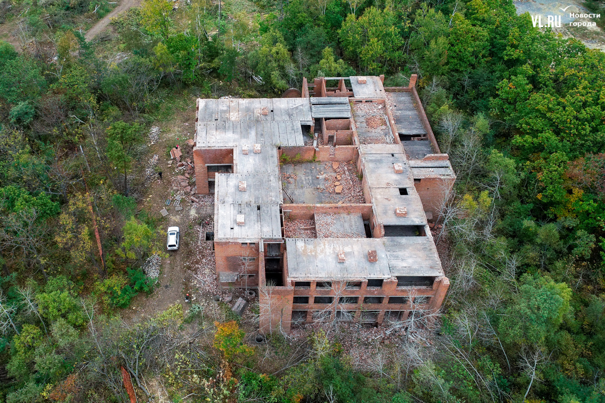 Сейчас на участке бывшего детского лагеря рабочие разбирают кирпичную кладку на одном из корпусов. Вокруг строения рубят деревья – расчищают место для крана, который будет снимать бетонные перекрытия. Планируемые к вырубке насаждения заранее были отмечены цветными лентами.