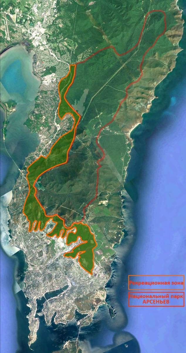 На приложенной схеме новый национальный парк «Арсеньев» (хотя раньше Константин Шестаков называл его парком имени Муравьёва-Амурского) вместе с рекреационной зоной будут начинаться на юге от промзоны на улице Фадеева и бывших теплиц на Нейбута, где сейчас строится микрорайон «Зелёный бульвар», а заканчиваться – у бухты Муравьиная на севере. С востока граница должна пройти по горному хребту, с запада – вдоль линии существующей застройки вплоть до Артёма. Таким образом парк включит в себя Богатинское и Пионерское водохранилища, центр отдыха «Комета», горнолыжный курорт «Синяя сопка», сам Ботанический сад, несколько объектов Владивостокской крепости и ВЛОР, но не затронет побережья. Отметим, однако, что схема эта очень примерная – она включает в себя территорию, где произрастает наиболее ценная и редкая местная флора.