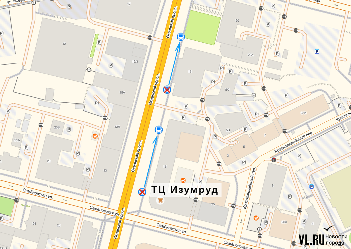 Две остановки ТЦ «Изумруд» тоже оказались в новом месте – на несколько метров дальше, чем были. Идея в том, чтобы отодвинуть остановки подальше от перекрёстков – чтобы у выезжающих на Океанский проспект было место перестроиться с автобусной полосы. А в случае с Алеутской – было место перестроиться на полосу и повернуть направо на Прапорщика Комарова.