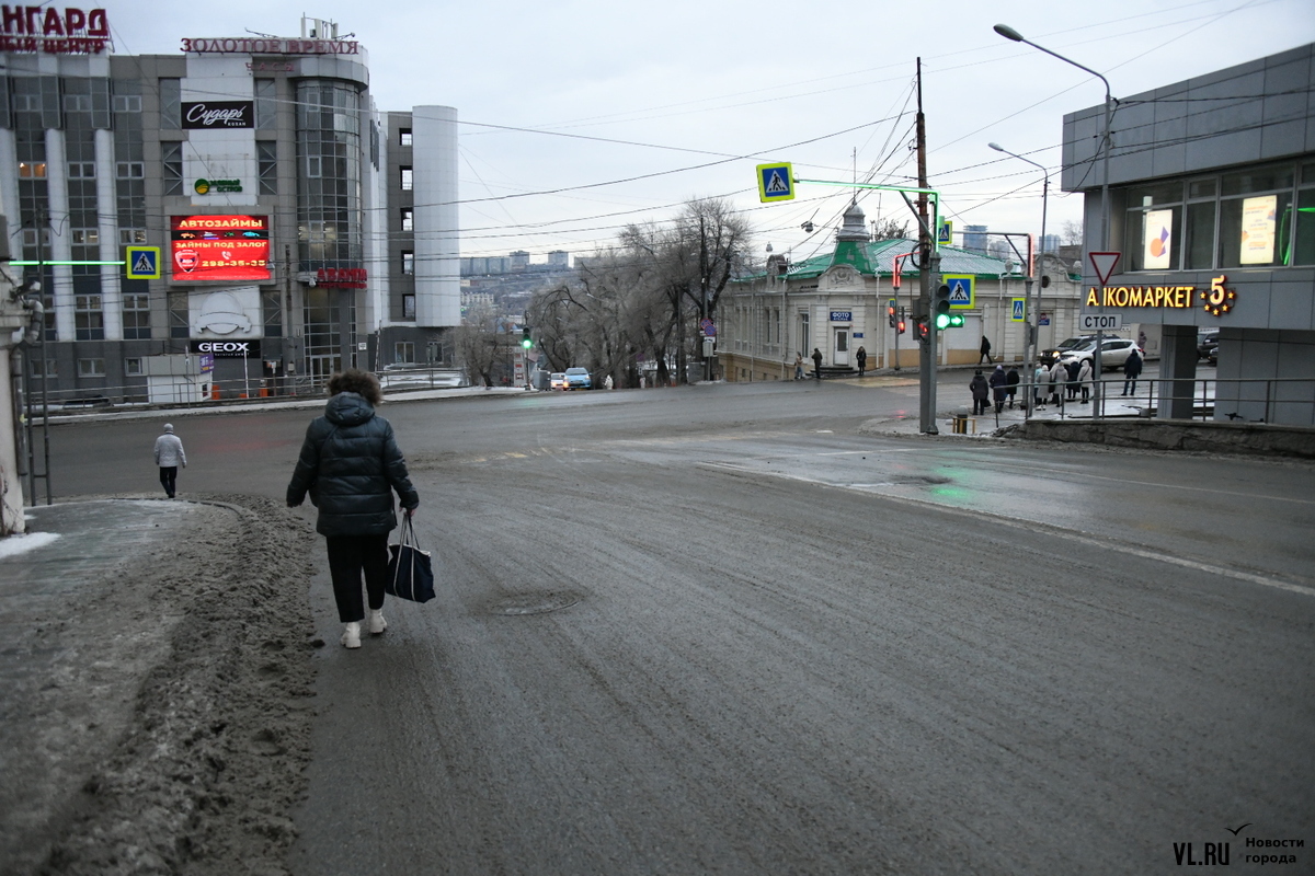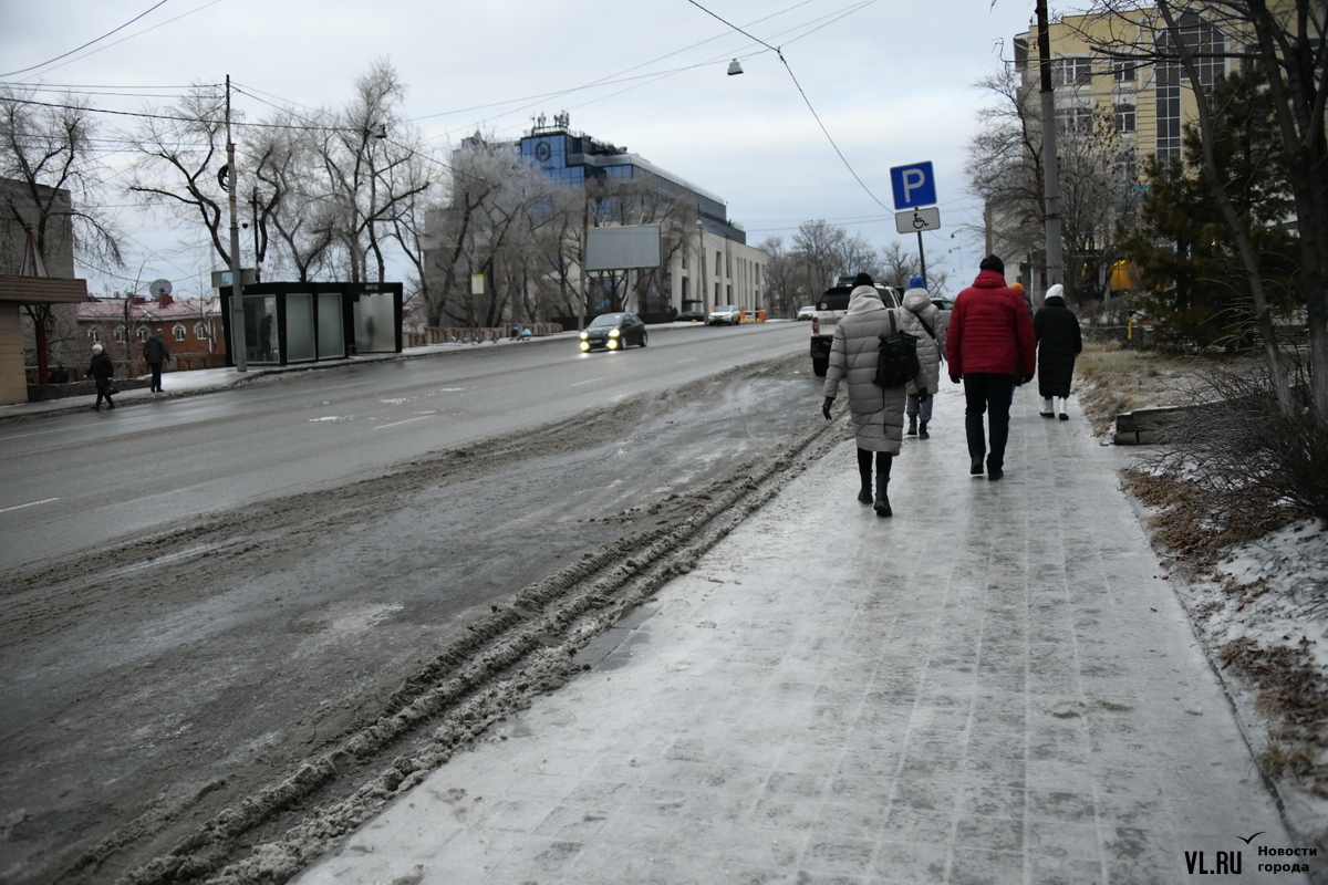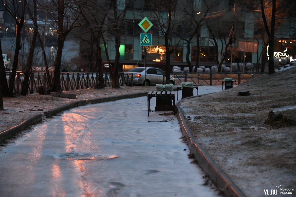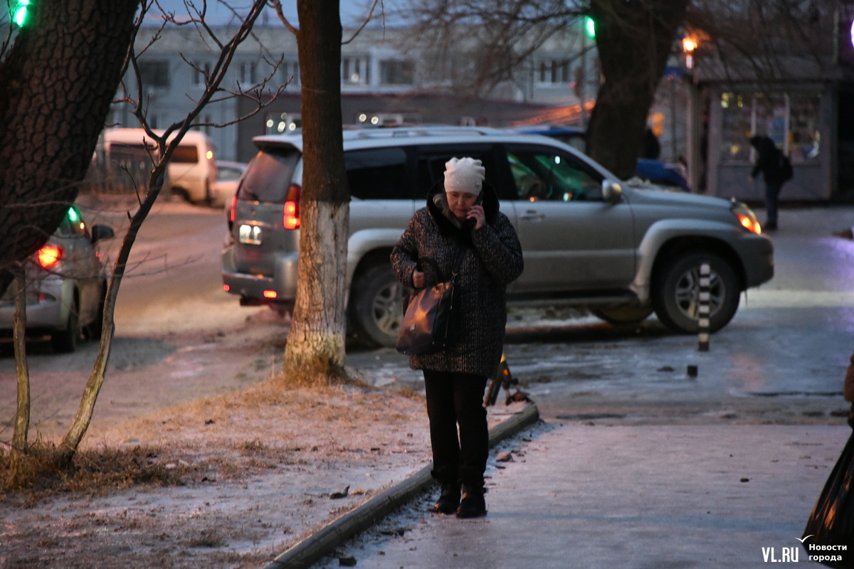 Тем временем граждане советуют друг другу надевать сегодня только шипованную обувь или использовать специальные ледоступы. Приобрести их можно на сайте FarPost.ru.