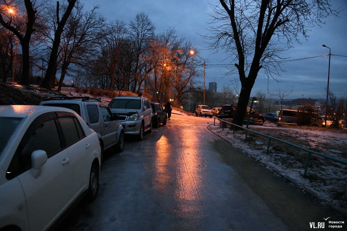 В понедельник и в ночь на вторник, 29 ноября, Владивосток пережил очередной ледяной дождь. Придомовые территории, тротуары и проезды оказались покрыты толстым слоем льда. Где-то дворники пытались чистить и посыпать проходы, а где-то даже не начинали. А вот основные дороги города в нормальном состоянии. Многие пешеходы покидают скользкие тротуары и идут по проезжей части.