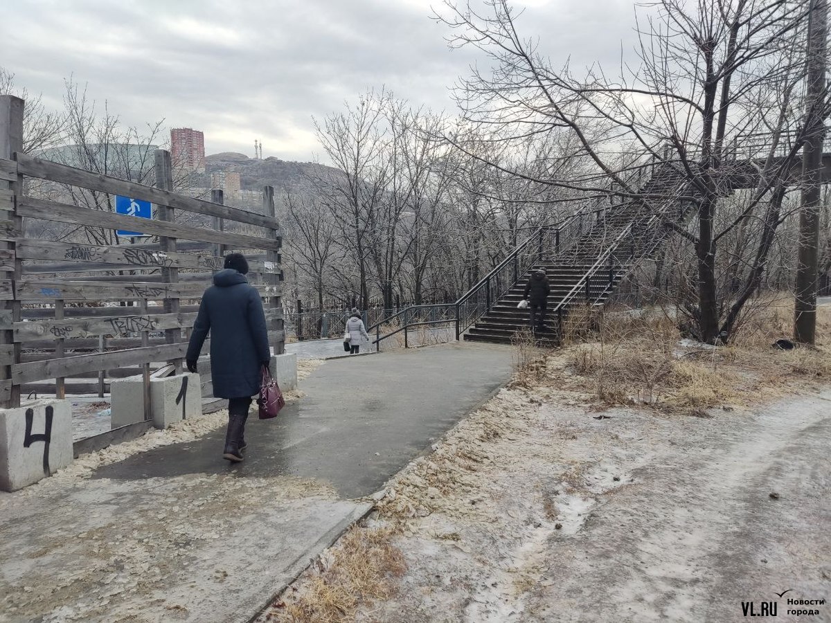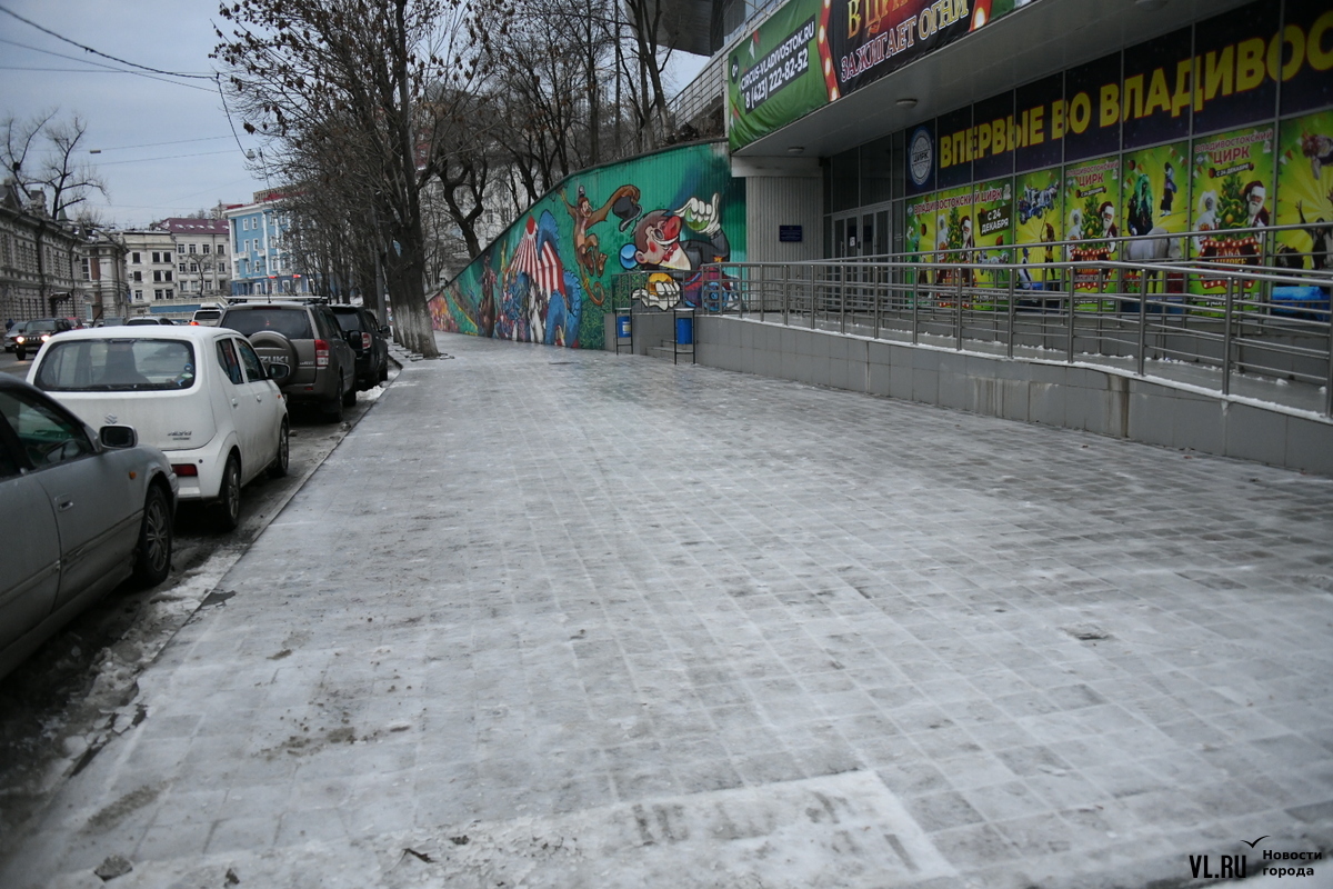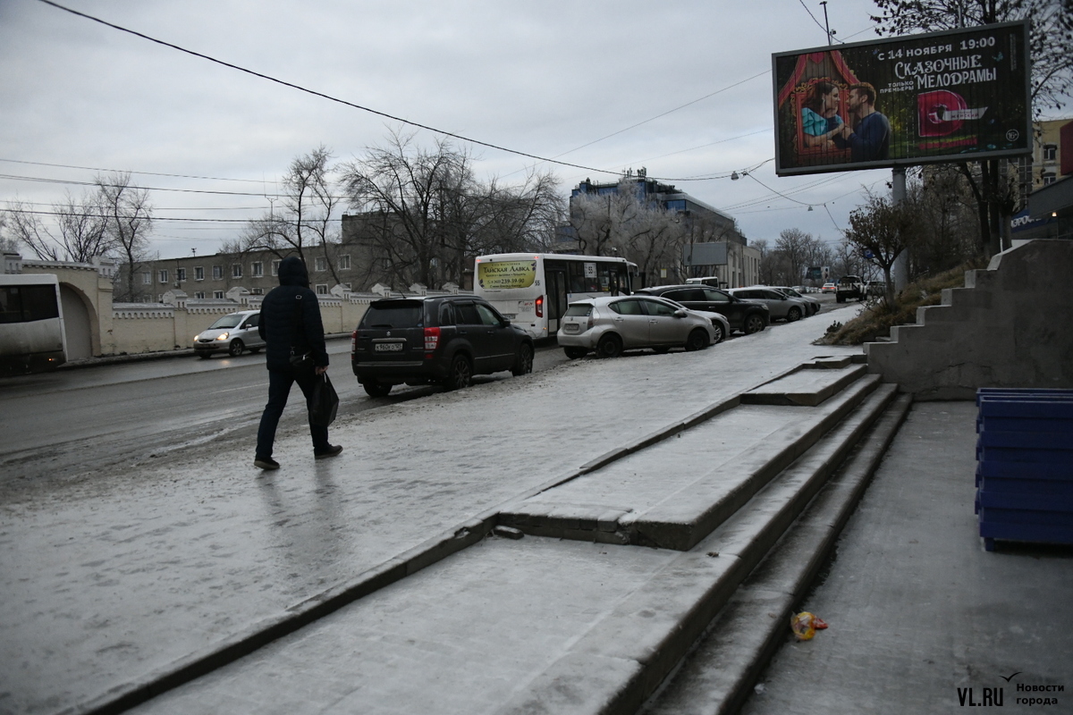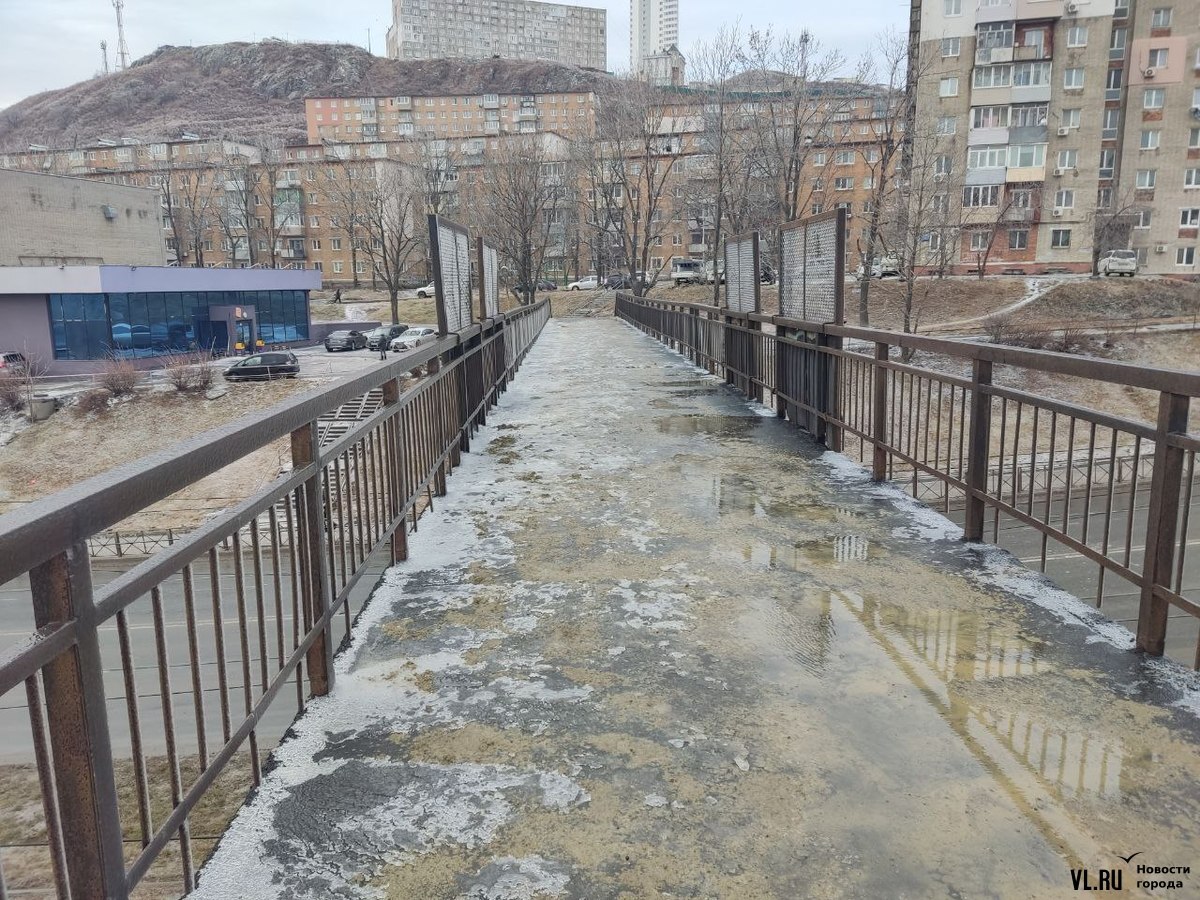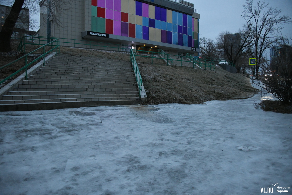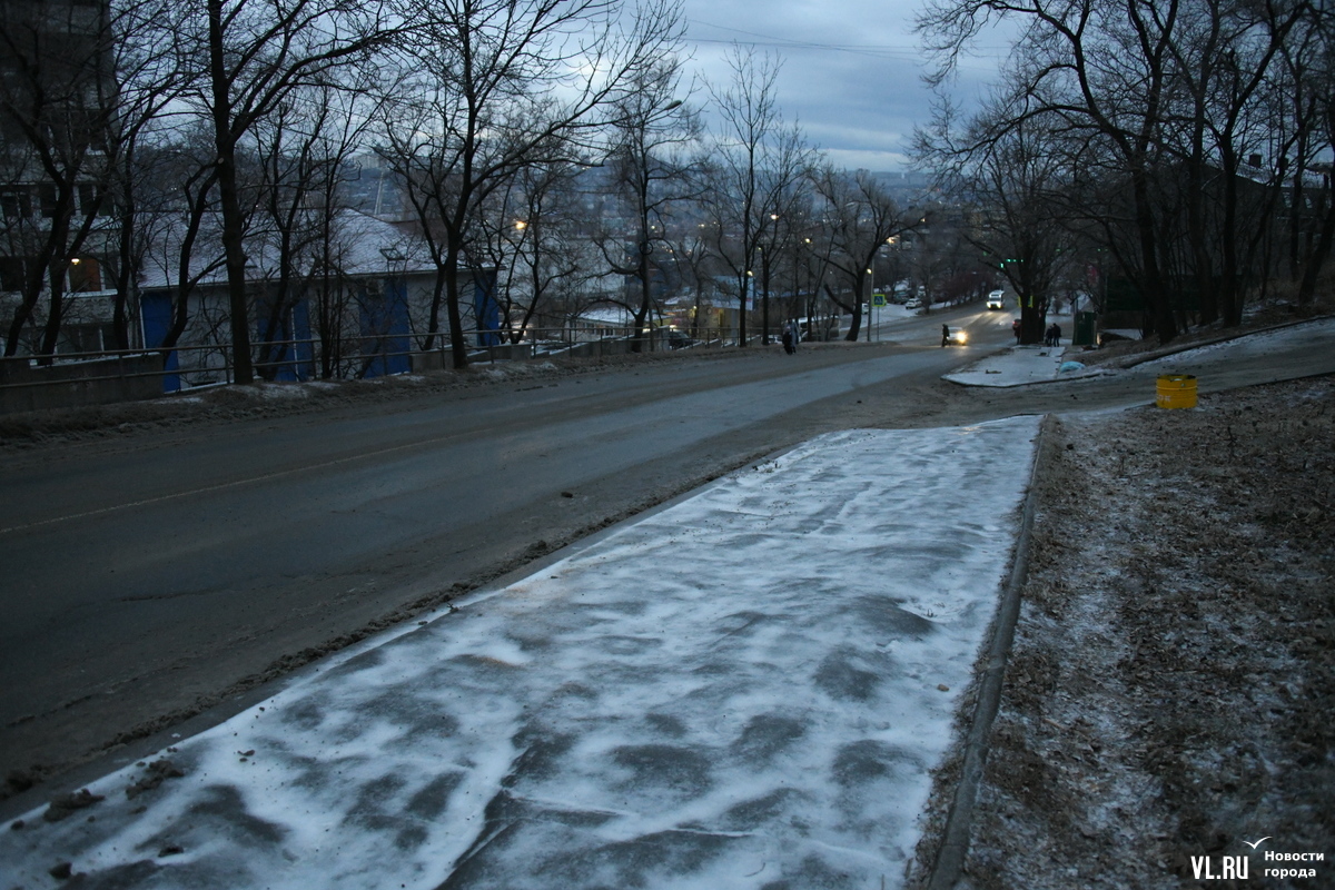 Обновление 13:00: Ледяная корка начинает таять на солнце, превращаясь в кашу, этому помогает песок. Один из самых больших надземных переходов Владивостока на площади Баляева завален снежно-ледяной кашей. Передвигаться по ней легче, чем по ледяной глазури, но осторожность всё равно не помешает. Виадук около спортклуба «Варяг» уже основательно почистили и посыпали песко-соляной смесью, а вот подойти к нему целый квест. Тротуар покрыт льдом, и люди идут по трамвайным путям, по пожухлой траве.