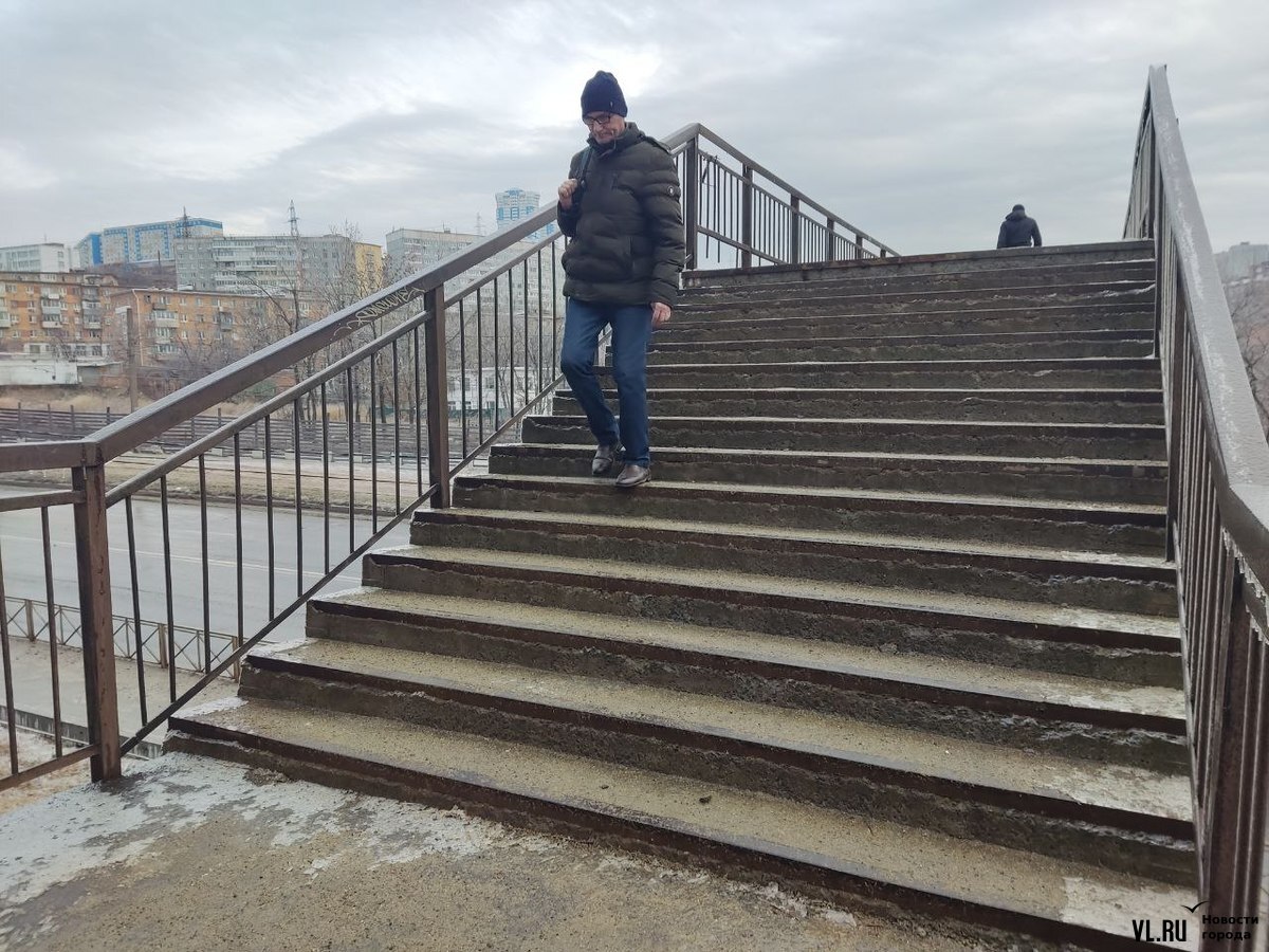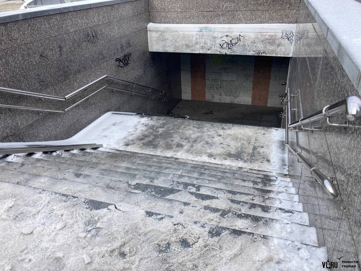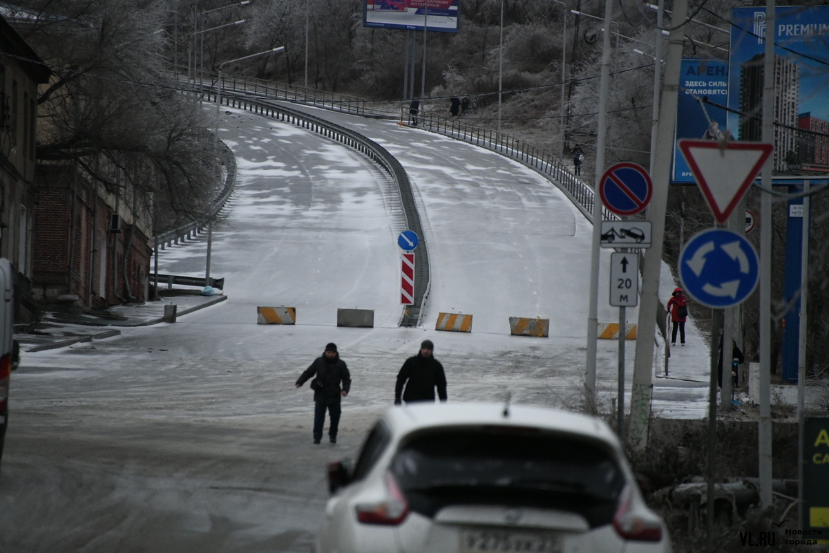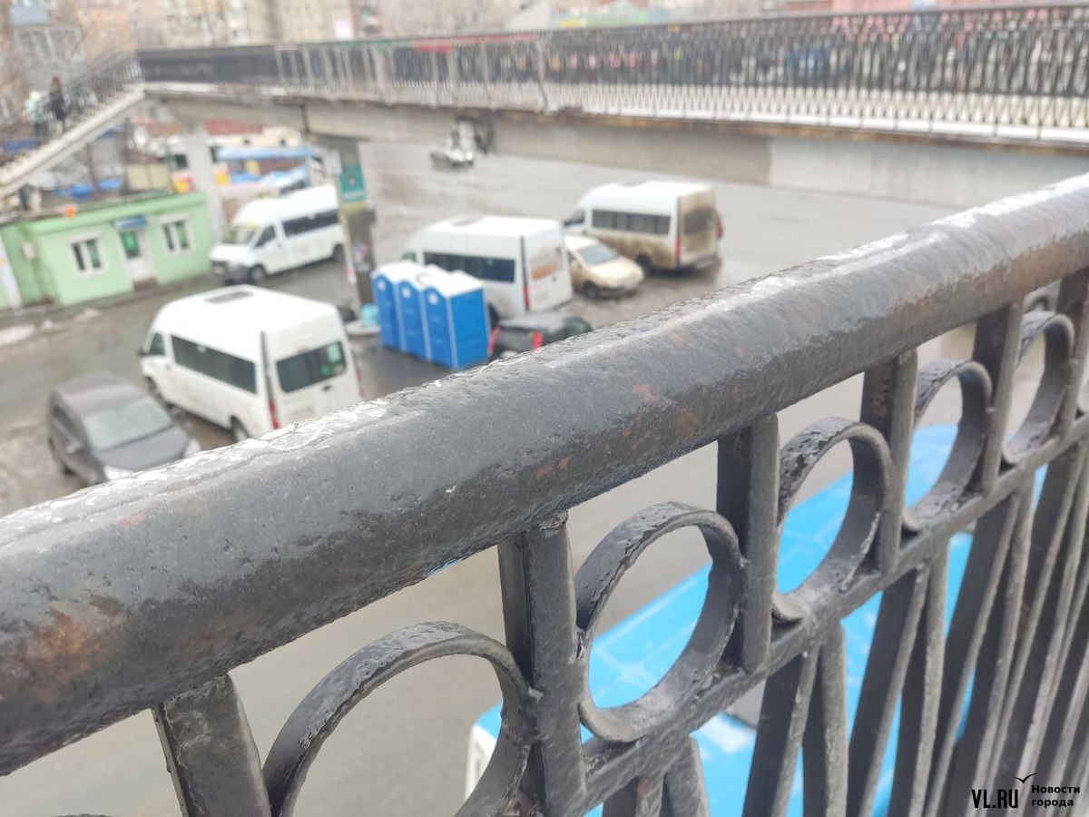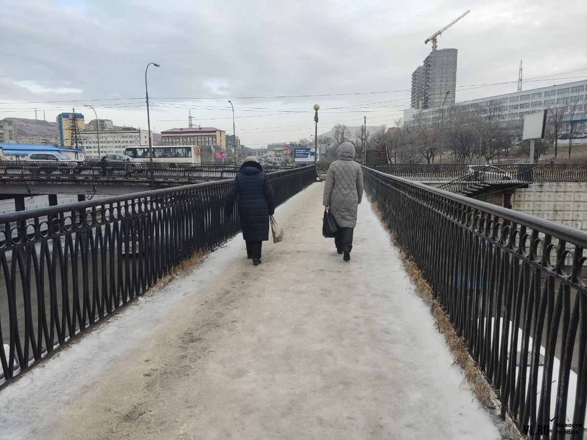 Обновление 13:00: Ледяная корка начинает таять на солнце, превращаясь в кашу, этому помогает песок. Один из самых больших надземных переходов Владивостока на площади Баляева завален снежно-ледяной кашей. Передвигаться по ней легче, чем по ледяной глазури, но осторожность всё равно не помешает. Виадук около спортклуба «Варяг» уже основательно почистили и посыпали песко-соляной смесью, а вот подойти к нему целый квест. Тротуар покрыт льдом, и люди идут по трамвайным путям, по пожухлой траве.