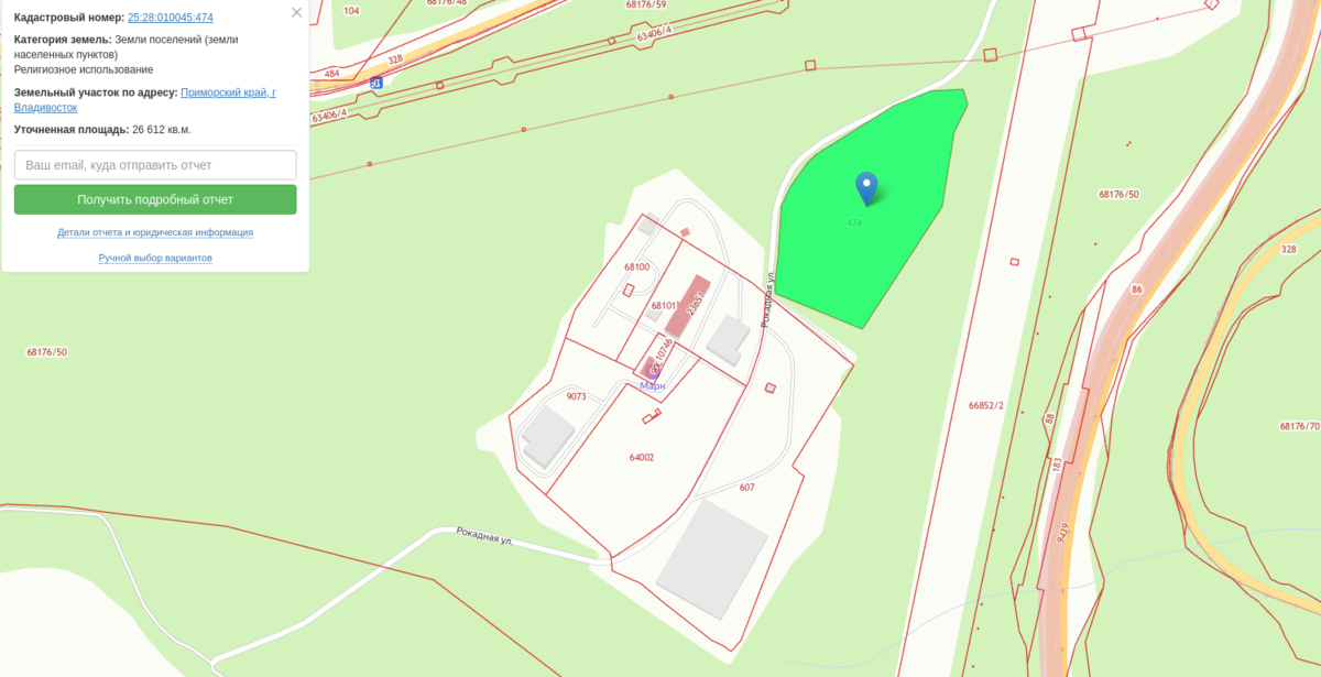 Участок 25:28:010045:474 площадью 6680 кв. м рядом с контейнерным терминалом уже исключён из запретной зоны Владивостокского лесничества Минобороны и передан в собственность Владивостокского городского округа. Изменён вид разрешённого использования – на религиозное.
