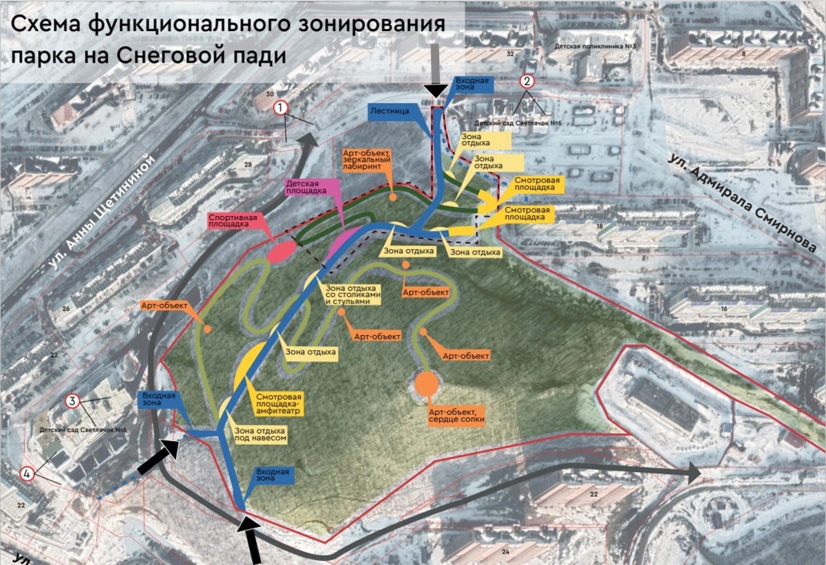 В основе концепции благоустройства, представленной архитекторами бюро «Море», лежит отношение к сопке как к живому существу. На долю сопки выпали разные испытания – например, когда на её территории взрывались боевые снаряды. В 2010 году район Снеговой Пади начали активно застраивать. Покушались инвесторы и на сопку, но в 2021-м её удалось отстоять, чтобы создать новый парк.