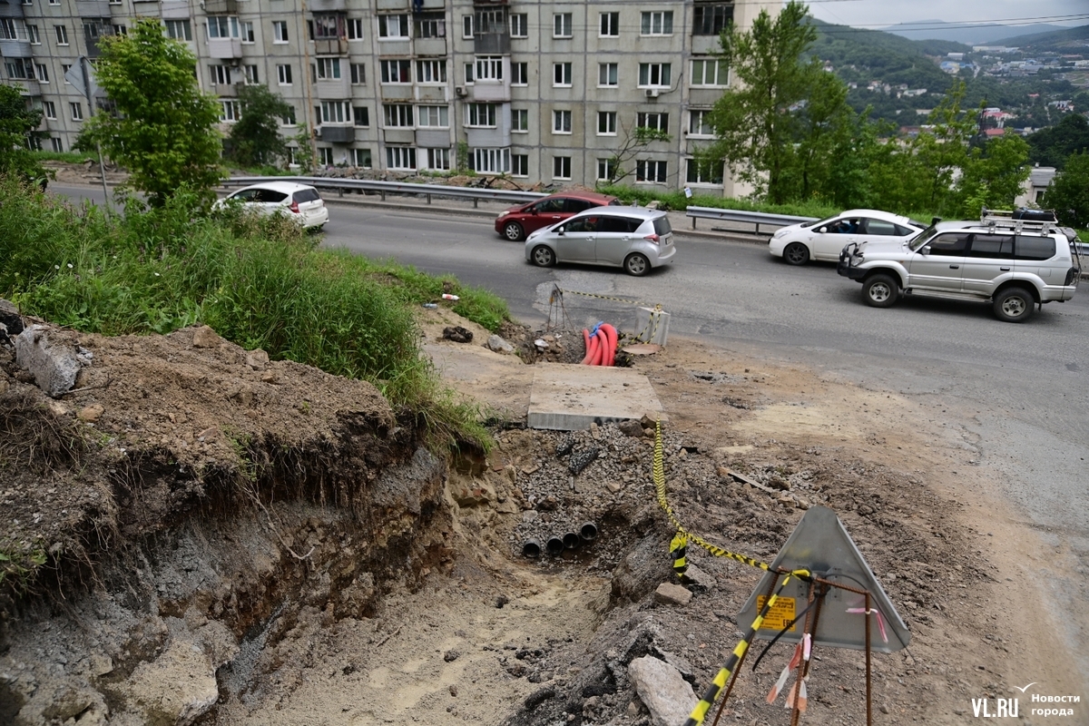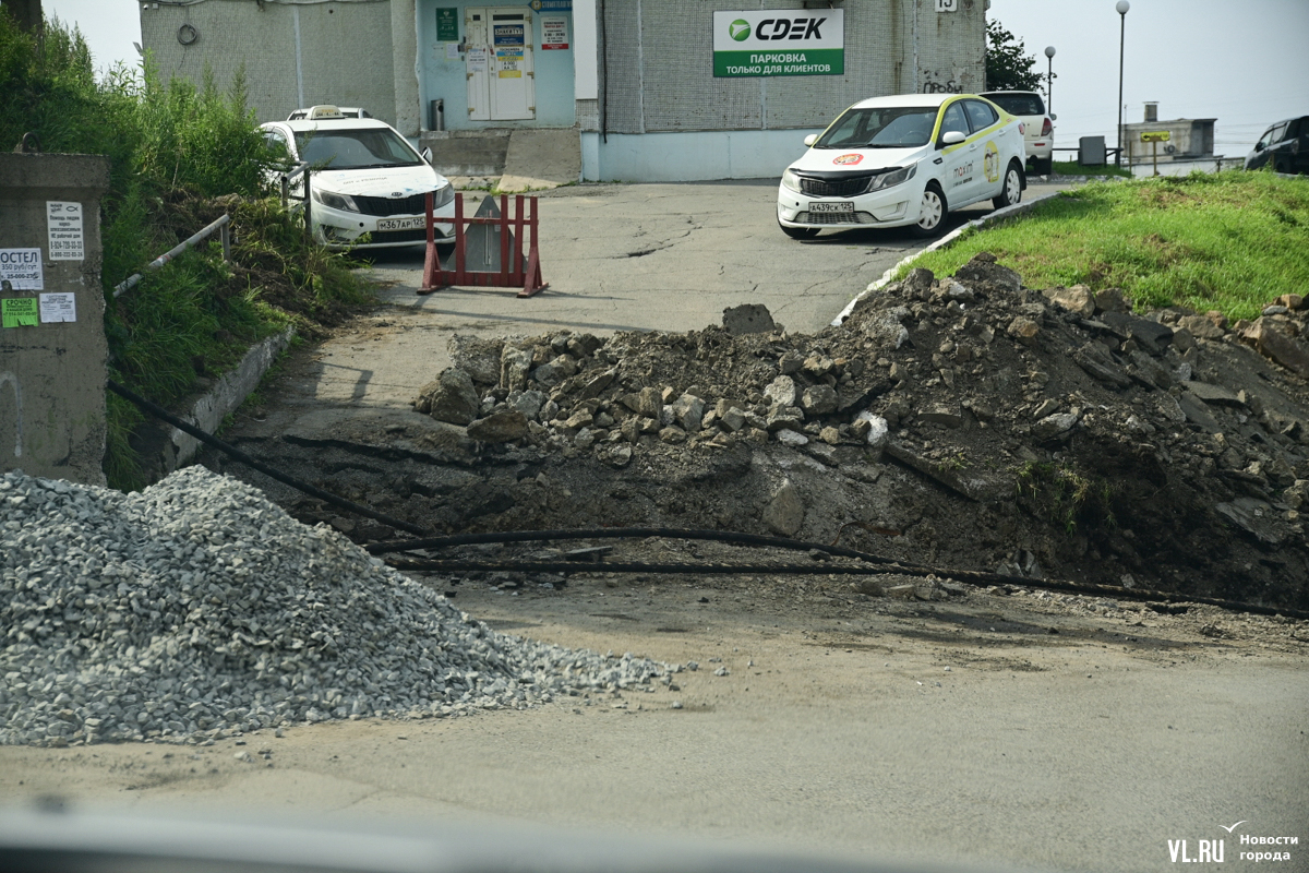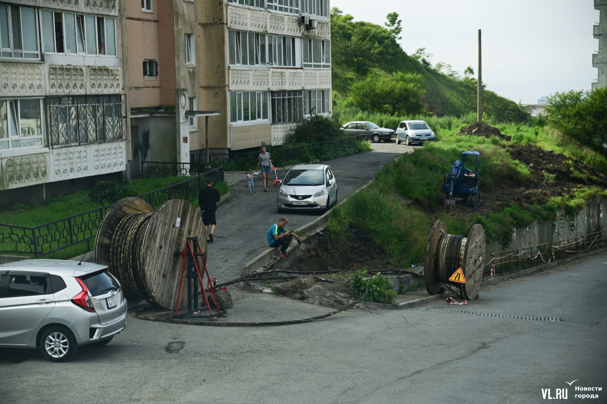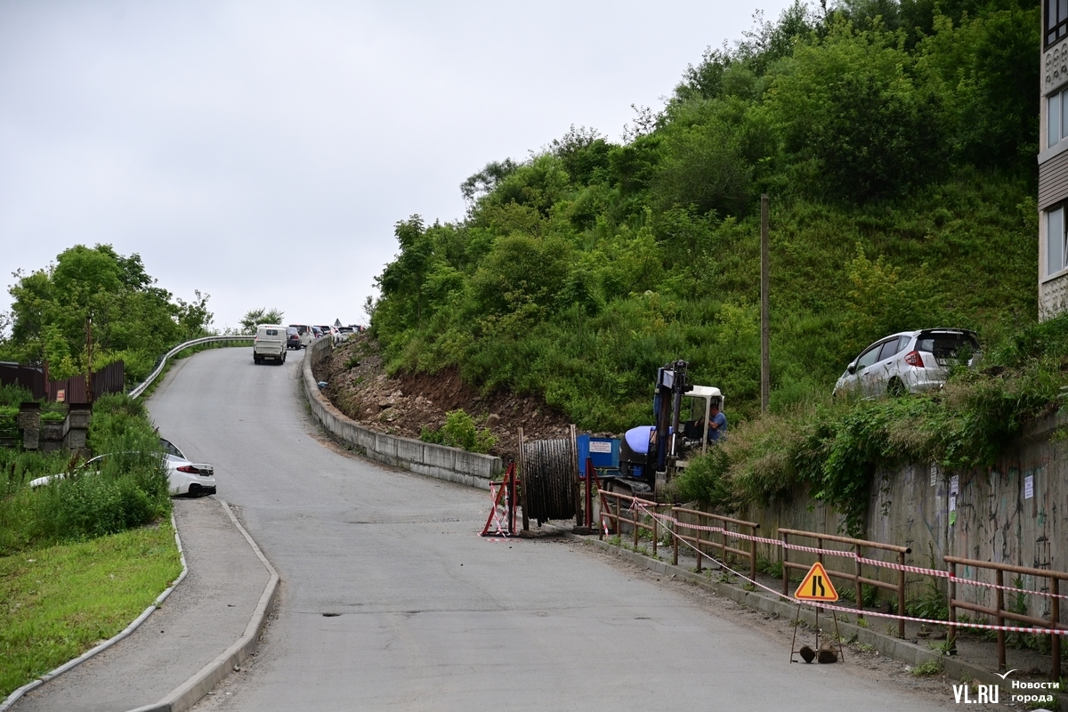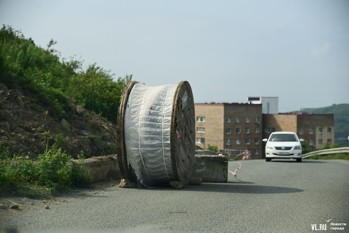 С конца июня по улице Котельникова во Владивостоке прокладывают электрокабель на стройку нового ЖК. Для этого здесь на время уничтожили несколько сотен метров нового тротуара, а теперь раскопали траншеи вдоль подъёма в сторону Красного Знамени, тоже отремонтированного в прошлом году. Машины едут по узкой дороге вдоль обрыва, объезжая бетонные блоки и катушки с кабелем. А в месте, где траншея пересекла Котельникова, осталась глубокая яма, которая уже несколько дней собирает пробки между 3-й Рабочей и Баляева.