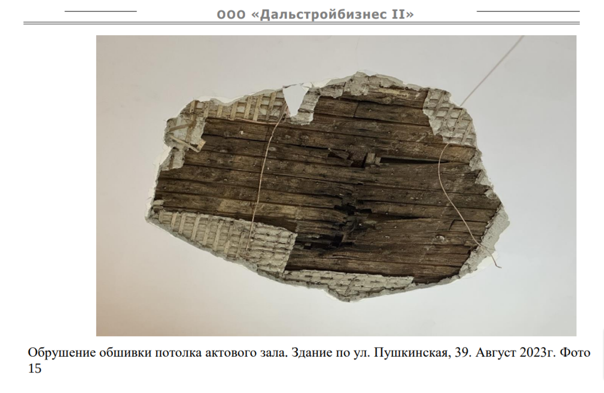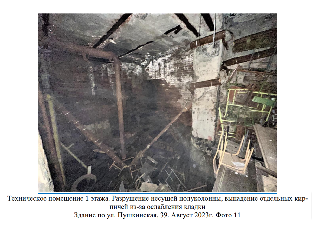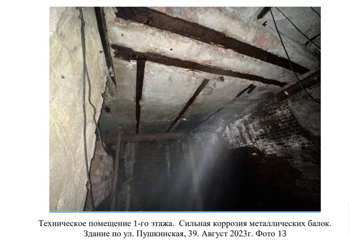 Согласно этому документу, у здания действительно огромное количество проблем. В частности, «из-за аварийного состояния перекрытия и наружных стен существует угроза обрушения перекрытия чердачного этажа, что создаёт угрозу жизни и здоровью граждан». Поэтому зданию требуется проведение срочных противоаварийных мероприятий.