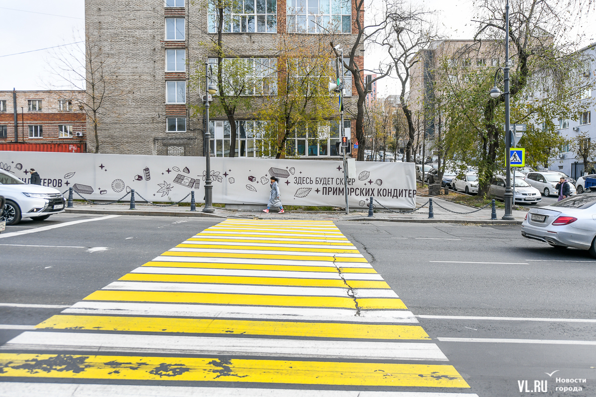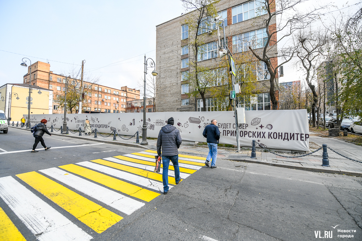 В проект по благоустройству нового сквера приморских кондитеров во Владивостоке войдёт часть прилегающей улицы Комарова. Из-за затянувшегося изменения проектной документации подрядчик не успел залить бетоном дорожки, уложить брусчатку, установить скамейки, перенести пешеходный переход и светофор. Эти работы, как и озеленение, переносятся на весну.
