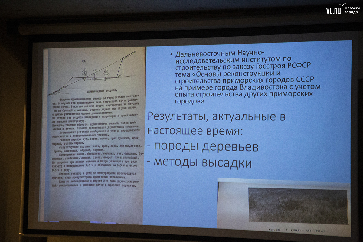 «Мы в архиве Ботанического сада нашли очень интересный документ, отчёт Дальневосточного научно-исследовательского института по строительству по теме реконструкции и строительства приморских городов СССР на примере Владивостока с учётом опыта строительства других приморских городов. Первые попытки сделать сопки Владивостока снова зелёными были предприняты в 1948 году. Лишённые растительности возвышенности несли в город глину, песок, массу инертных материалов, которые заполняли улицы. Земля без растительности и задернения являлась источником пыли в зимнее время. Читая этот отчёт, мы получили массу интересной информации. С 1952 по 1957 год проводились очень планомерные эксперименты по озеленению сопки Орлиное Гнездо, а с 1958-го по 1961-й присоединились сопки Холодильник, Мальцевская, Тигровая и Змеиная», – рассказывает Ирина Крестова.