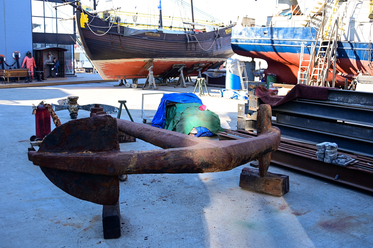 Получается, на небольшом пятачке – вчера, сегодня и завтра: старые якоря, современная реплика поморской ладьи и судно, которое скоро спустят на воду.