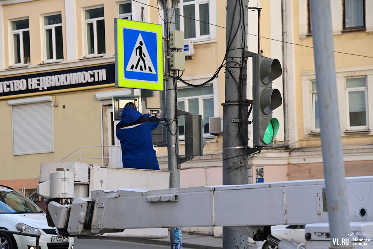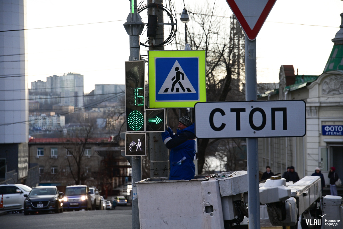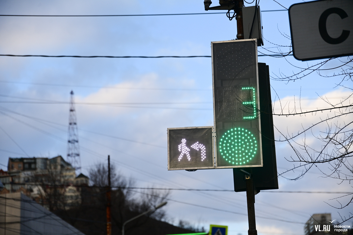 Специалисты Центра организации дорожного движения Владивостока устанавливают новые секции светофоров на перекрёстке улиц Капитана Шефнера и Светланской. В отличие от привычных красных, жёлтых и зелёных, эти будут иметь бело-лунный свет и не предписывать ехать или стоять, а предупреждать о пешеходах на переходе.