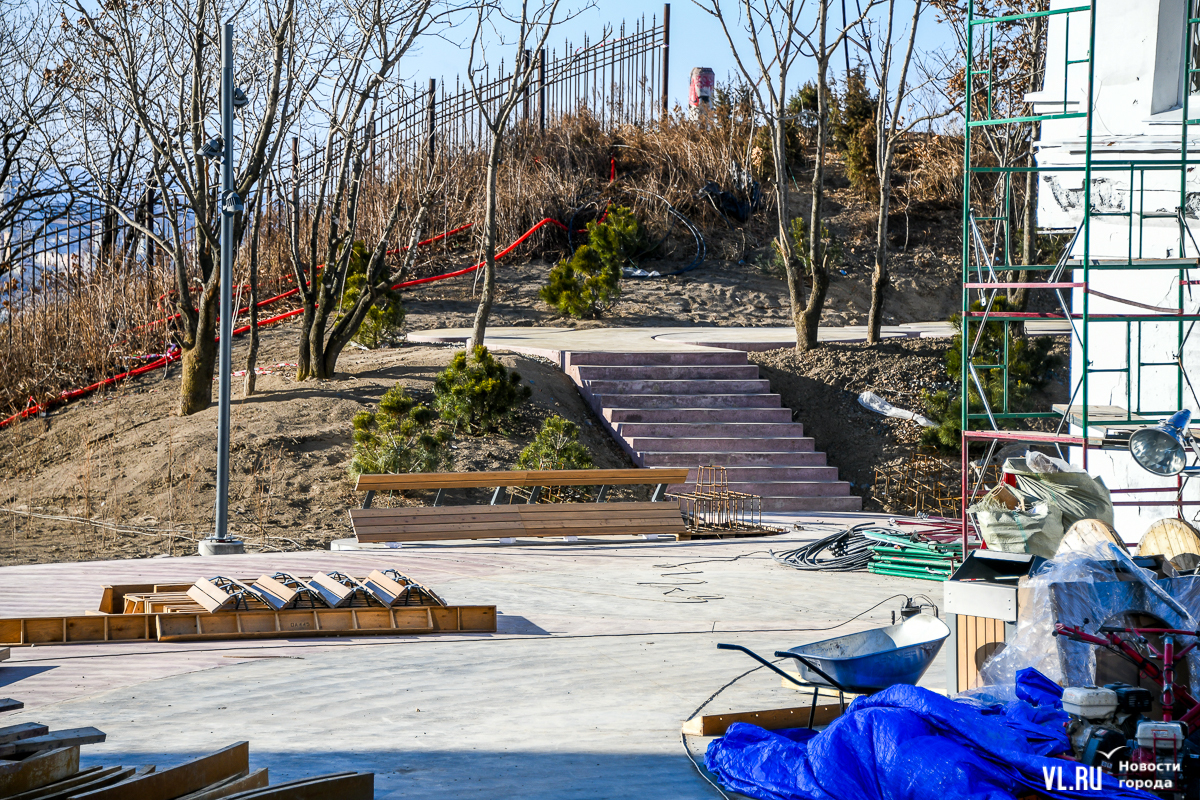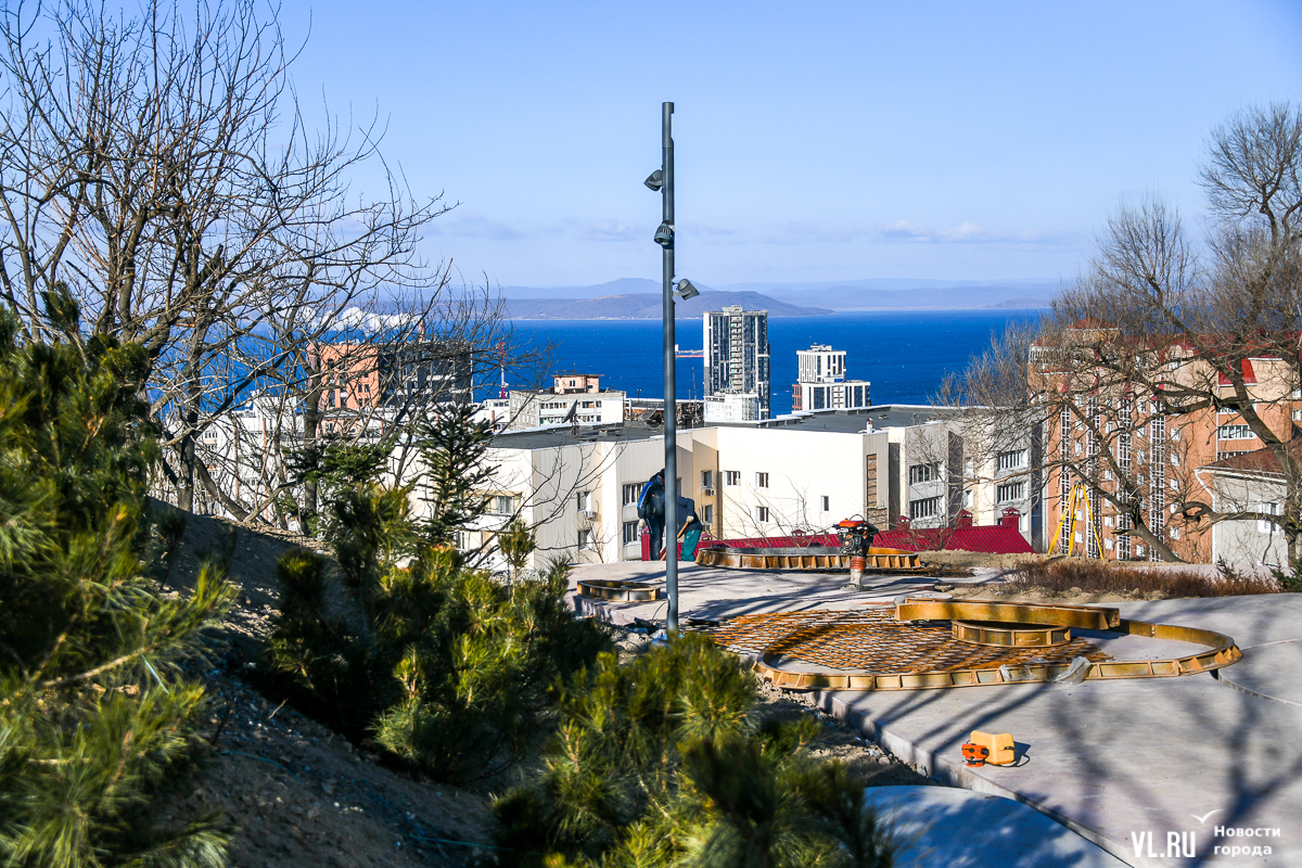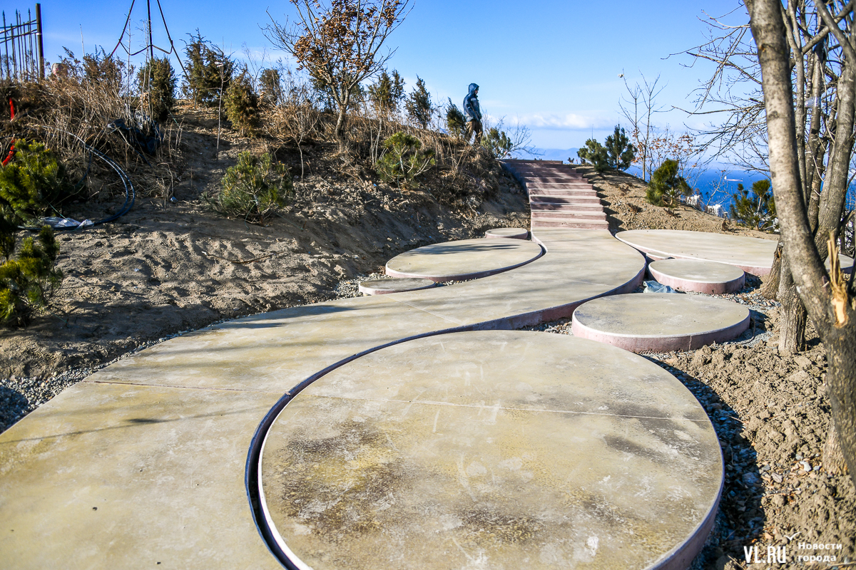 С северной стороны площадки, около ЖК «Каскад», участок подготовили под парковку, теперь здесь грунтовый заезд, в котором есть пара мест, где иногда встают автомобили строителей и местных жителей. Ближе к бывшей учебной станции Владивостокского гидрометеорологического колледжа высадили хвойные, правда, пока они выглядят не очень свежо. Готовы несколько бетонных дорожек, которые ведут к видовой площадке на южной части благоустраиваемой территории. А на восточной стороне уже завершён монтаж двух фонарей и скамеек.