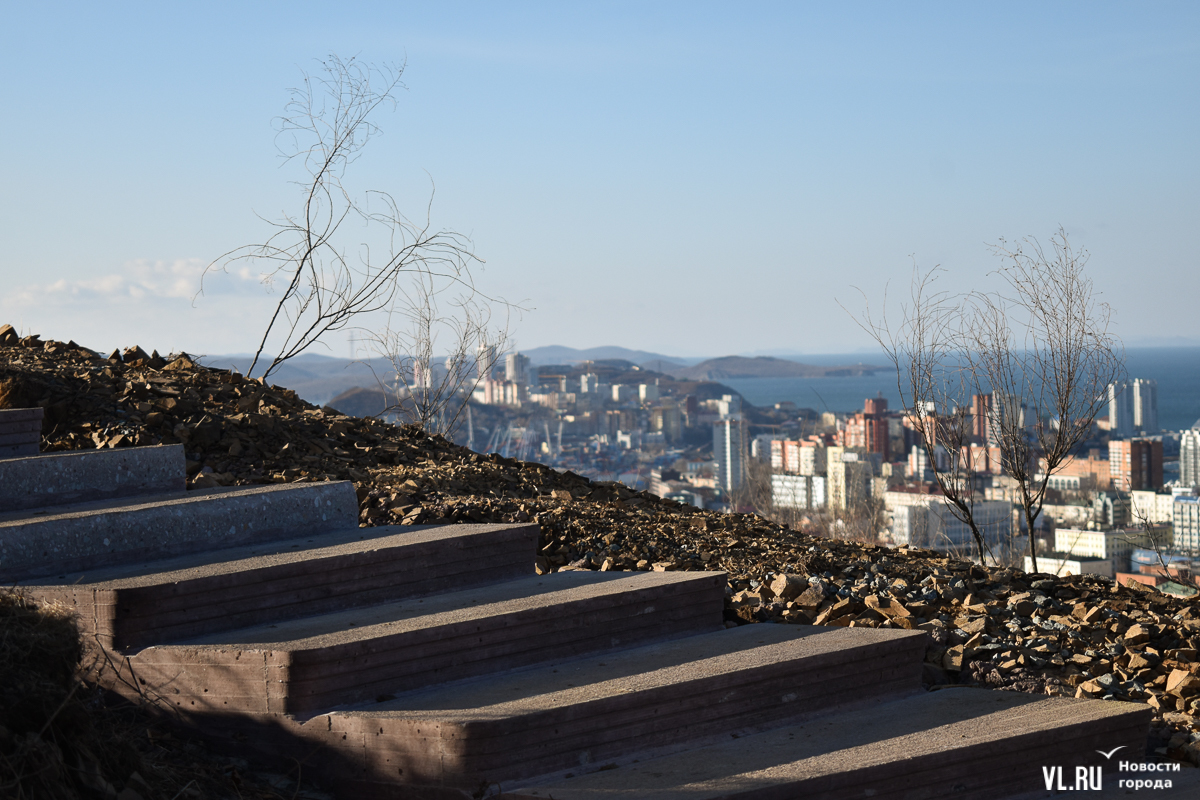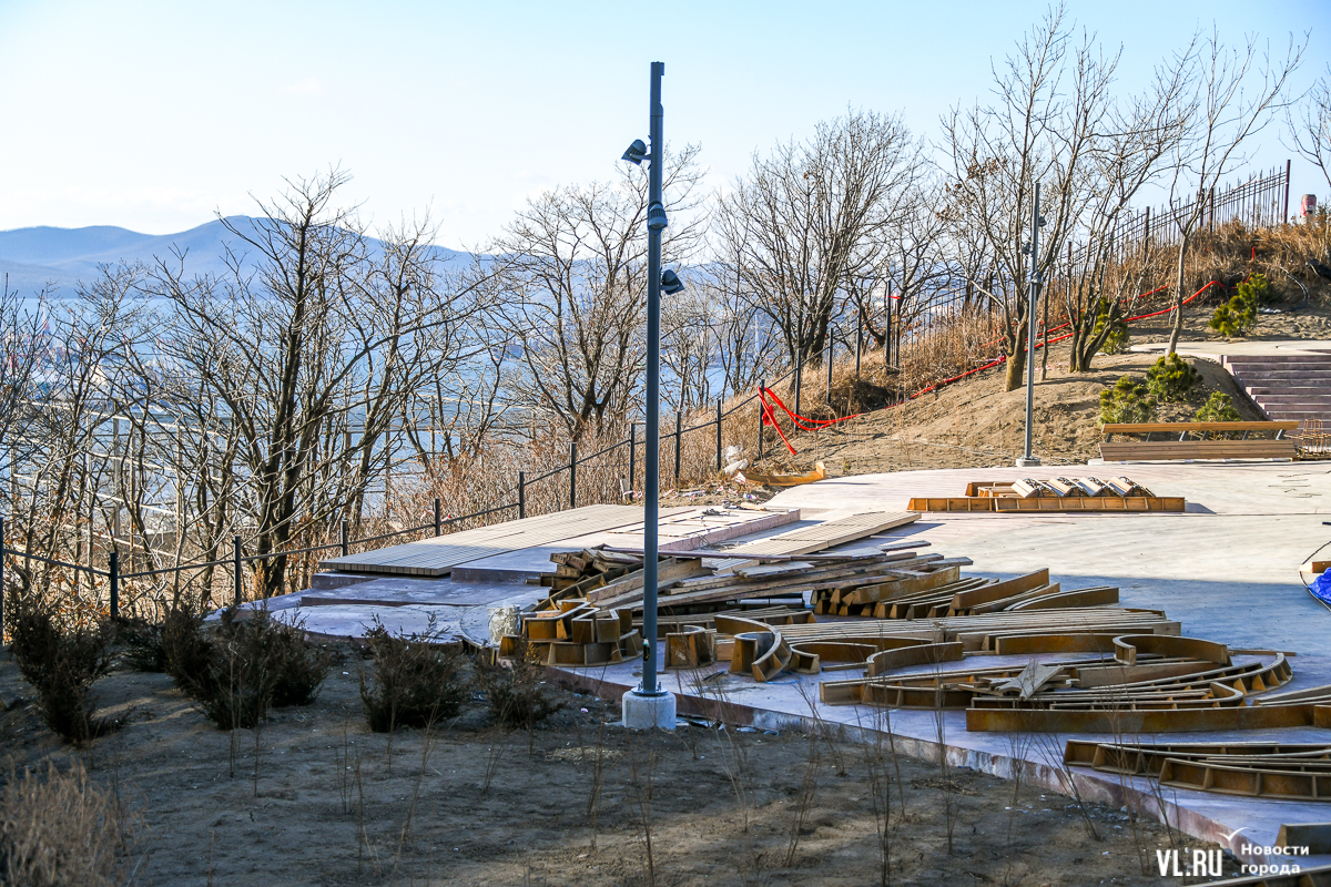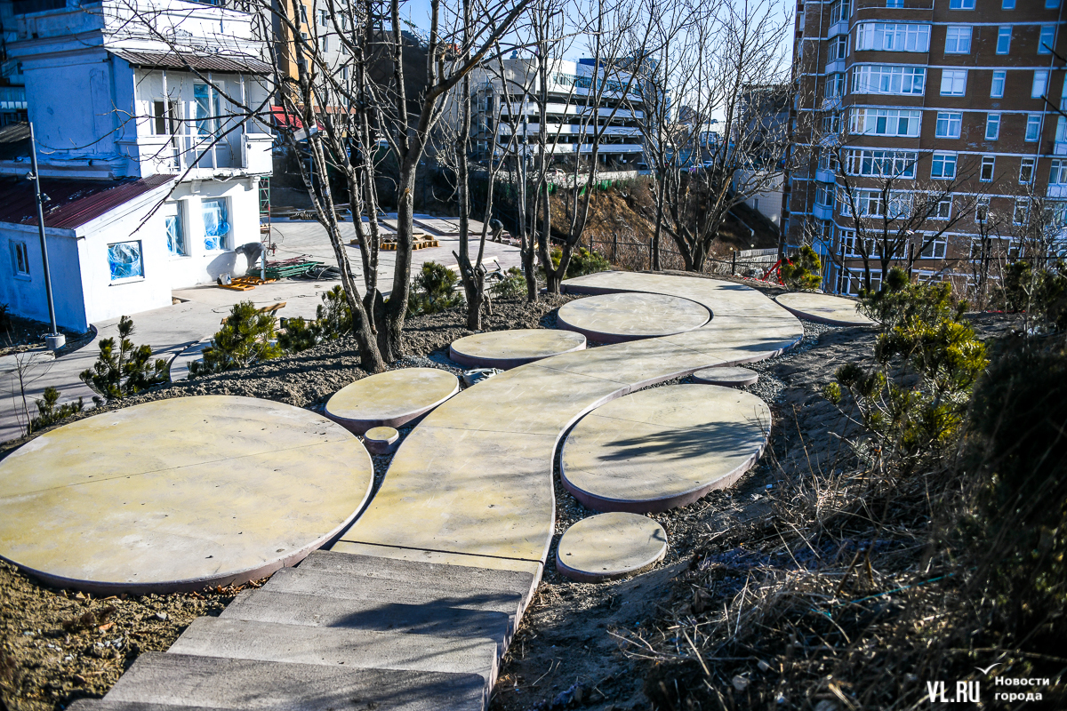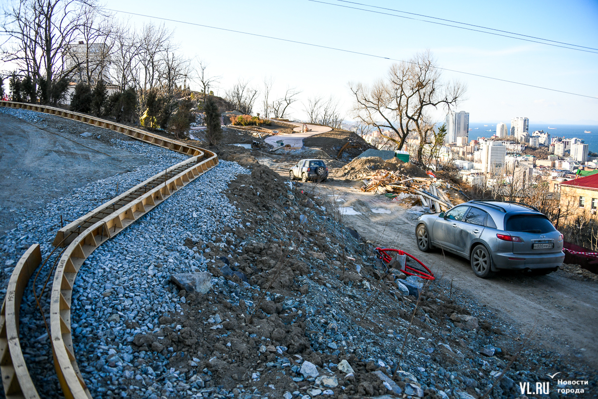 С северной стороны площадки, около ЖК «Каскад», участок подготовили под парковку, теперь здесь грунтовый заезд, в котором есть пара мест, где иногда встают автомобили строителей и местных жителей. Ближе к бывшей учебной станции Владивостокского гидрометеорологического колледжа высадили хвойные, правда, пока они выглядят не очень свежо. Готовы несколько бетонных дорожек, которые ведут к видовой площадке на южной части благоустраиваемой территории. А на восточной стороне уже завершён монтаж двух фонарей и скамеек.