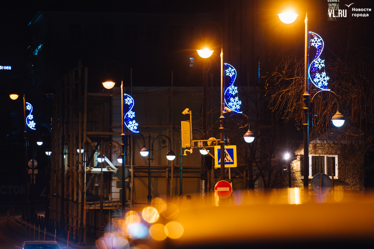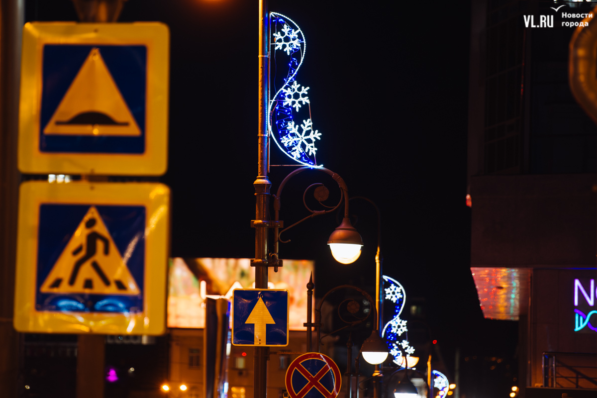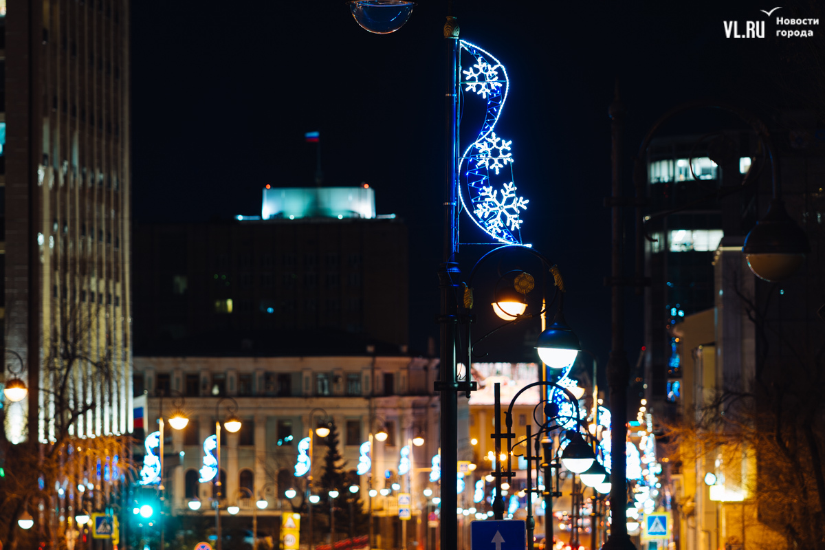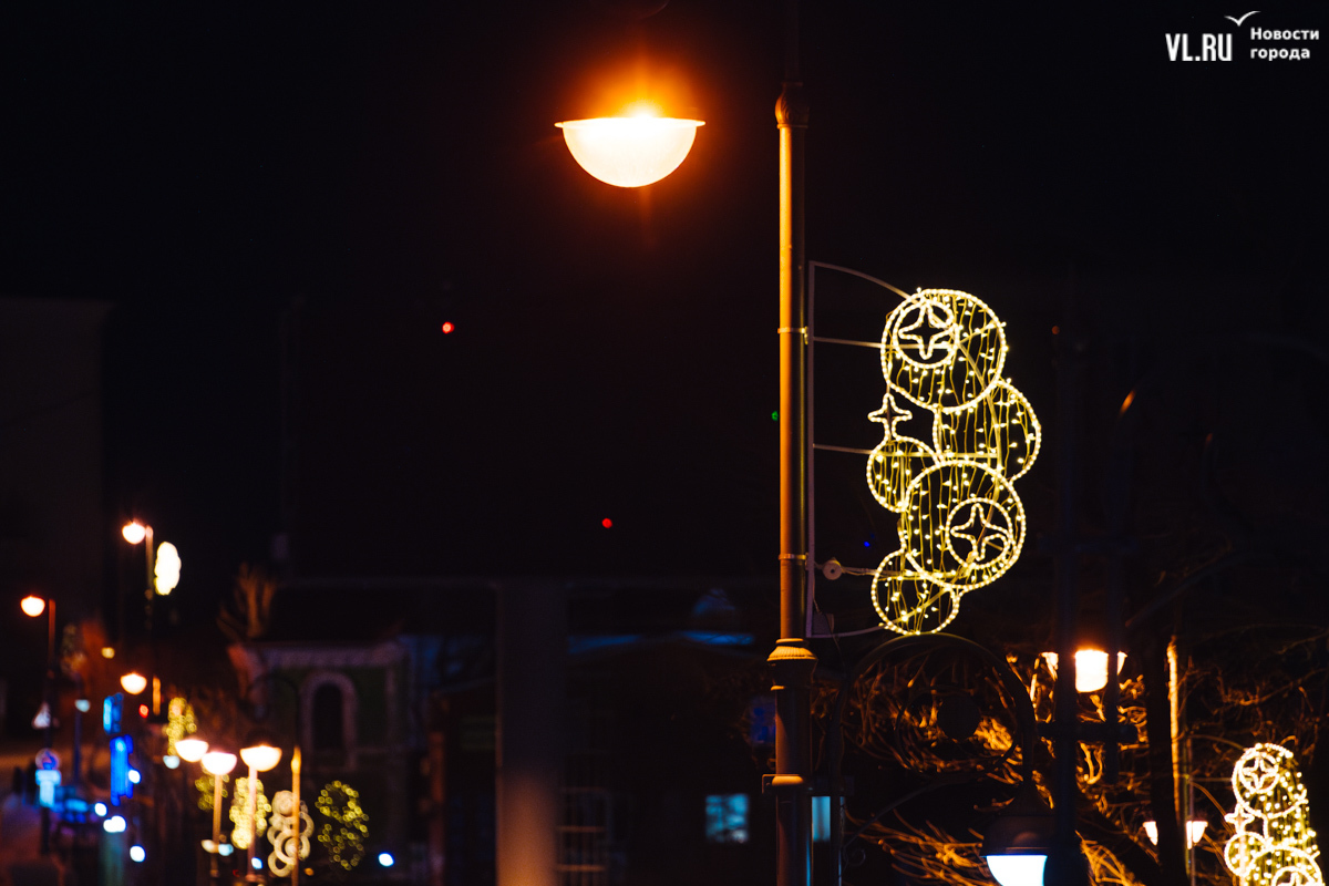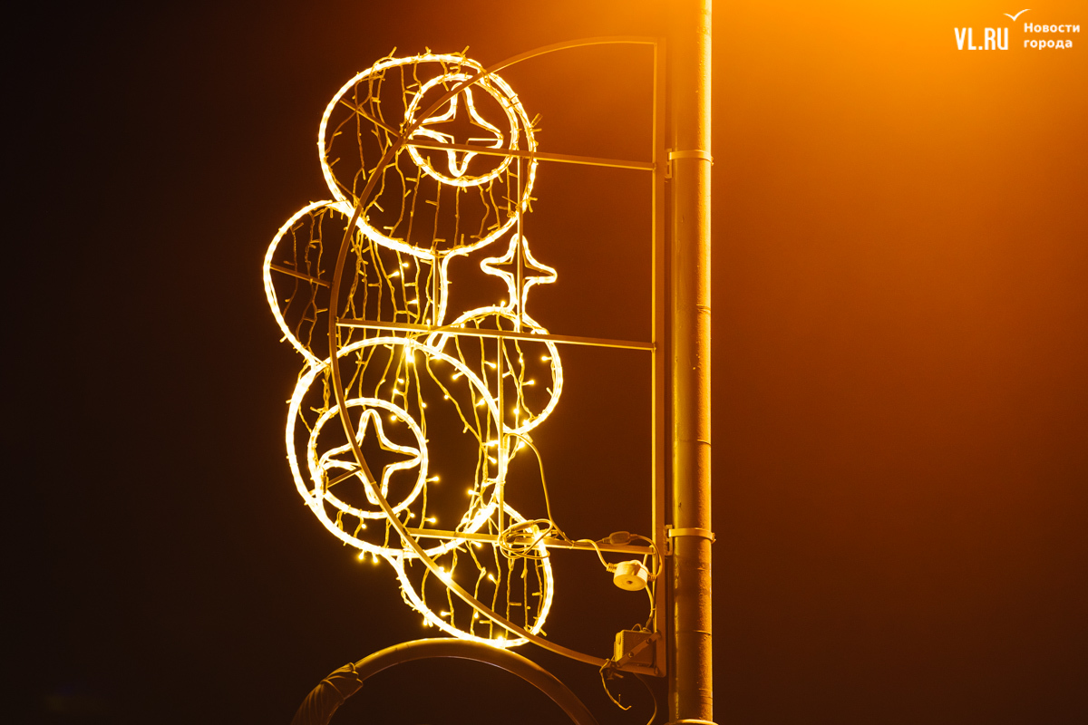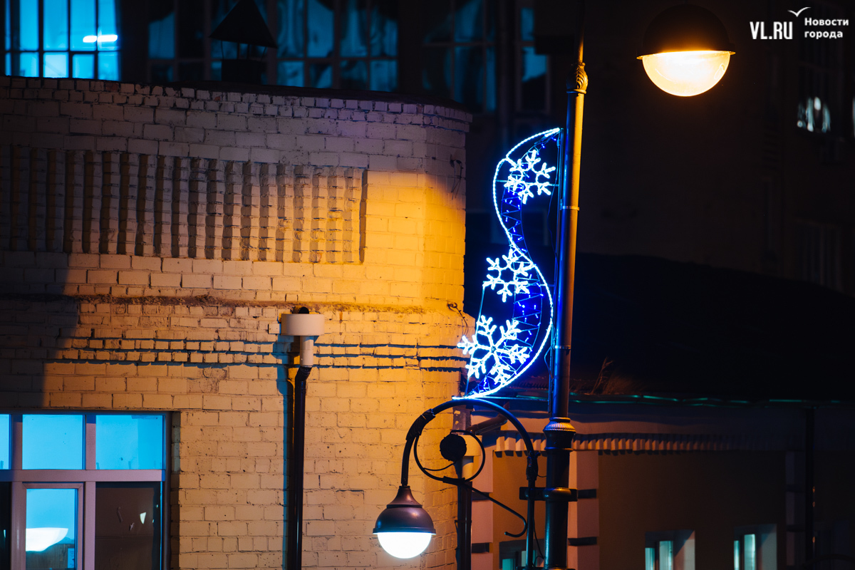 Отметим, что на двух формально главных городских улицах, Светланской и Океанском проспекте, украшения ещё пока не висят. В прошлом году на последнем монтировали пышные люстры, на Светланской устанавливали фигуры в форме ангелов и больших снежинок. Возможно, подобные украшения здесь появятся и в этом году.