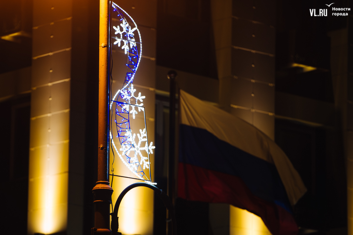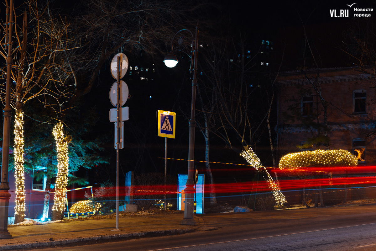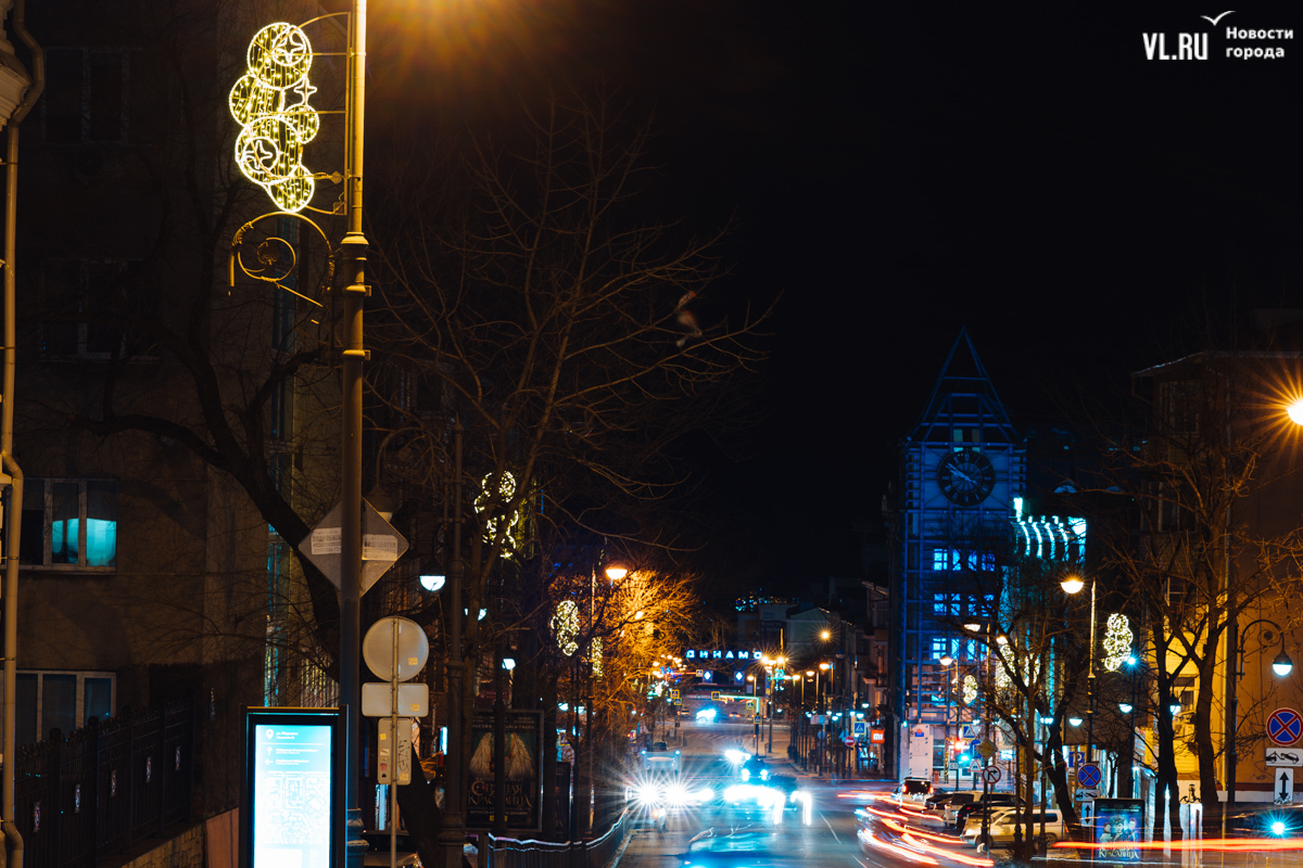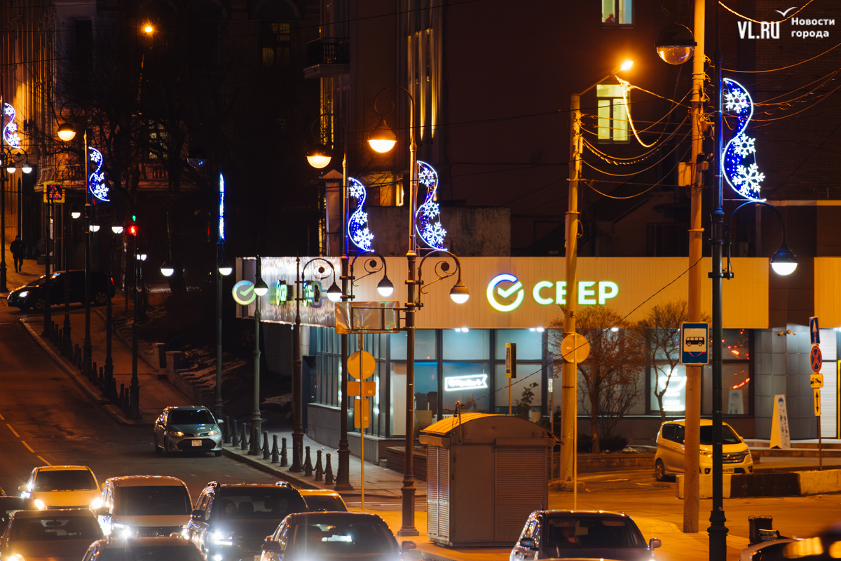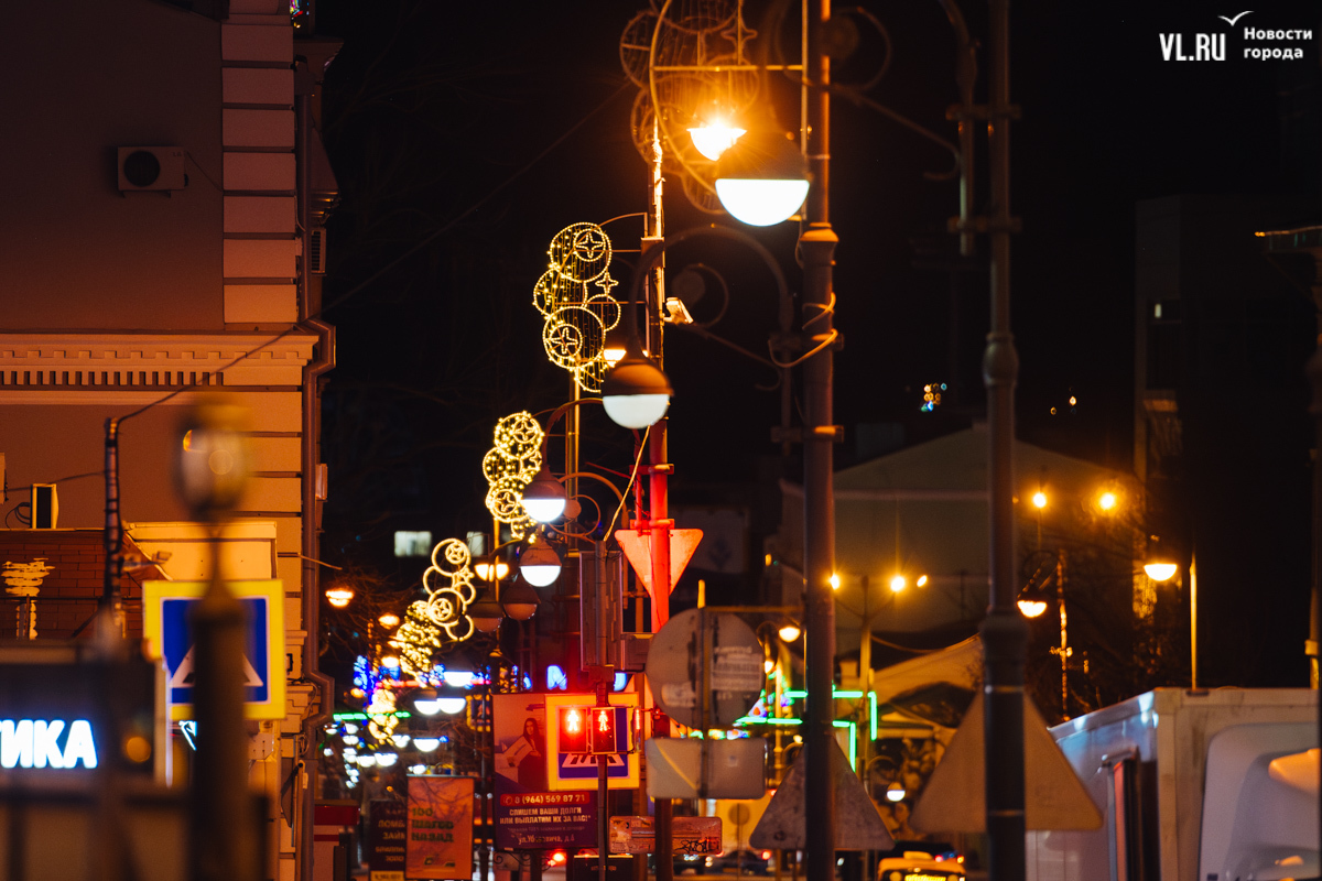 Отметим, что на двух формально главных городских улицах, Светланской и Океанском проспекте, украшения ещё пока не висят. В прошлом году на последнем монтировали пышные люстры, на Светланской устанавливали фигуры в форме ангелов и больших снежинок. Возможно, подобные украшения здесь появятся и в этом году.