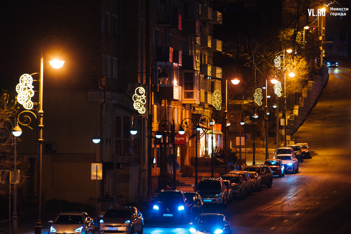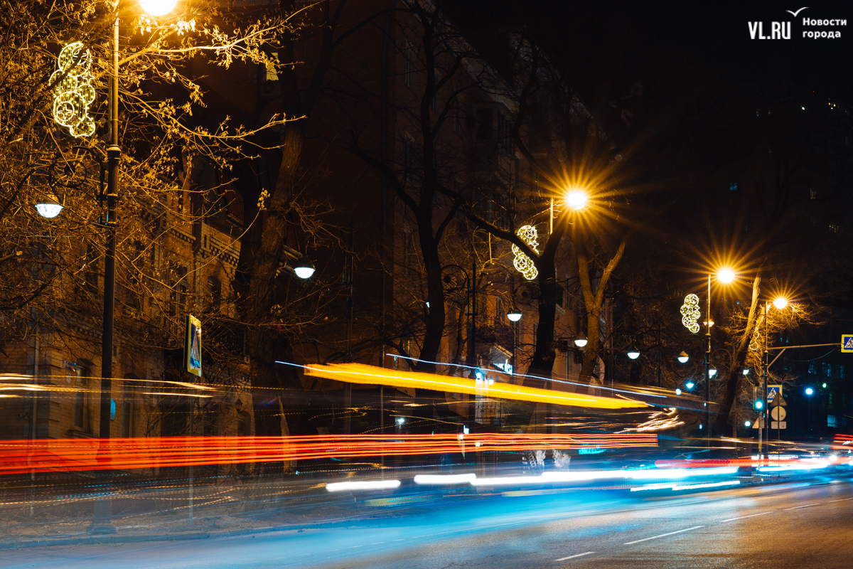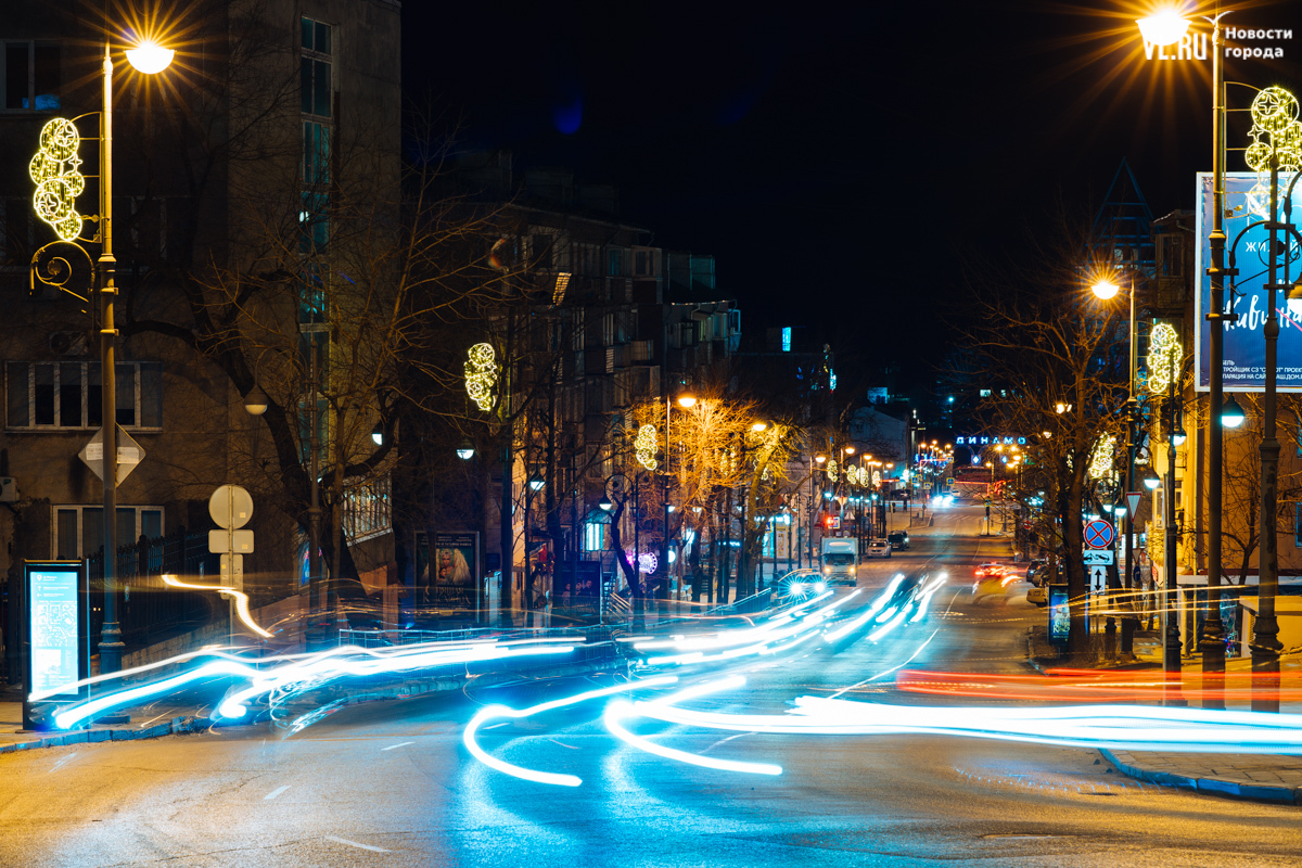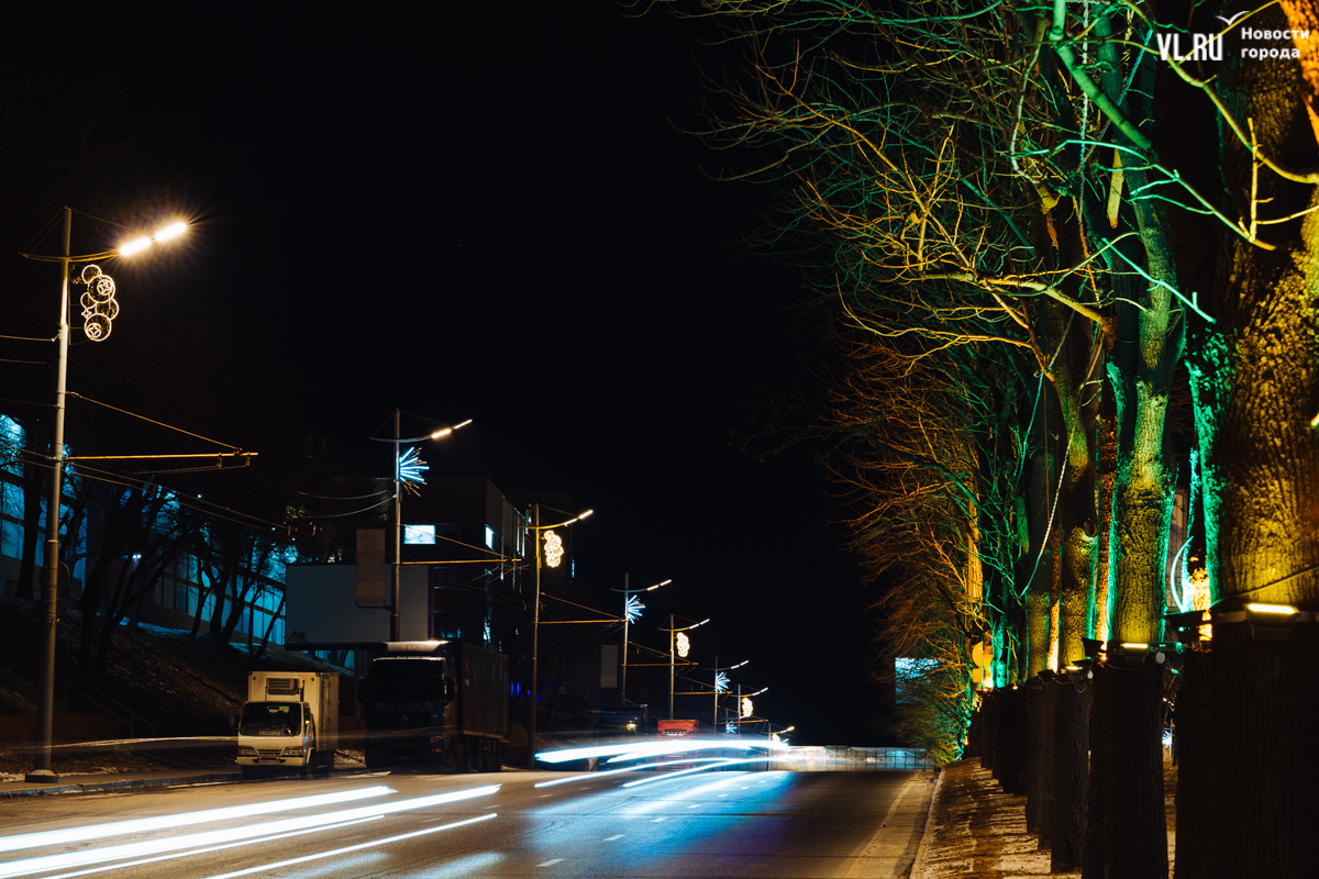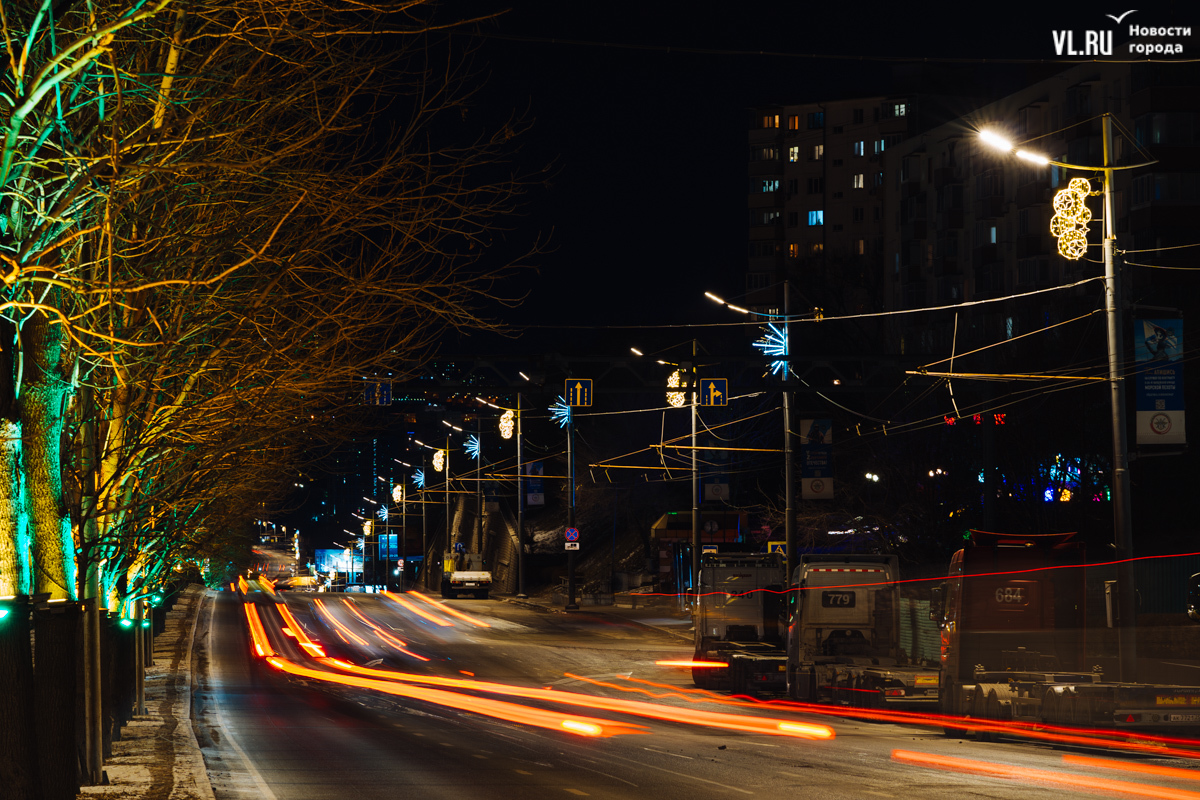 Одной из первых украсили самую загруженную городскую магистраль. На проспекте 100-летия Владивостока украшения вечером уже горят от одноимённой остановки до «Зари». Фигуры здесь чередуются – на одном столбе всегда сначала идёт композиция в виде пяти жёлтых шаров и трёх четырёхконечных звёзд. А следующее украшение – фигура синего цвета с небольшим вкраплением жёлтого, по виду это 7 сосулек.
