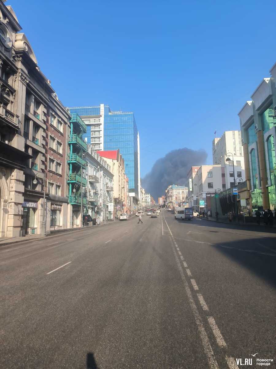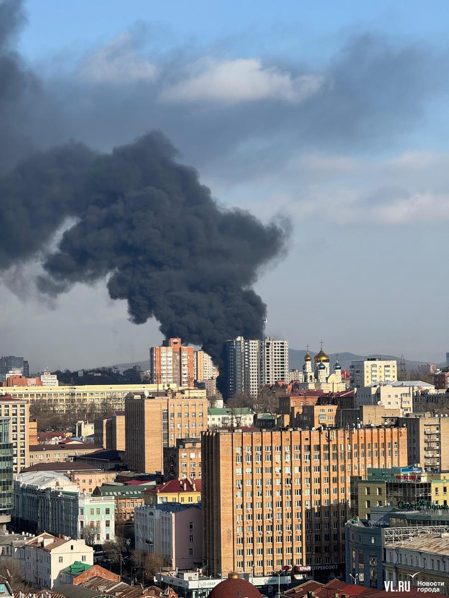 Клубы чёрного дыма поднимаются над городом и заметны из разных районов. Судя по всему, загорелись стройматериалы, которые находятся на крыше стилобатной части. Самих башен огонь, видимо, не коснулся.