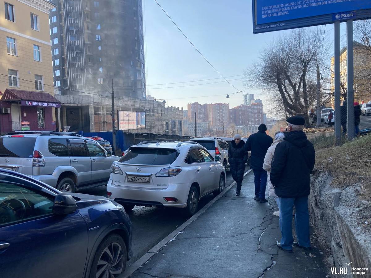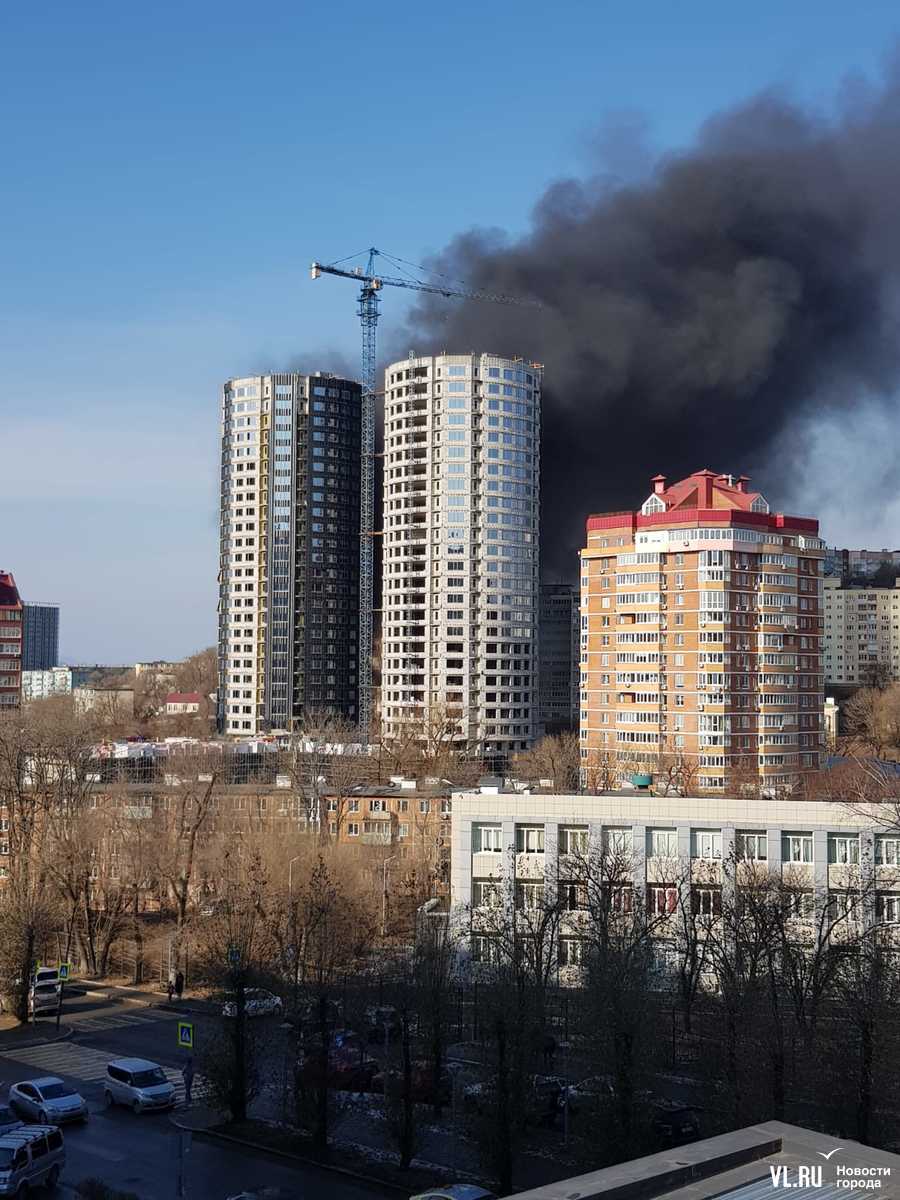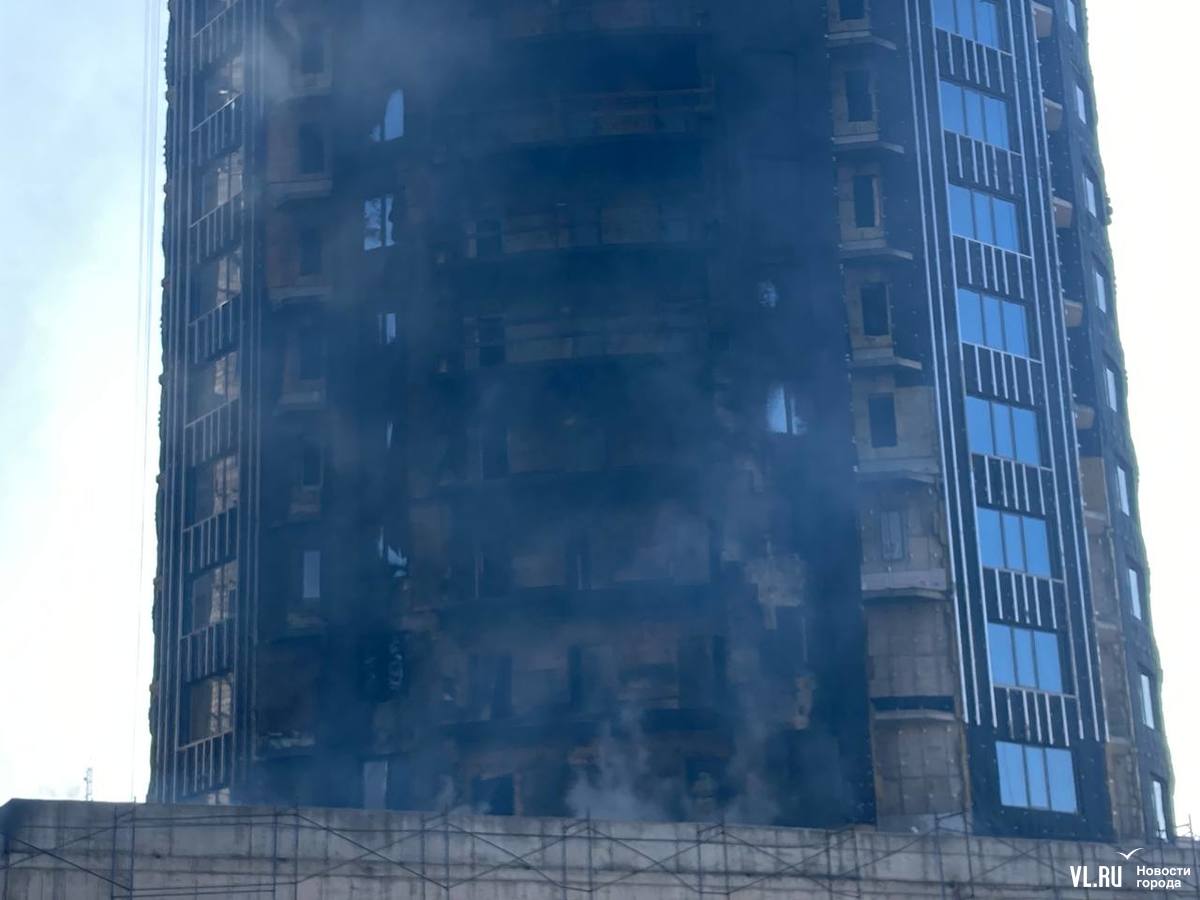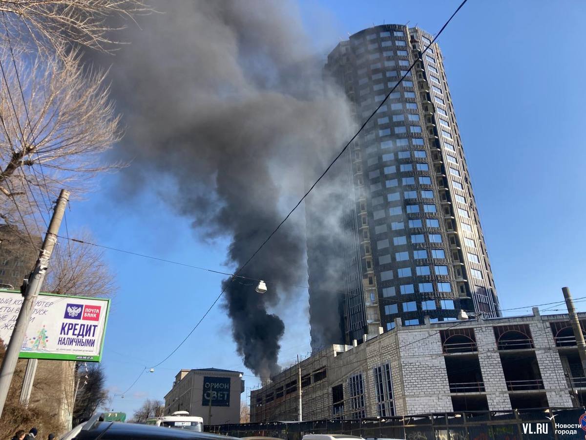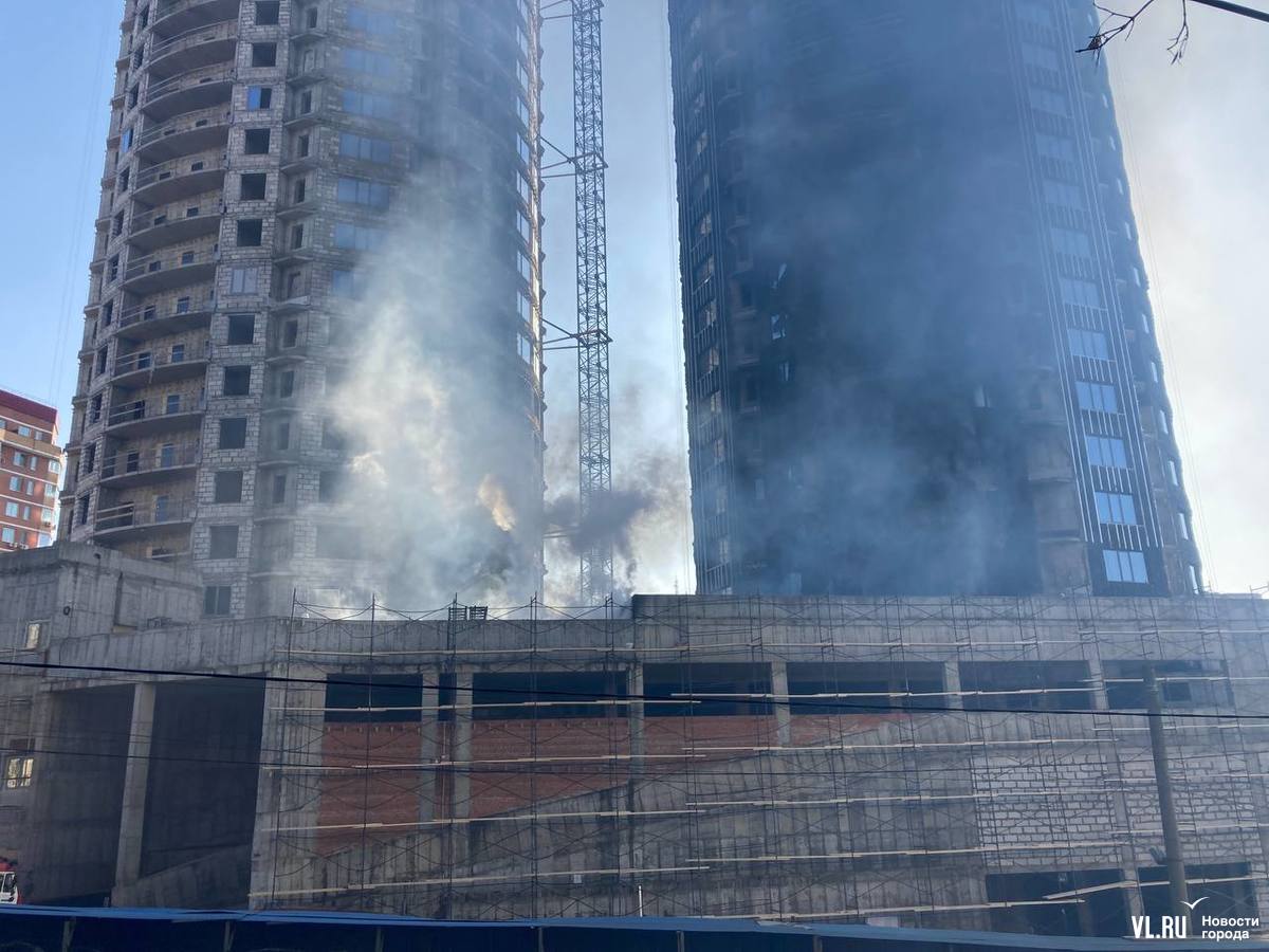 13:13: Как сообщает корреспондент Новостей VL.ru, пожарные машины уже прибыли на место. Причём они заехали прямо на крышу ещё не достроенного стилобата, на будущую эксплуатируемую кровлю. После начала тушения количество дыма уменьшилось, он стал белым. Когда открытое горение ликвидировали, пожарные стали ходить по этажам башен, проверять, не перекинулся ли огонь. Сами башни, возможно, не пострадали, но сейчас они все в саже.