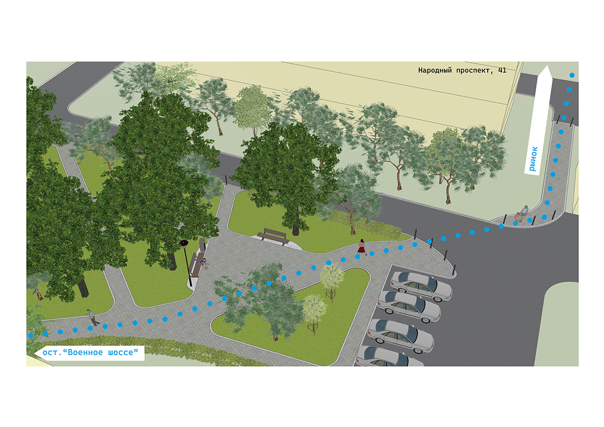 На пятом месте (1534 голоса) – проект обустройства пешеходной зоны рядом с остановкой «Военное шоссе». Пока что жители вынуждены пересекать сквер по камням, грязи, обходя припаркованные автомобили, местные активисты хотят это изменить. В рамках проекта на участке между Народным проспектом, 47 и 41 запланировано обустройство тротуара, высадка живой изгороди из 100 кустов пузыреплодника, установка 30 ограничительных столбиков, двух скамеек, одной урны и дополнительного освещения.