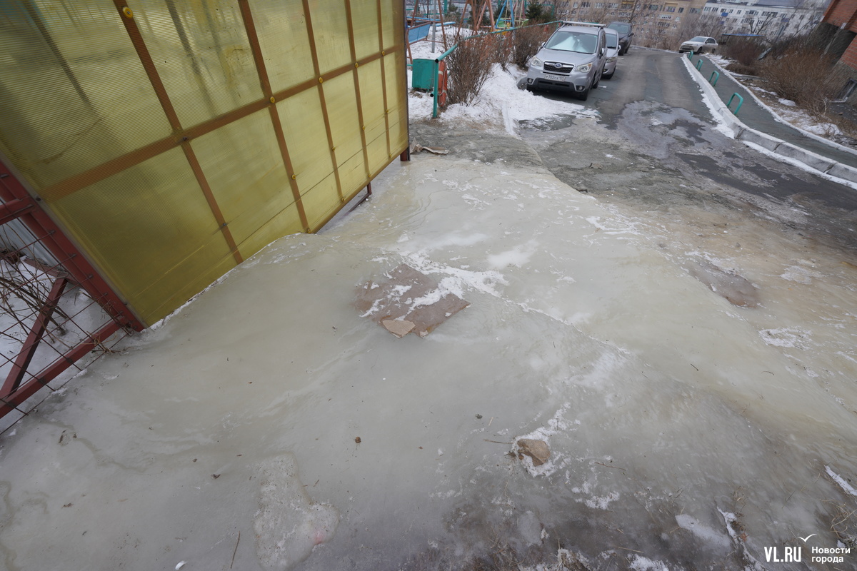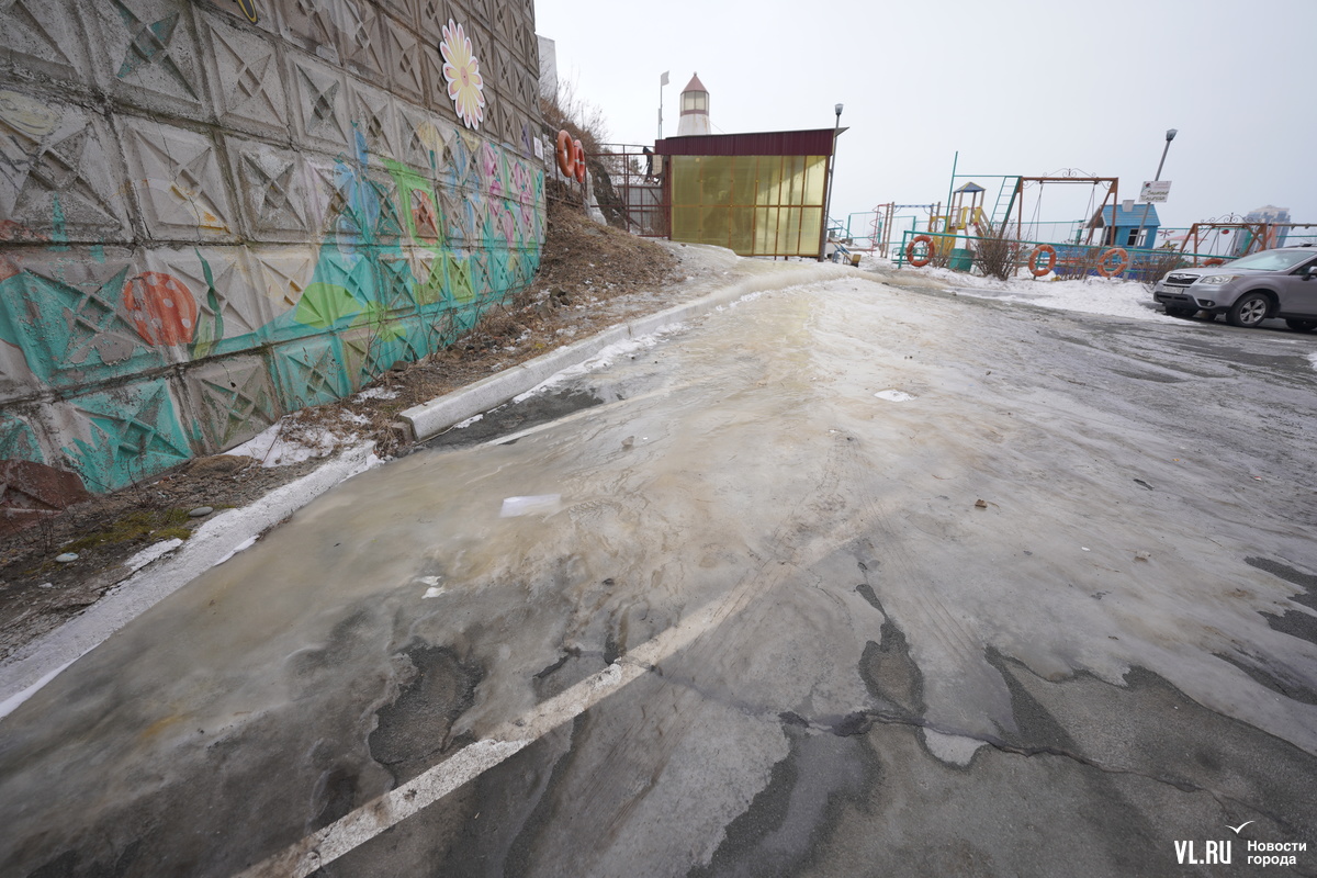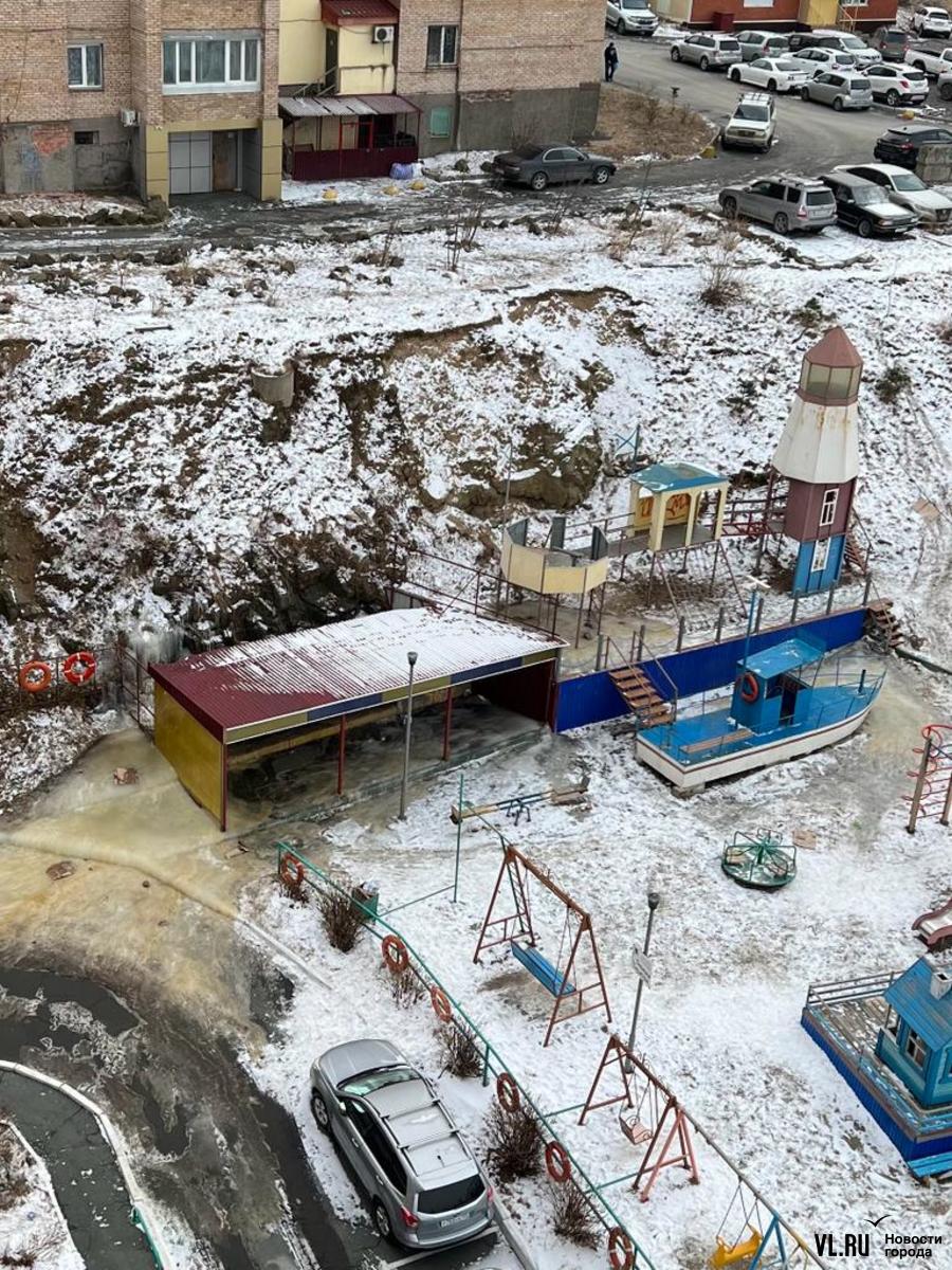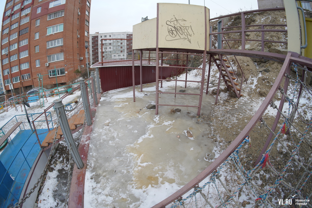 Читатели Новостей VL.ru сообщили о коммунальном происшествии на Толстого, 43а – детскую площадку здесь затопило фекалиями. По информации Примводоканала, заявка от горожан поступила 31 декабря, а устранить засор удалось только первого числа (мешали припаркованные рядом авто). На сегодня игровые конструкции вмёрзли в желтоватый лёд. При этом местные жители рассказали редакции, что канализация протекает здесь больше 10 лет из-за проблем в конструкции сетей.