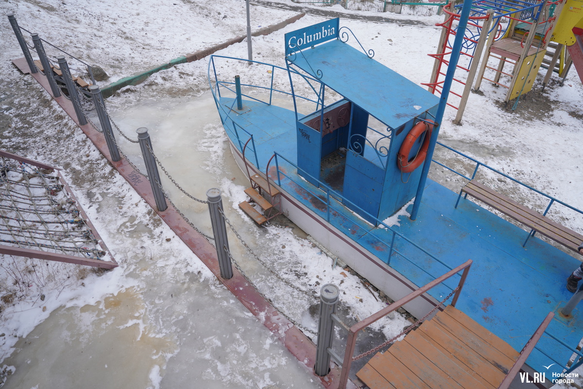 Как отмечают местные, зимой такое «лечение симптомов» не слишком эффективно – даже когда удаётся устранить течь, ближайшая детская площадка и придомовая территория надолго остаются покрыты антисанитарным льдом. Вот и на момент публикации, 4 января, жёлтые подтёки застыли вокруг конструкций площадки: играть можно разве что на приподнятом «мостке» и в башне-маяке, а небольшой катерок как будто отправляется в не слишком приятное плавание.
