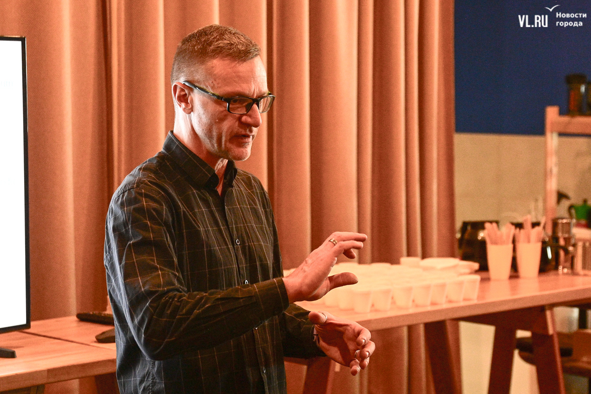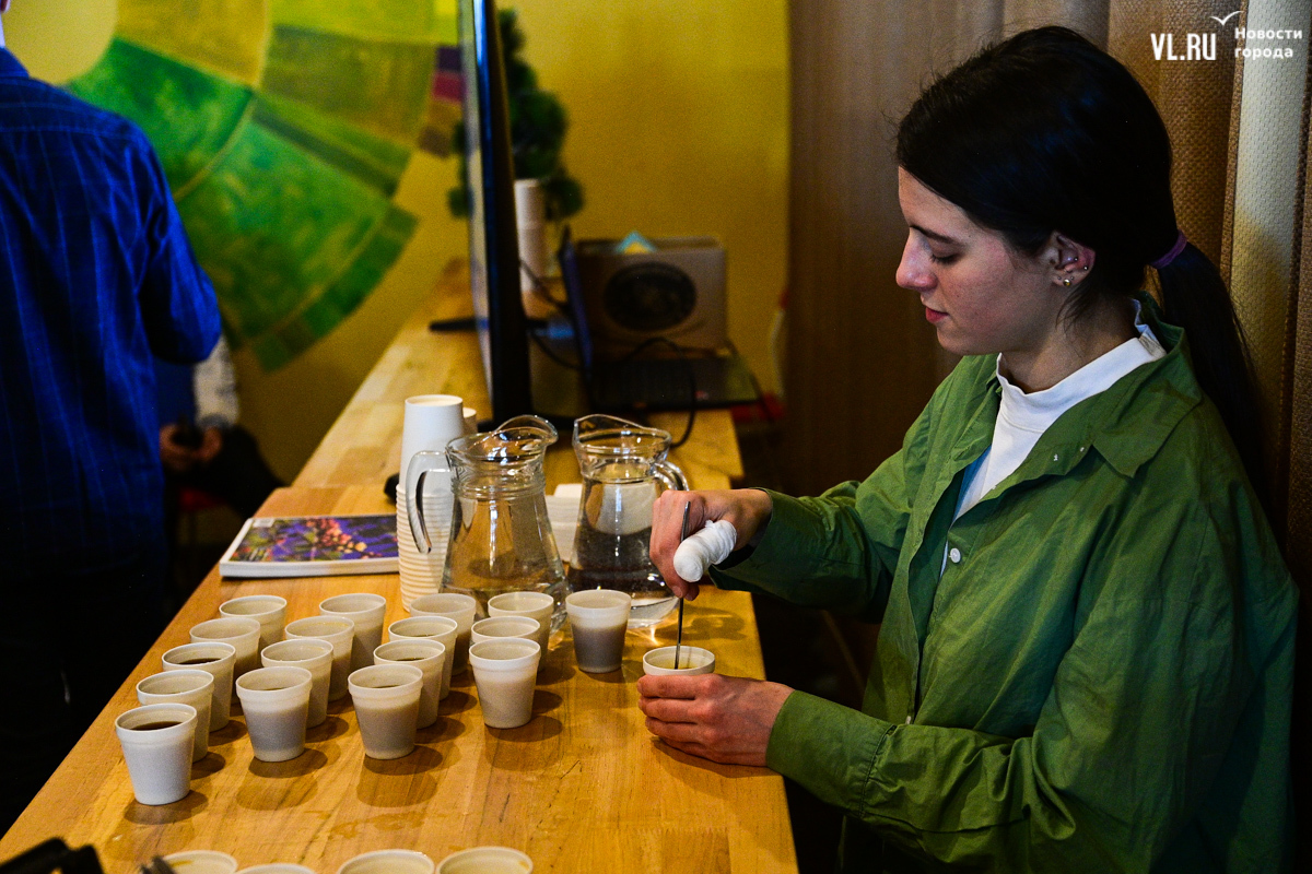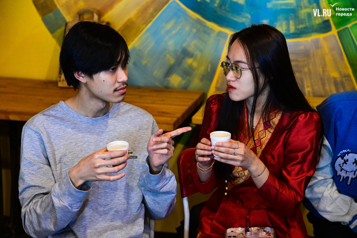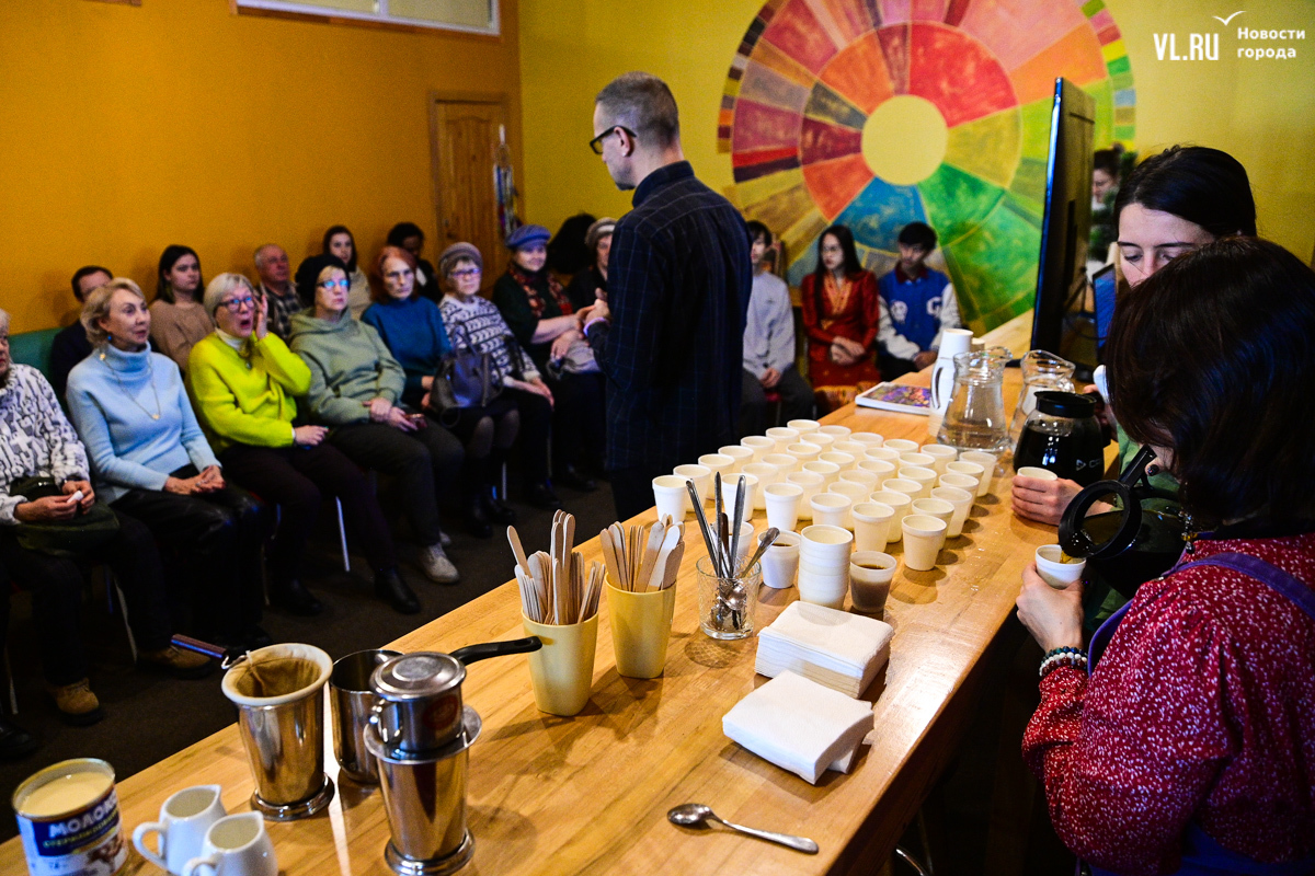 На лекцию пришли студенты из Лаоса. Вообще их во Владивостоке порядка сотни, а сегодня мероприятие посетили трое. Молодые люди изучают экономику в ВВГУ, рассказывают, что в их стране существует большой интерес к России и её языку, примером этого служит президент Лаоса Тхонглун Сисулит, который учился в Ленинграде и свободно говорит по-русски (как и все его министры). Русский язык в стране преподают в двух школах, но пришедшие на лекцию студенты его пока только осваивают. На их родине кофе варят в полотняных мешочках, сцеживают и щедро сдабривают сгущённым молоком. Хотя, говорит кофе-тренер «Кафема» Евгений Щукин, в Лаосе сейчас полно кофеен, где напиток без оглядки на традиции готовят в кофемашинах.