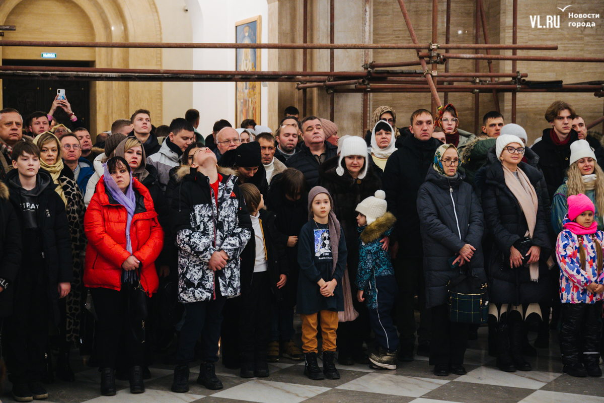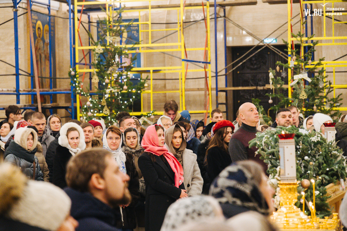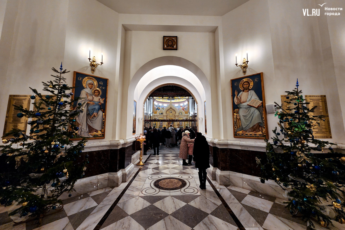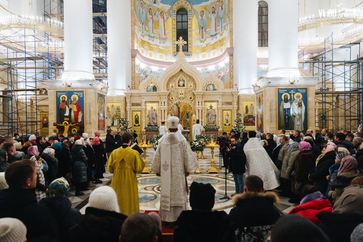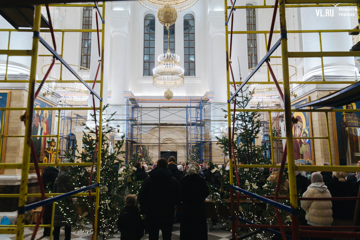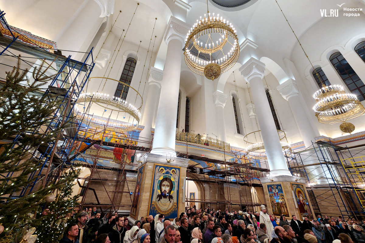 В ночь с 6 на 7 января в храмах Приморья прошли рождественские литургии. Пожалуй, больше всего людей собралось в самом крупном, Спасо-Преображенском кафедральном соборе во Владивостоке, который вмещает до 3000 человек. Это первая рождественская служба в храме – его официально открыли в августе прошлого года. А сейчас внутренний периметр вновь укрыт строительными лесами – иконописцы расписывают стены.