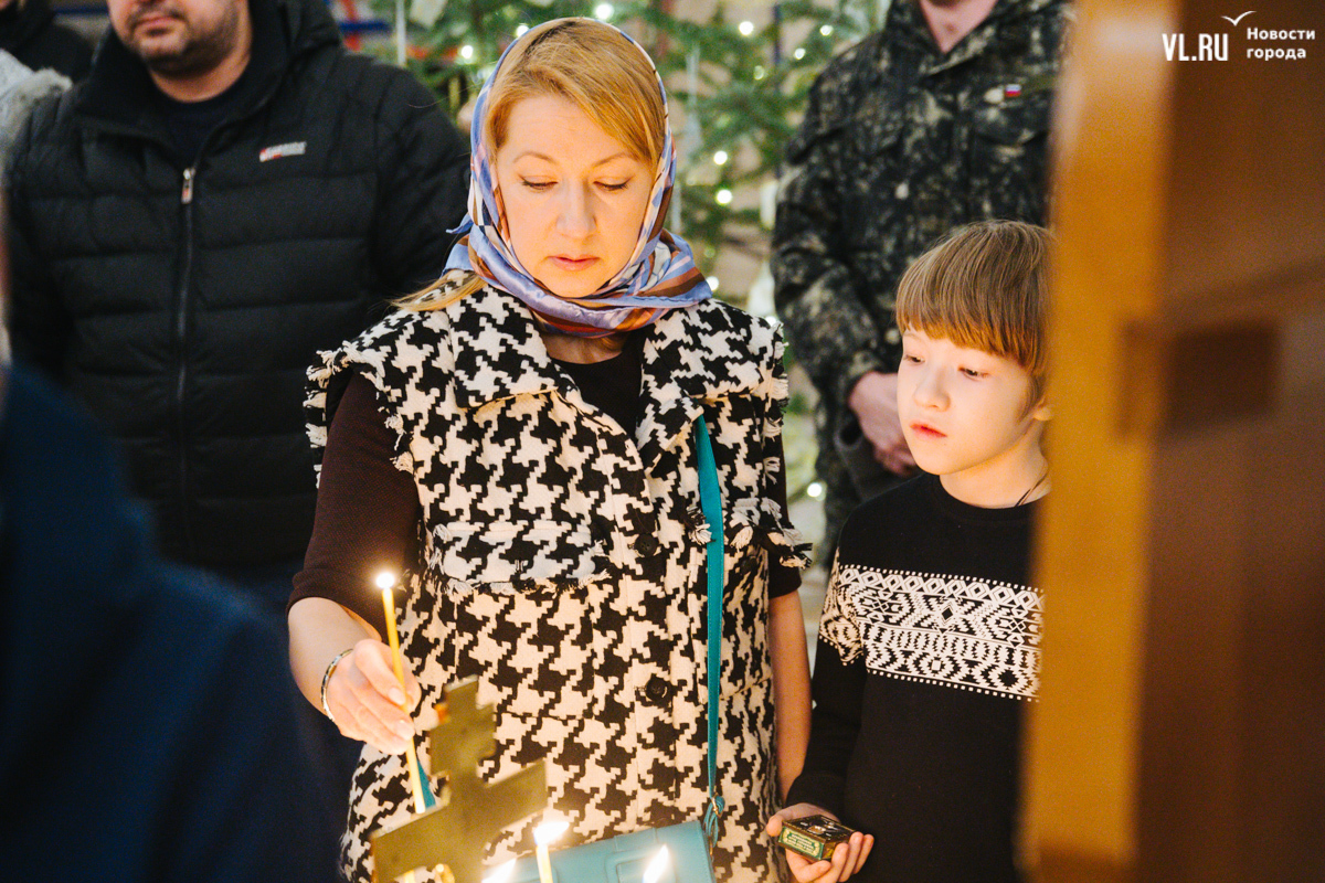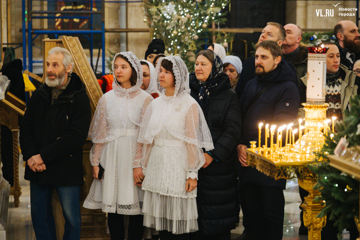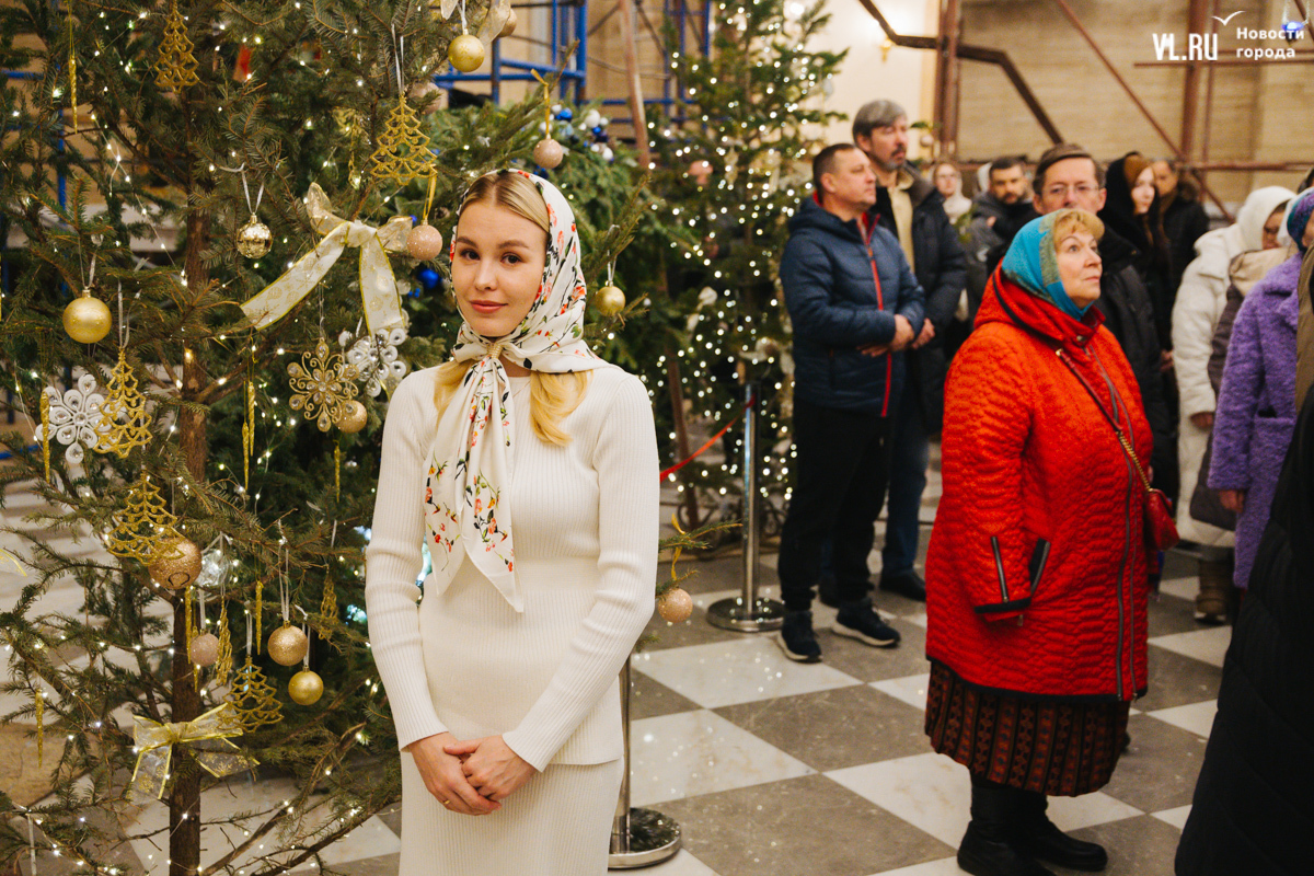 Литургия получилась многолюдной, но без ощущения скученности, тесноты и духоты. Собор может вместить до 3000 человек, он самый крупный в Приморье. Евгения тоже рассказывает, что здесь спокойно и хорошо дышится. С дочерьми-близняшками Серафимой и Софией она приехала на службу с Русского острова. И у них 6 января даже не двойной, а тройной праздник: кроме Рождества, именины Евгении по церковному календарю и день рождения девушек, которые выбрали для храма белые одежды.