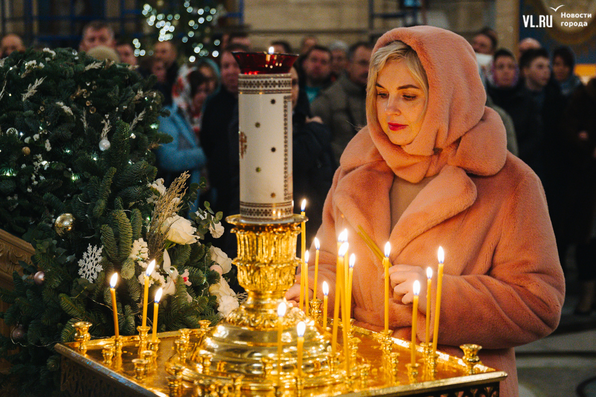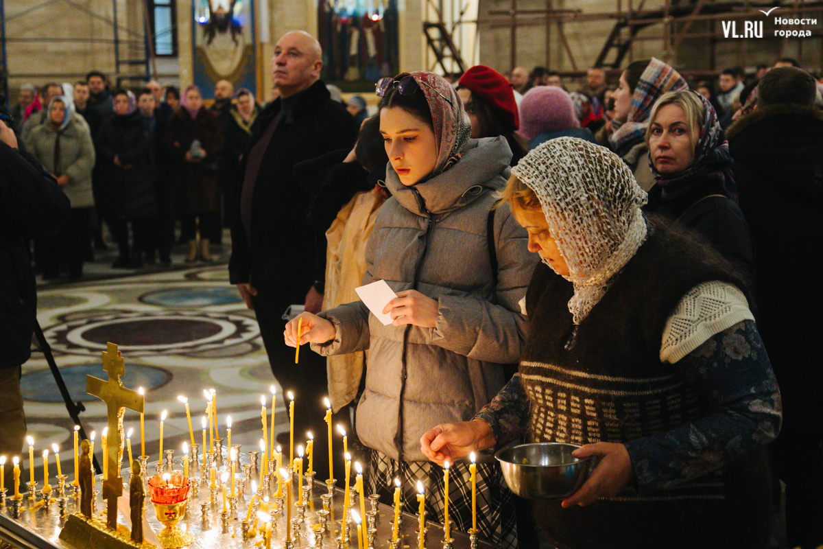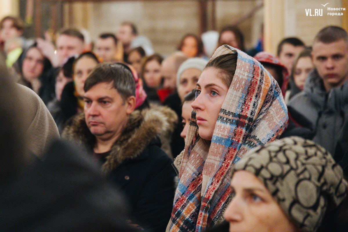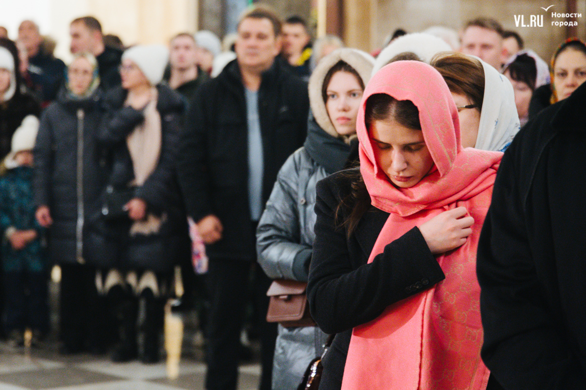 Литургия получилась многолюдной, но без ощущения скученности, тесноты и духоты. Собор может вместить до 3000 человек, он самый крупный в Приморье. Евгения тоже рассказывает, что здесь спокойно и хорошо дышится. С дочерьми-близняшками Серафимой и Софией она приехала на службу с Русского острова. И у них 6 января даже не двойной, а тройной праздник: кроме Рождества, именины Евгении по церковному календарю и день рождения девушек, которые выбрали для храма белые одежды.