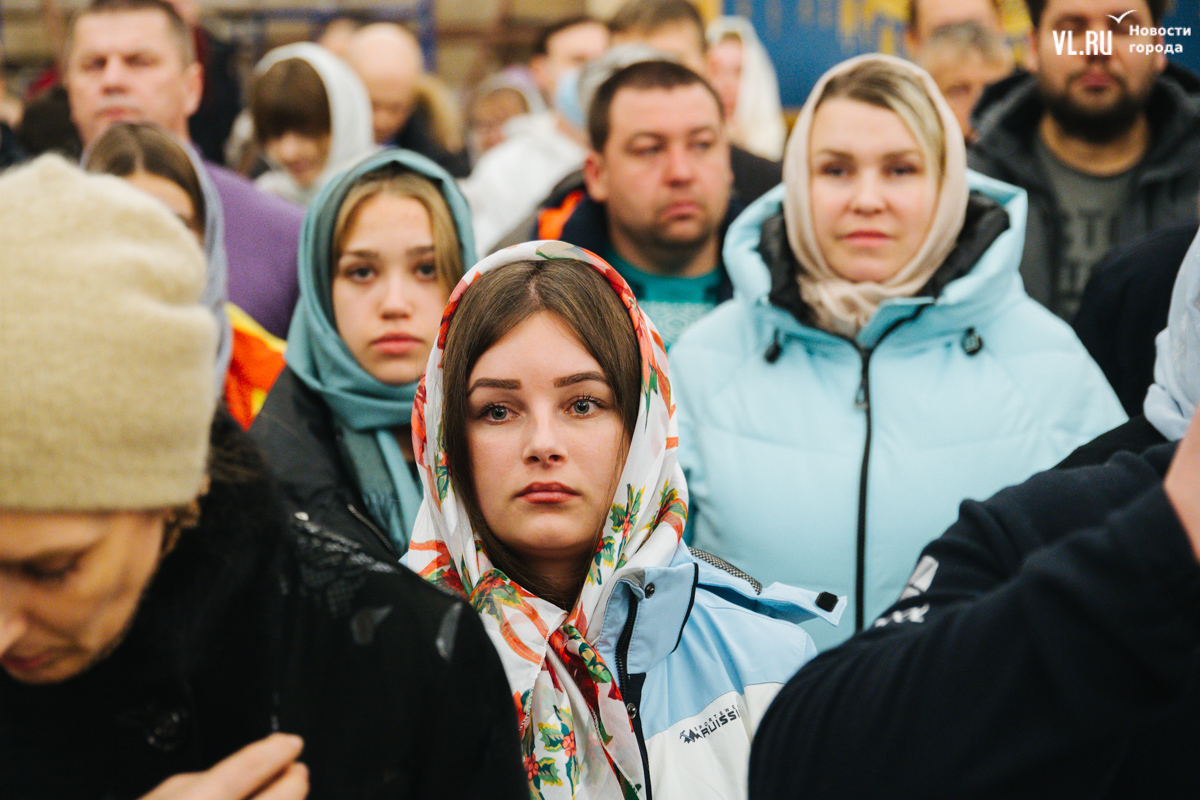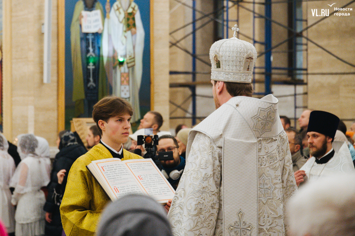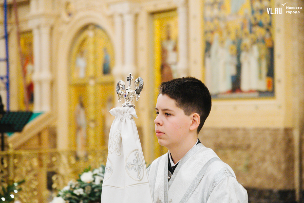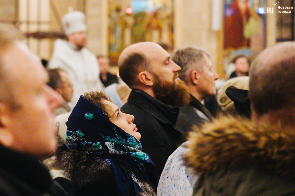 Литургия началась ближе к полуночи. Сначала – молитвы, которые читали на хорах, на уровне второго этажа. Звук достигал любого уголка – здесь хорошая акустика. Храм затемнён, горят свечи и часть подсветки. Через некоторое время включается полный свет, и он заливает огромный зал. Звучит хор, певцы уходят на крещендо, и к людям из алтаря в сопровождении представителей духовенства спускается митрополит Владивостокский и Приморский Владимир. Сегодня все в белом облачении, символизирующем Божественный свет.