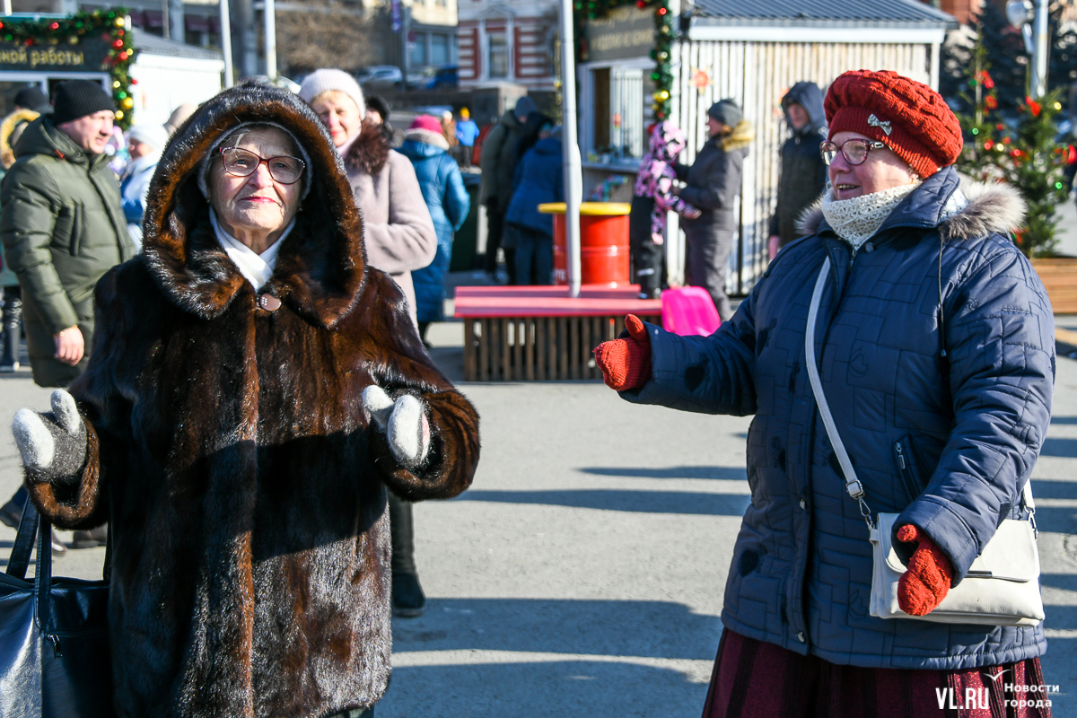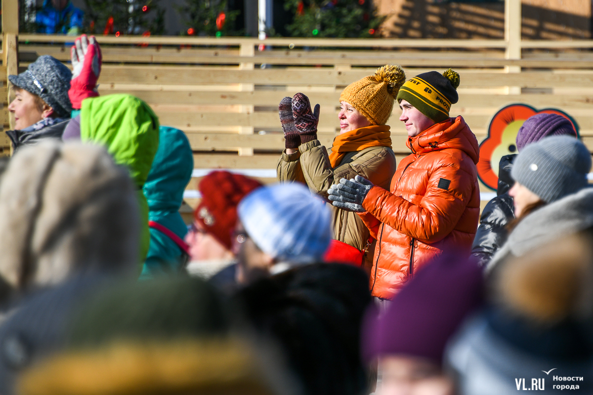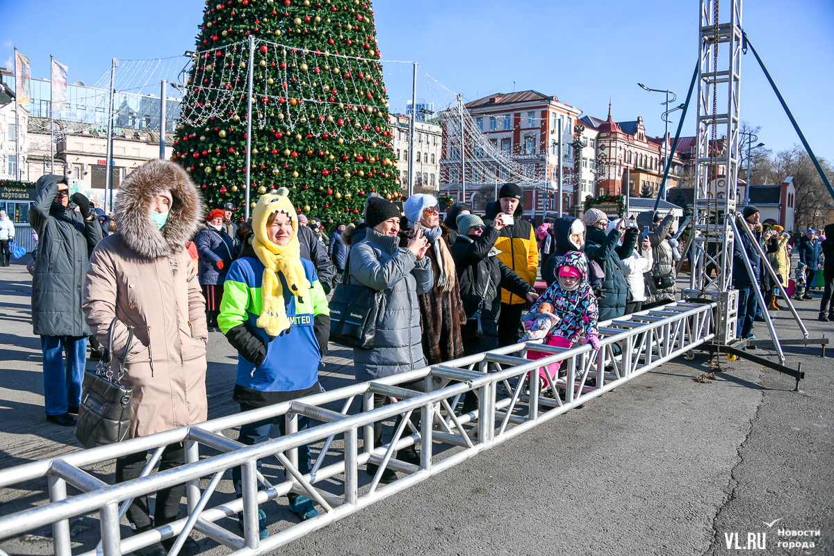 Рождество пришло во Владивосток вместе с похолоданием и порывистым ветром. Возможно, поэтому на площади было не так многолюдно, как всю прошлую неделю. И всё же погода не помешала жителям и гостям города отметить один из главных христианских праздников вне дома. Частично по периметру площади всё ещё стоит забор, но никаких контролей проходить не нужно.