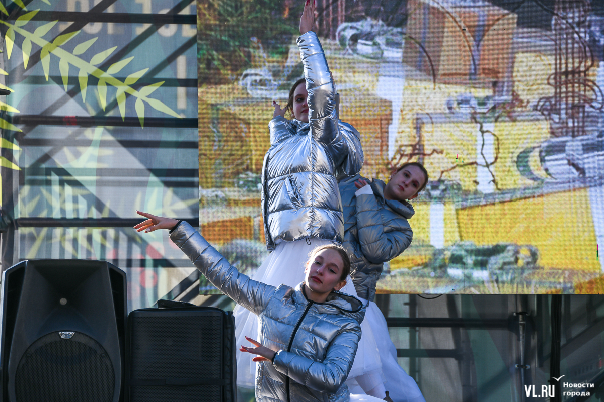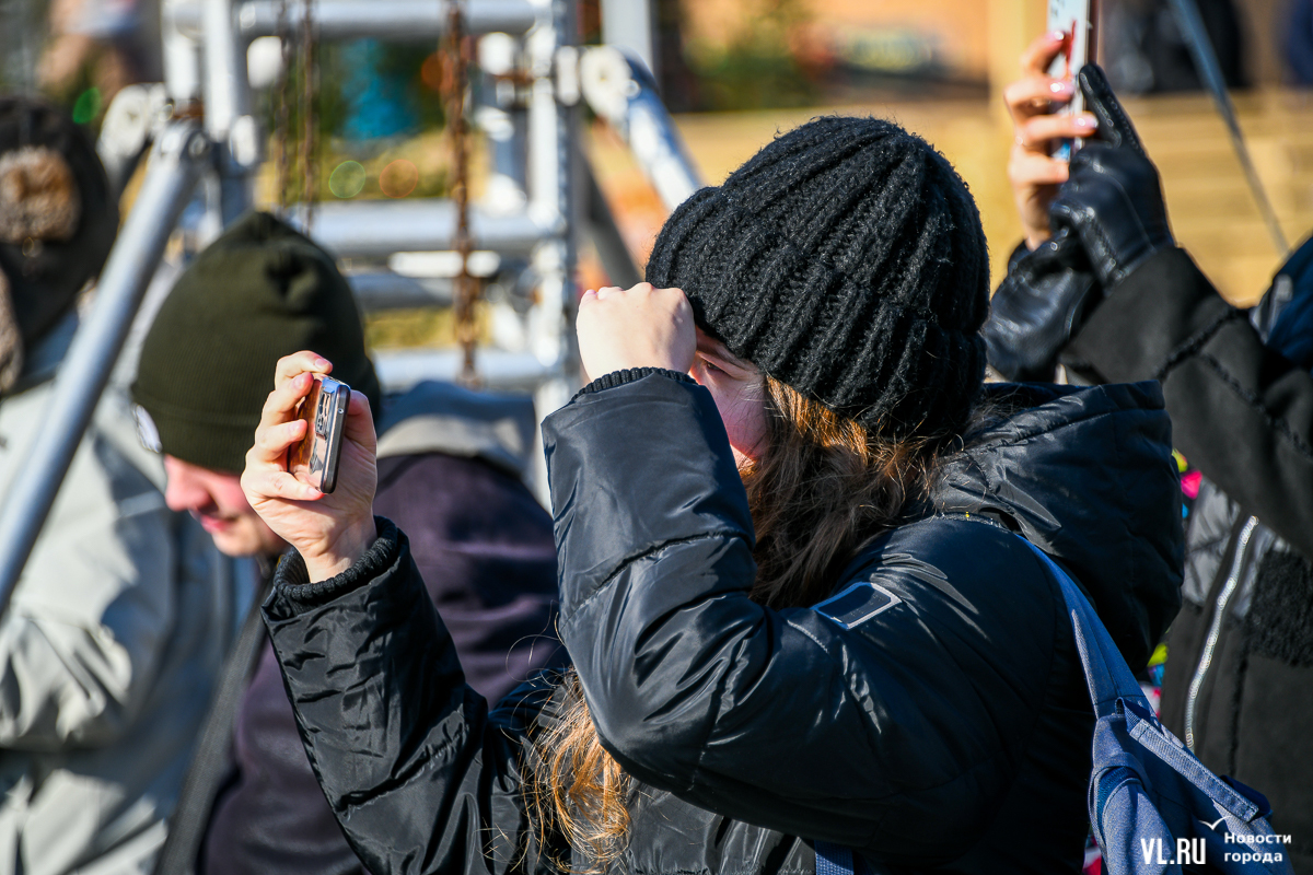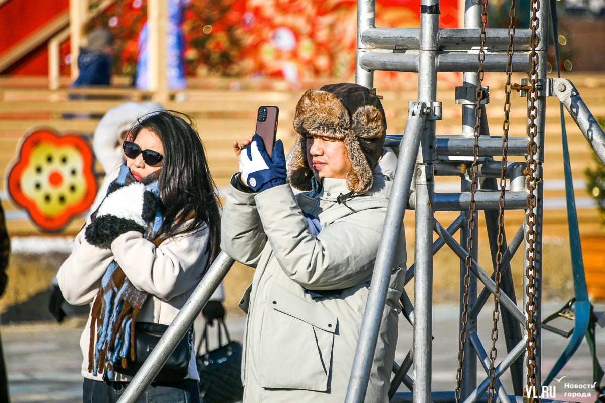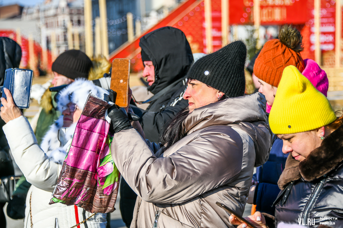 Рождество пришло во Владивосток вместе с похолоданием и порывистым ветром. Возможно, поэтому на площади было не так многолюдно, как всю прошлую неделю. И всё же погода не помешала жителям и гостям города отметить один из главных христианских праздников вне дома. Частично по периметру площади всё ещё стоит забор, но никаких контролей проходить не нужно.