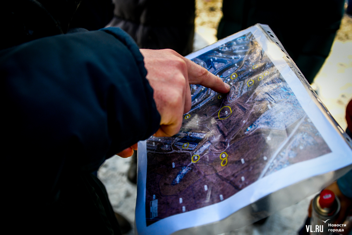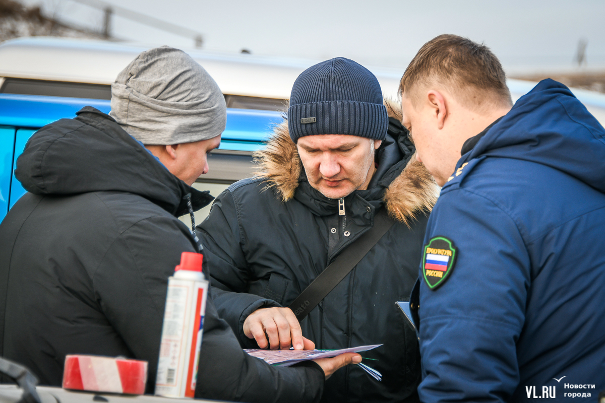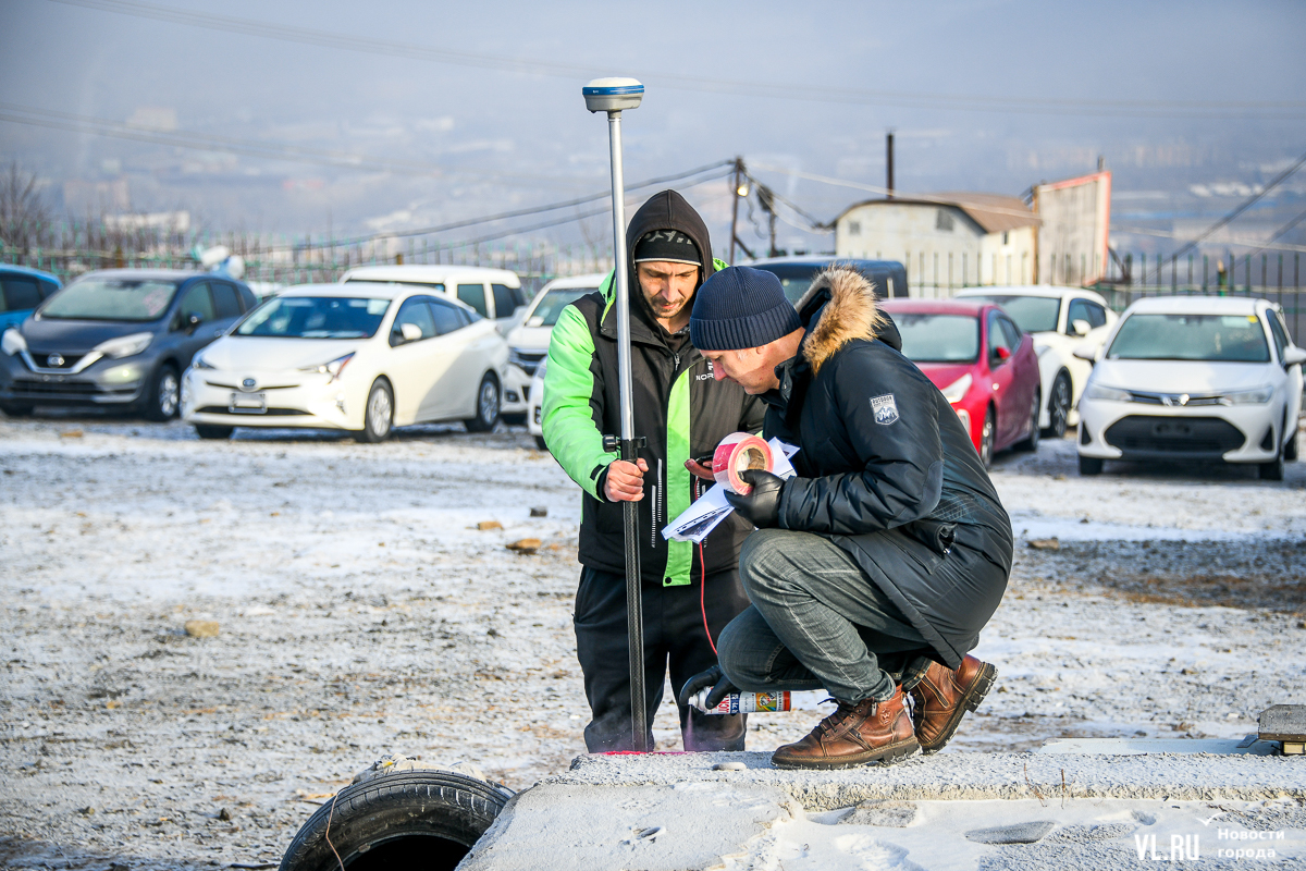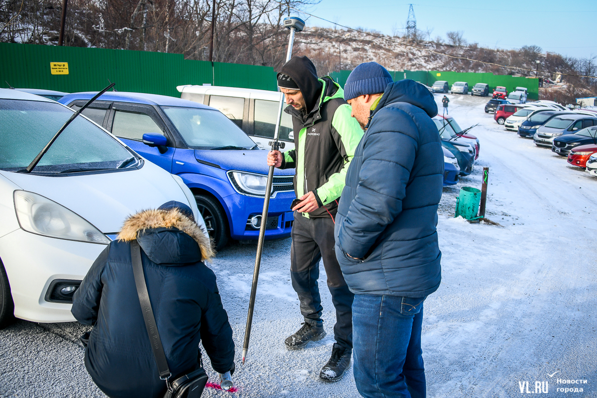 Следующими стали участки 25:28:010043:24 и 25:28:010043:35, и уже здесь начался ажиотаж, потому что все они были заняты машинами, а приезда эвакуаторов никто не ожидал. Однако сначала сотрудники мэрии прошлись по всей стоянке с измерительными приборами и отметили красными крестиками границы этих участков. Оказалось, что под запрет попадают далеко не все машины, а всего несколько рядов, машин 100 или меньше. И даже в пределах одной стоянки находились «безопасные» места. Например, муниципальный участок, судя по меткам, не дотянул до забора возле дороги. И к нему тут же рядком выстроили пару десятков машин.
