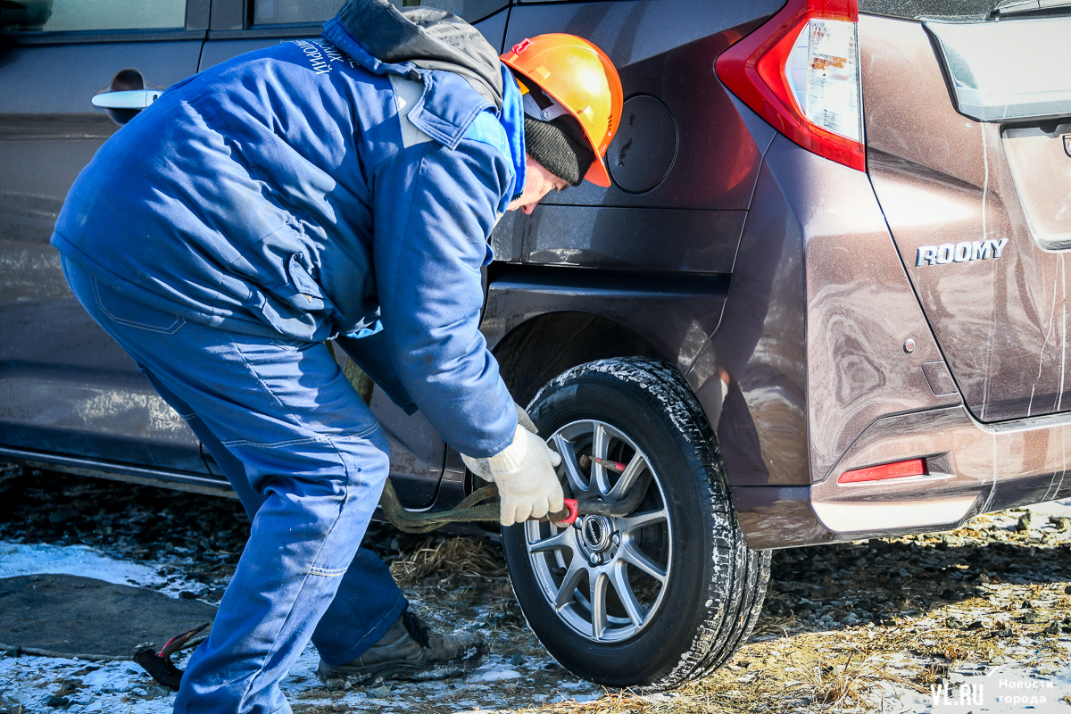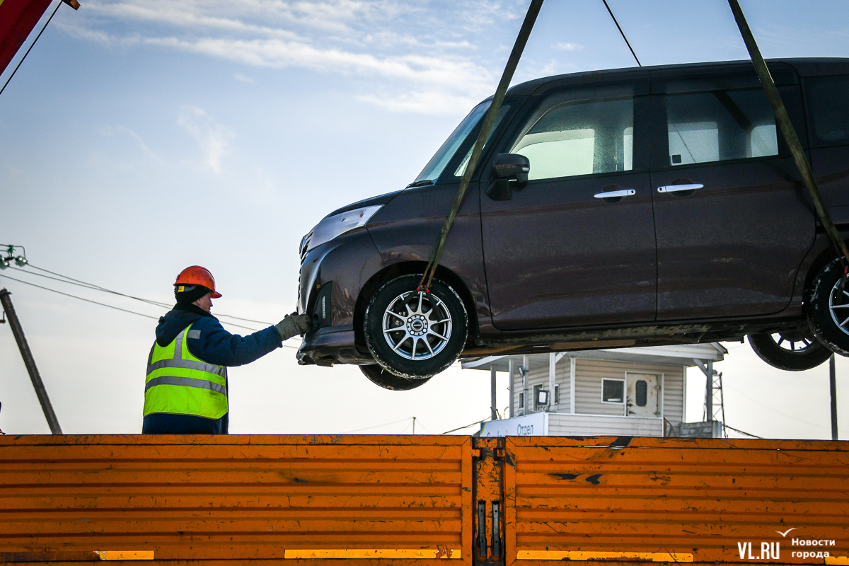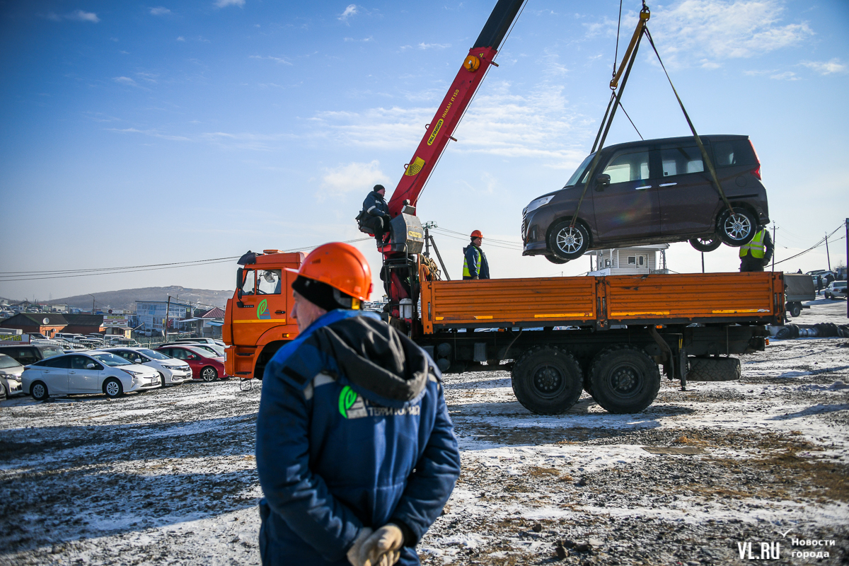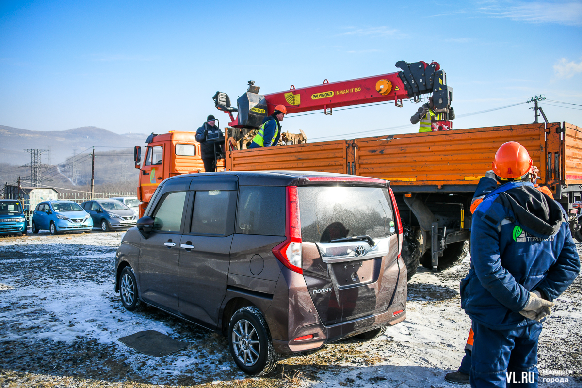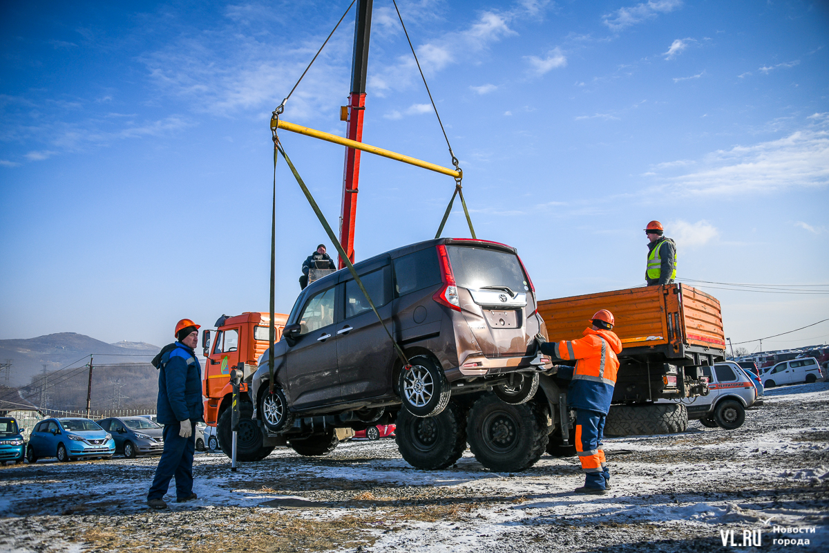 Примерно через час на стоянке машин почти не было, не считая личных авто бизнесменов, которые приехали забрать колёса и прочее имущество. Казалось бы, КамАЗу городской службы и не придётся работать. Чтобы заехать на стоянку, ему пришлось убирать бетонные блоки с проезда, но теперь огромная машина стояла посреди почти пустой площадки. Однако одна жертва всё же нашлась: небольшую Toyota Roomy вовремя не отогнали, и вот уже её подцепляют и ставят в кузов. Но в следующее мгновение возвращают на землю – явился хозяин, а по закону машину нельзя увозить. Хозяин сам её убрал.