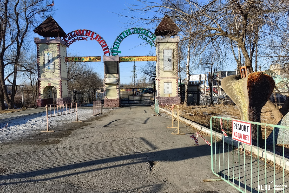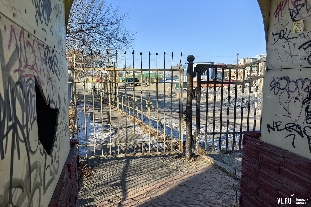 О парке «Фантазия» напоминают только ворота – одни вели через рынок, для пешеходов. Они закрыты на замок. Вторые, со стороны проспекта 100-летия Владивостока, уже изрядно потрёпанные и поломанные, теперь вместо парковки ведут на стройку. Но зато, наверное, ни на один строительный участок в городе больше нет проезда через «караульные башни замка».