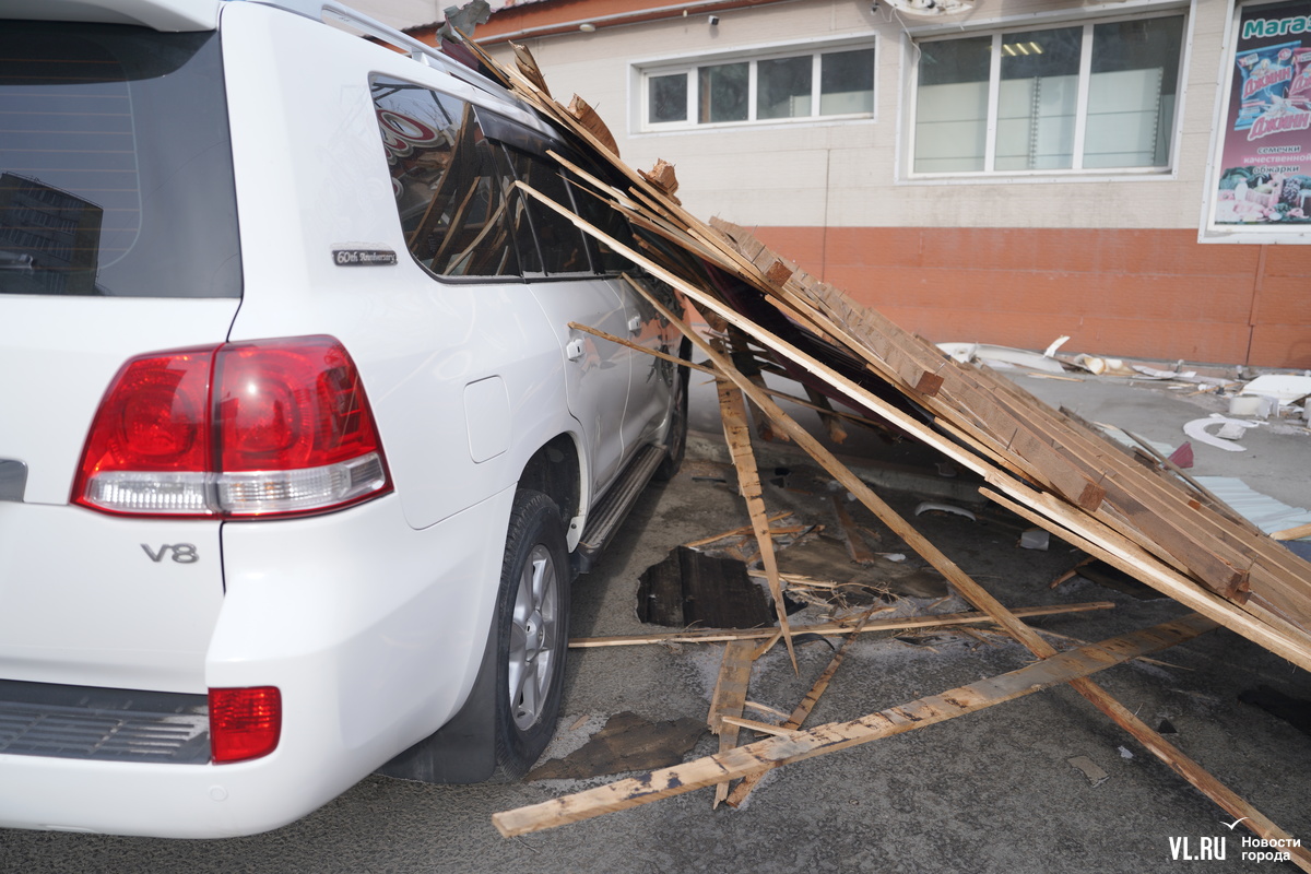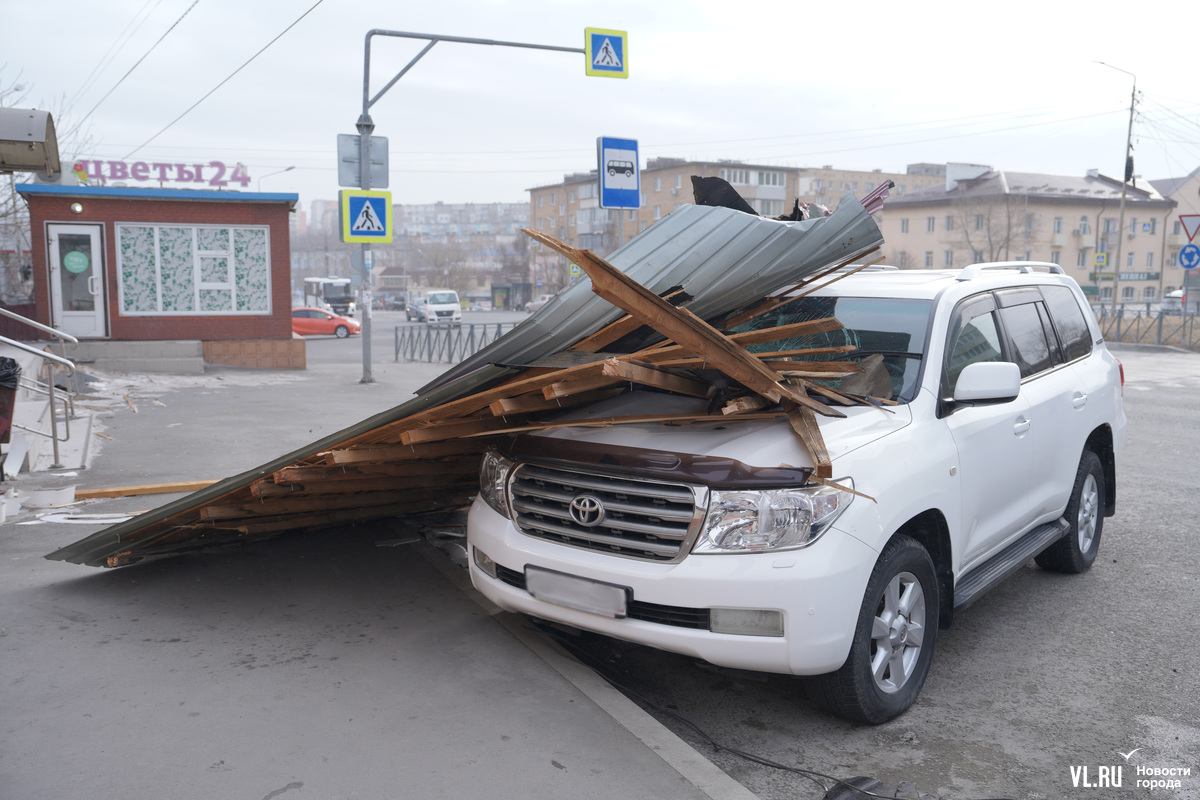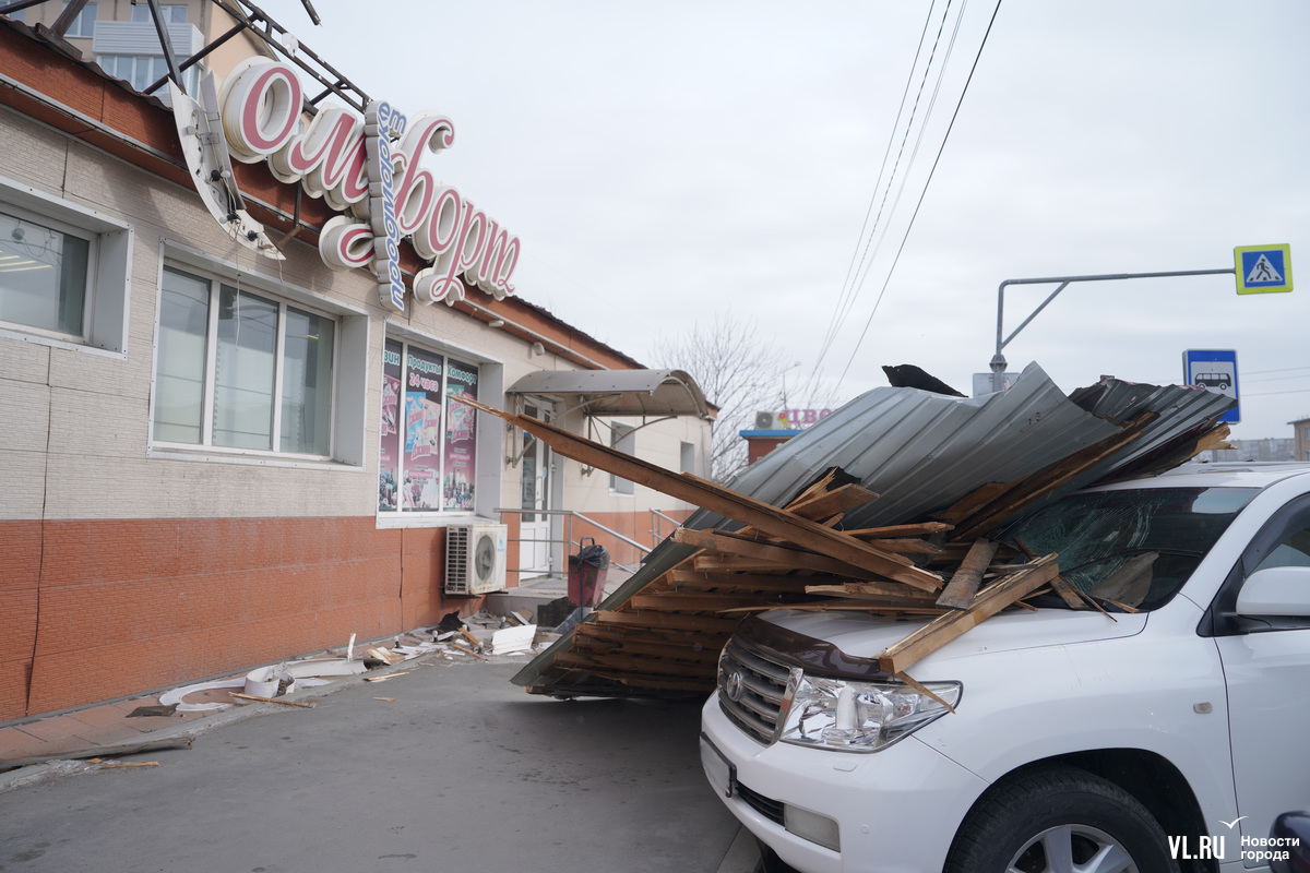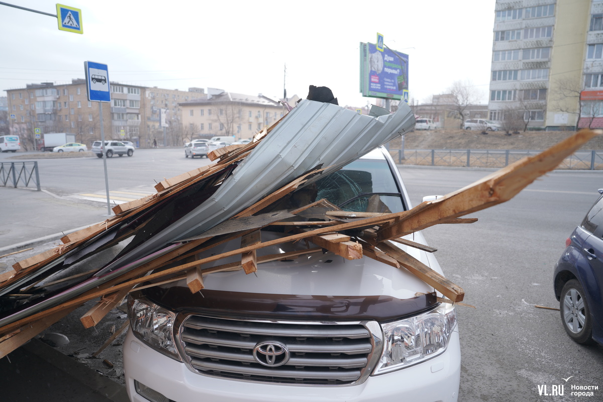 Ранее синоптики передавали, что на побережье порывы ветра будут достигать 23-30 м/с. Похоже, что на деле они во Владивостоке ещё выше. В соцсетях появились видео, как на Запорожской ветер срывает кровлю с магазина «Комфорт», куском повредило Toyota Land Cruiser.