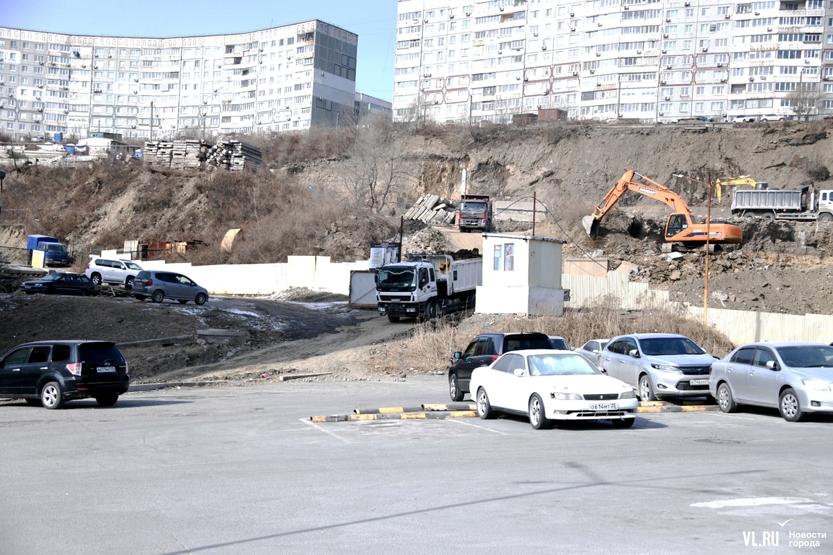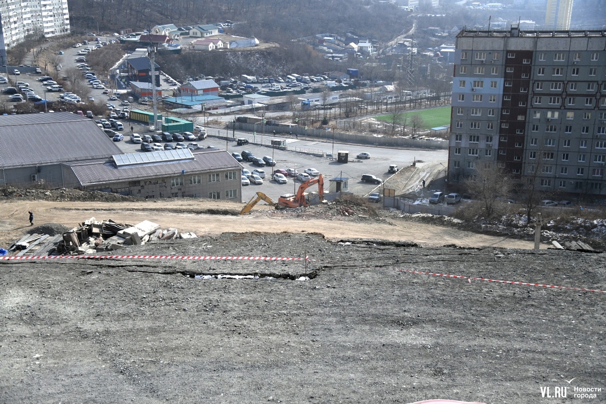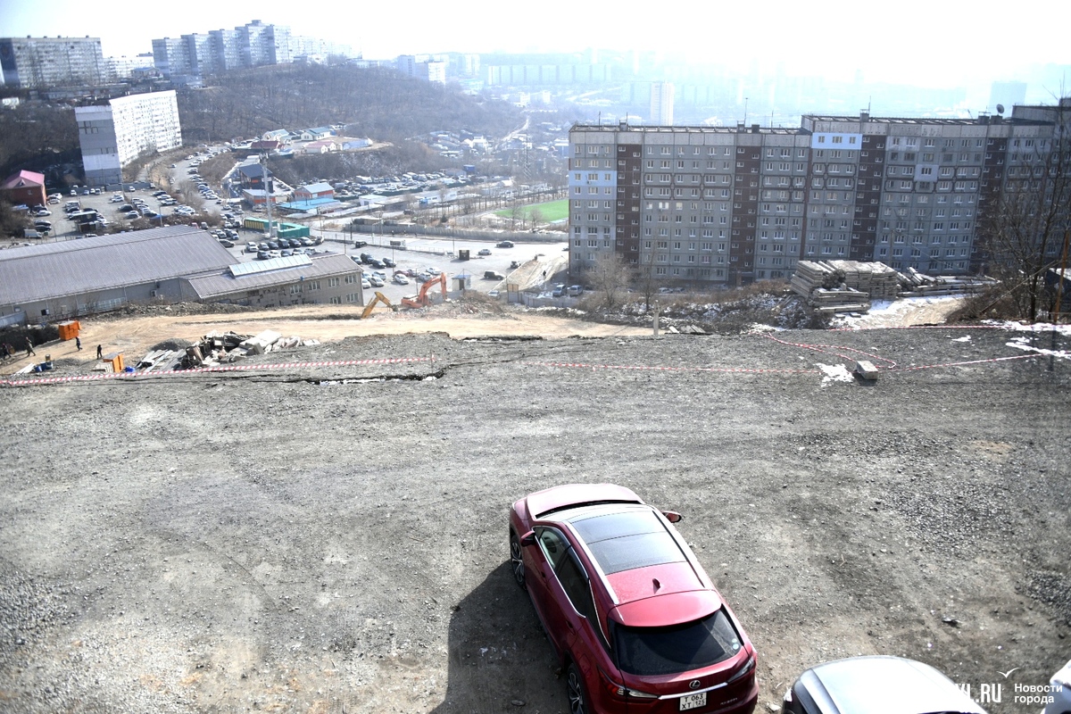 Кроме того, местные жители сообщали, что после начала строительных работ выше стройки по сопке пошли трещины, в том числе и по территории стоянки. Как раз после того, как экскаваторы стали активно вынимать и вывозить грунт, подкапывая сопку в сторону многоэтажек на Ладыгина. Как убедился корреспондент Новостей VL.ru, наверху действительно большие трещины, площадь стоянки из-за этого сократилась. Однако представитель компании на это ответил, что образовавшаяся трещина находится в пределах земельного участка застройщика.