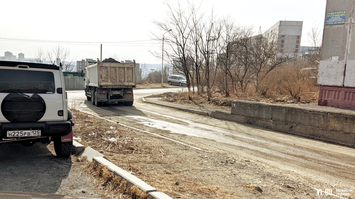 Сегодня на Черняховского грязи меньше, чем на том видео. Но в районе выезда со стройки она на дороге есть. Сам выезд – это грунтовая насыпь, по которой с большой частотой грузовики вывозят скальник. Колёса подымают пыль. Кроме того, перед выездом остался лёд, которой тает на солнце и добавляет грязи.