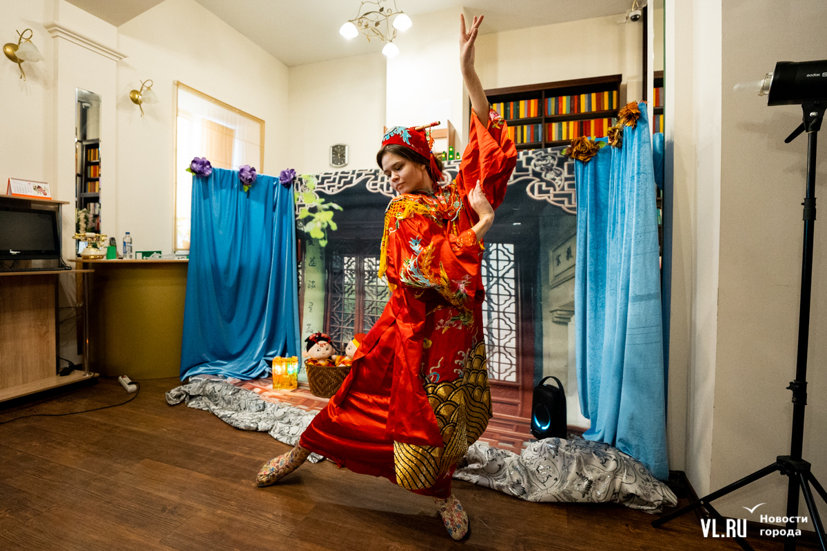 Руководитель Татьяна Дудченко рассказывает, что театру уже 12 лет, он частный и тематический – здесь в основном ставят восточные истории. Куклы сделаны в мастерской. А помогают ей и взрослые, и подростки.