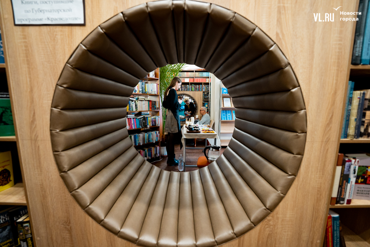 Одна из гостей и постоянных читателей рассказала, что это место на Эгершельде знают и любят. Приходят, как сегодня, отмечать праздники, и, конечно же, берут книги. В библиотеку на Верхнепортовой, 76 ходят поколениями – бабушки, их дети, а потом и выросшие внуки. Учреждение находится здесь с момента постройки дома – с 1958 года. Библиотека красива – высокие потолки, остеклённое стильное зонирование, хорошая мебель, шеренги книг в тёмных шкафах.