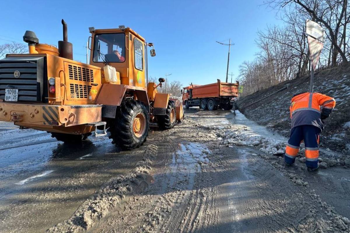 На улице Маковского на правую полосу по направлению за город натекла вода и намёрз лёд. Сегодня дорожные рабочие чистят проезжую часть от наледи. Автомобилистам нужно быть внимательнее на этом участке – работает тяжёлая техника.