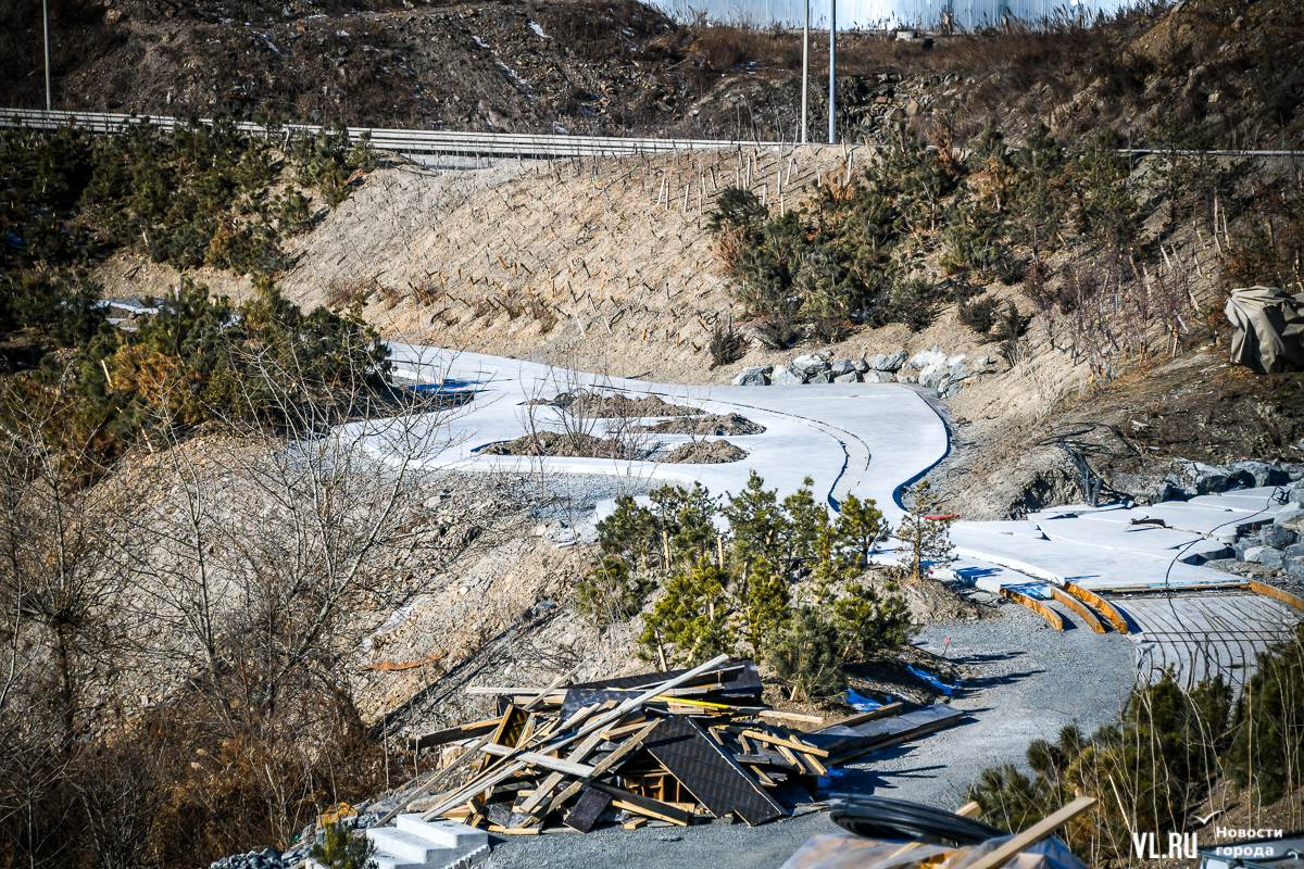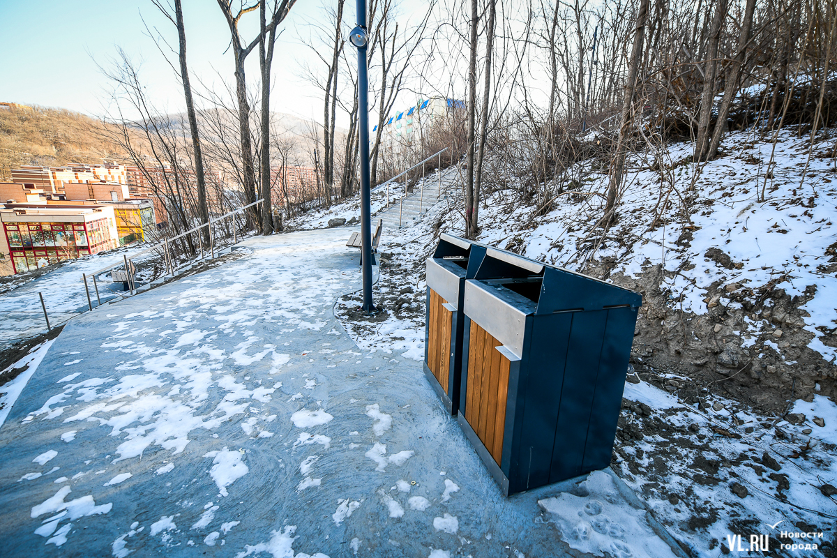 Недостатки вскрылись ещё на этапе работ: строители жаловались на течь со склона. Она же дала о себе знать зимой и уже затопила дорожки толстым слоем льда. Причём от течи открестились все сетедержатели, и пока они показывают друг на друга, вода продолжает разрушать благоустройство. Есть проблемы и помельче, например, не предусмотрели удобный спуск на лёд. На детской площадке есть два мини-батута, которые уже не прыгают – резинка упирается в землю. Склоны сопки и детская площадка завалены мусором, а недавно вандалы разбили прожектор. В общем, за сохранность общественного пространства уже тревожно.