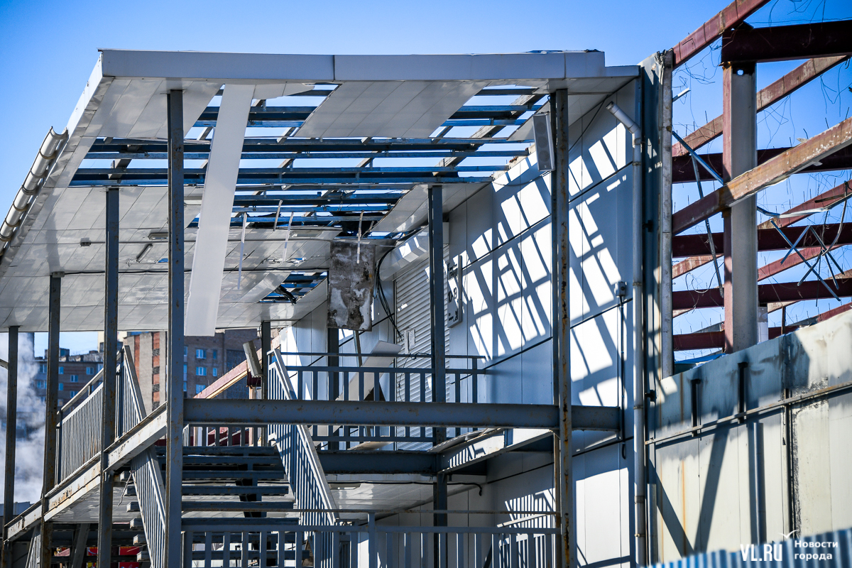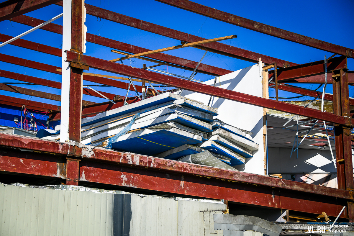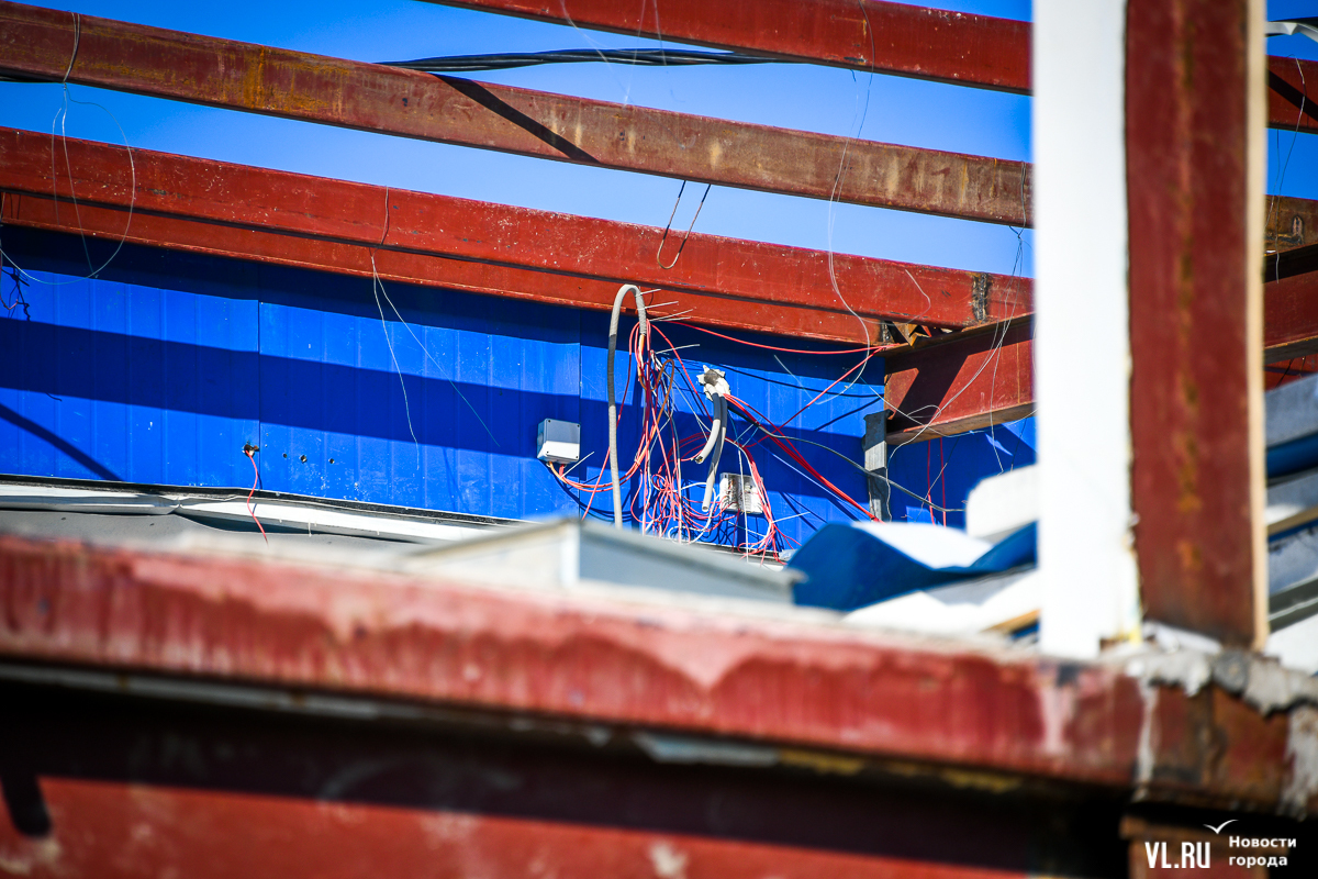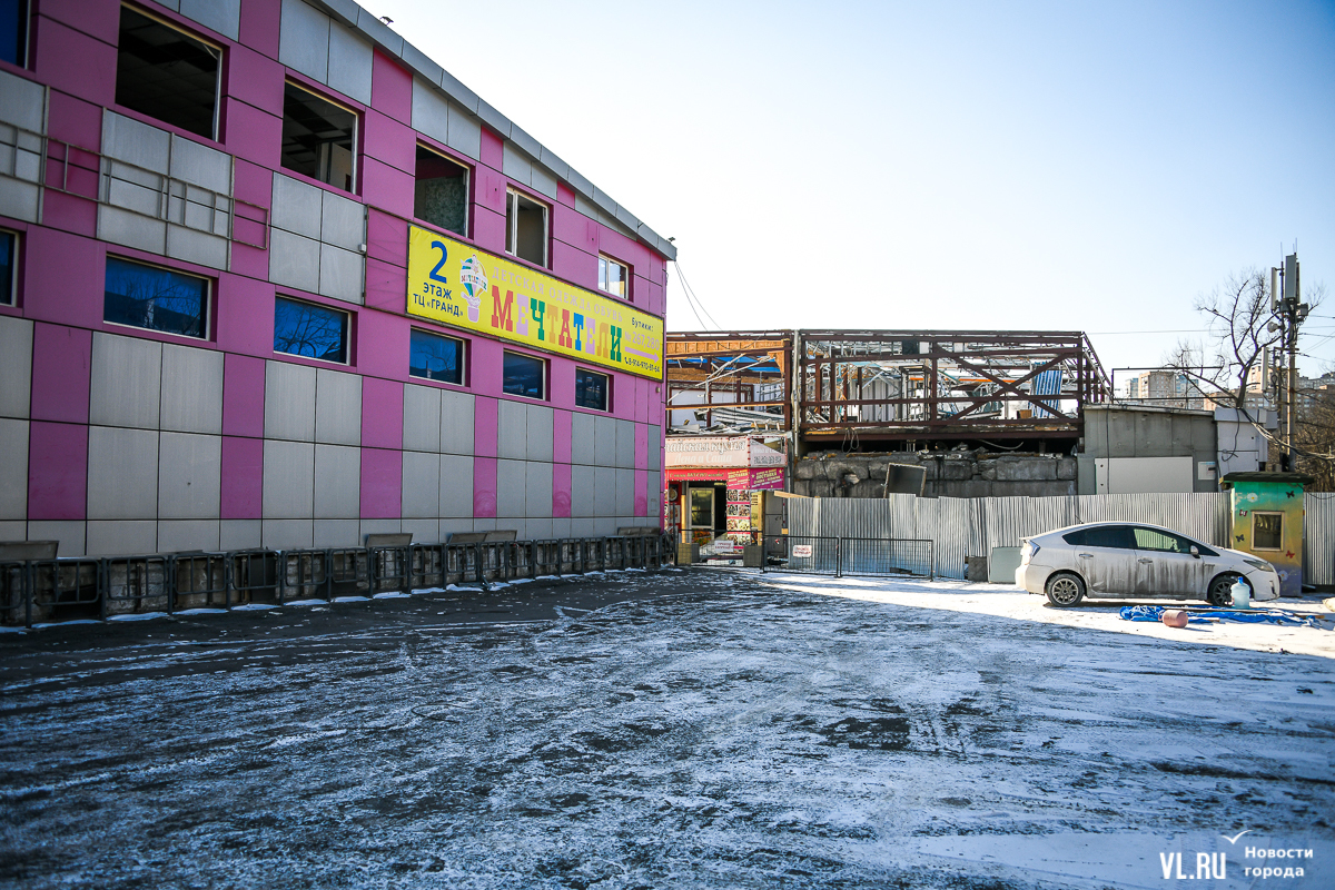 Корреспондент Новостей VL.ru застал рабочих за процессом, в люльке подъёмника. На сегодняшний день у ТЦ «Гранд» почти полностью разобрали второй этаж. Торчат только металлические рёбра, рабочие стопками складывают демонтированные утеплённые панели. Кое-где можно заметить не вывезенные стеклянные витрины. У «Союза» уже нет окон на втором этаже – оба здания разбирают параллельно. Со стороны Фадеева к «Союзу» пристроены маленькая закусочная и парикмахерская. Сотрудники говорят, что в ближайшее время будут «отстыковывать» свои пристройки, но далеко убирать не планируют – оставят тут же на тротуаре. Оба ТЦ обнесены забором так, что между ними больше не осталось прохода. Тротуар вдоль трамвайных рельсов тоже перекрыт, пешеходы идут ближе к дороге.