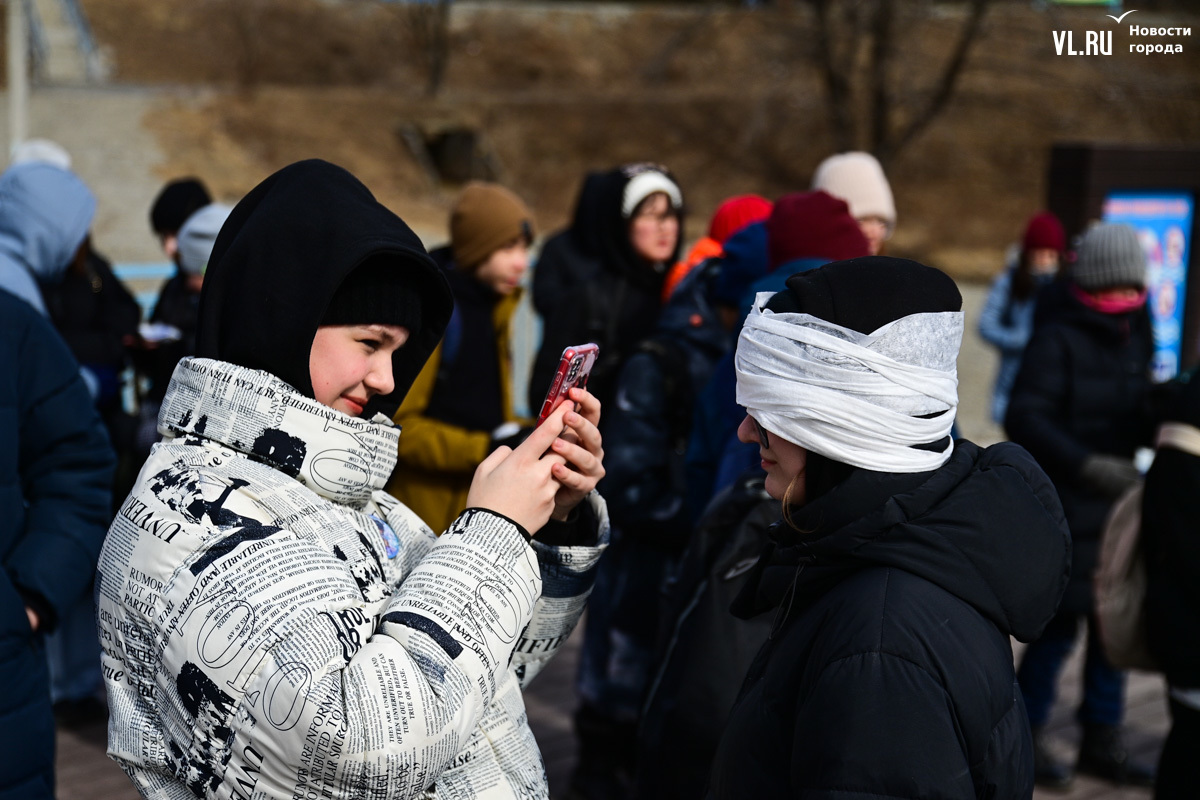 Отменять мастер-класс из-за холода и сильного ветра не стали. На занятие к инструкторам Анне и Арине, студенткам Тихоокеанского государственного медицинского университета, пришли ученики восьмых-девятых классов из ближайших школ и их учителя. Через 15 минут дети и взрослые уже замёрзли. А вместо манекенов перед ними поставили коробку с бинтами.