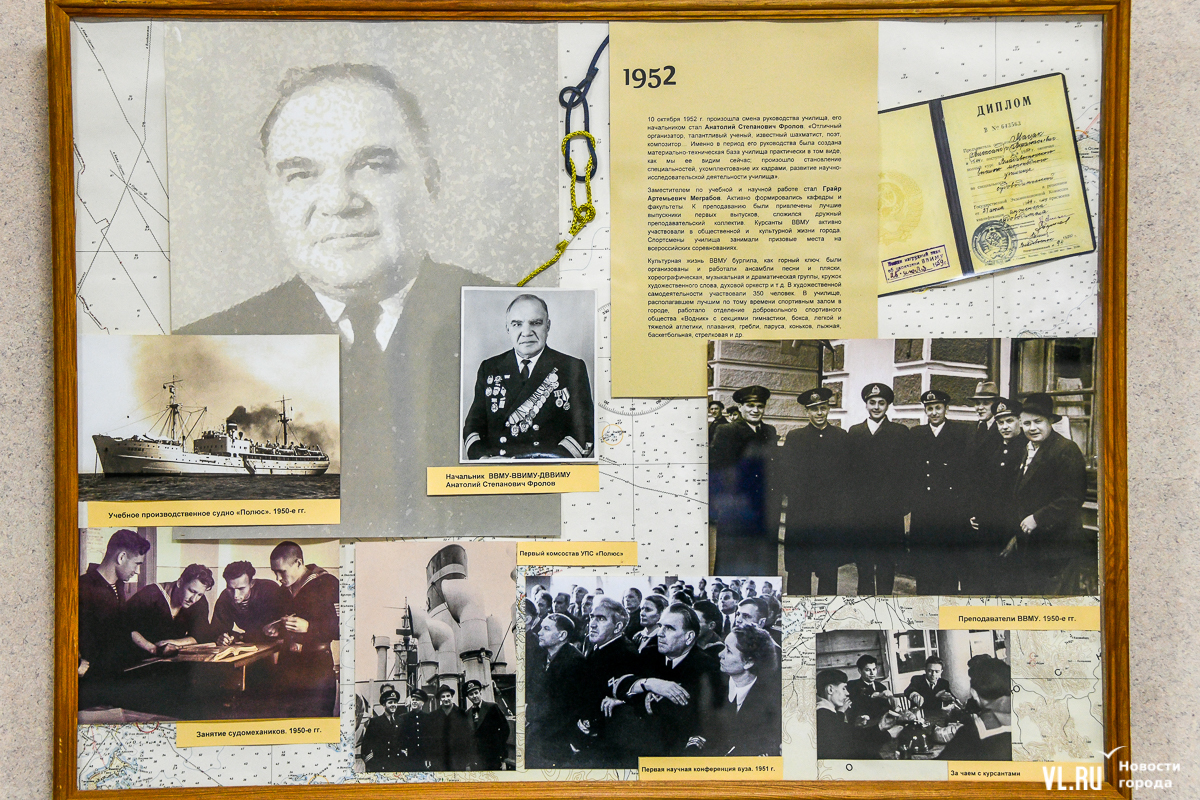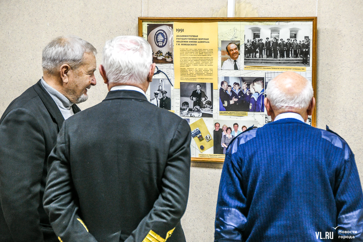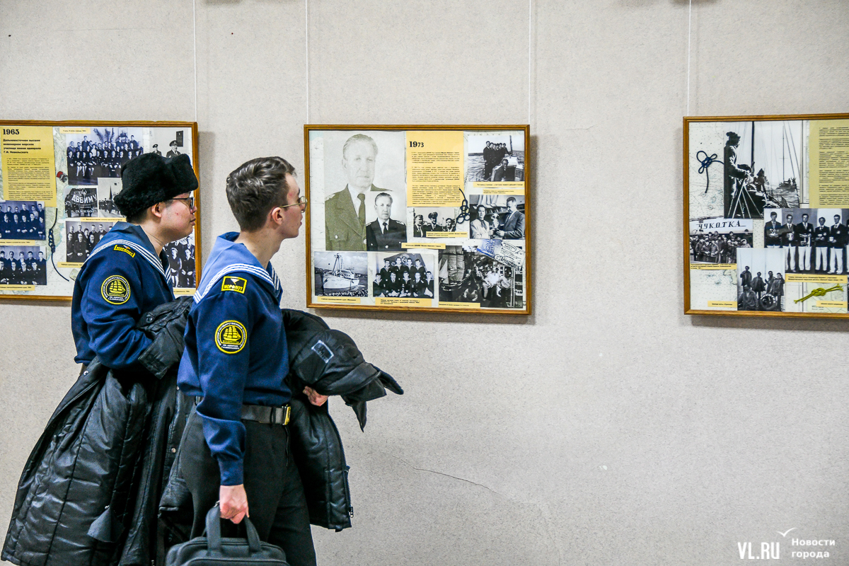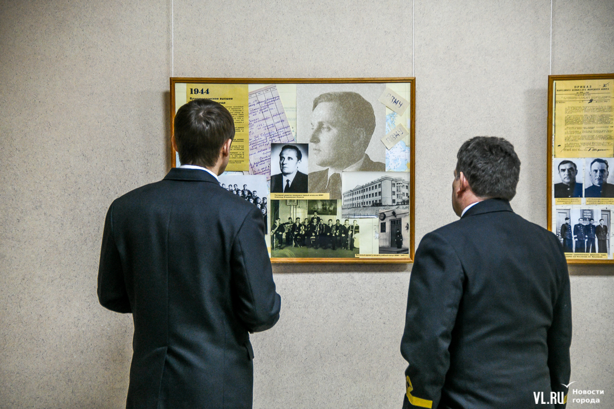 Ветераны отмечают: дружба не покидает всё это время – уже 50 лет встречаются каждый год. Владимир Фёдорович Гаманов желает молодым курсантам, «чтобы они дожили до тех времён, когда выйдут из стен этого замечательного вуза и будут собираться ежегодно и вспоминать вот эти не зря прожитые годы ношения формы одежды». Он учился на механика, окончил вуз в 1968-м. «Кто-то пошёл на флот, кто-то доработал до старшего механика и пошёл дальше – в управления Дальневосточного и Приморского пароходства, кто-то пошёл в армию и дослужился до капитана 1-го ранга. Непростая задача окончить «бурсу». Но, посмотрев сегодня на фотографии [на выставке], подумайте, что и вы можете оказаться здесь, что будущие выпускники так же будут смотреть на вас», – обратился он к молодым людям, только начинающим своё обучение морским наукам.