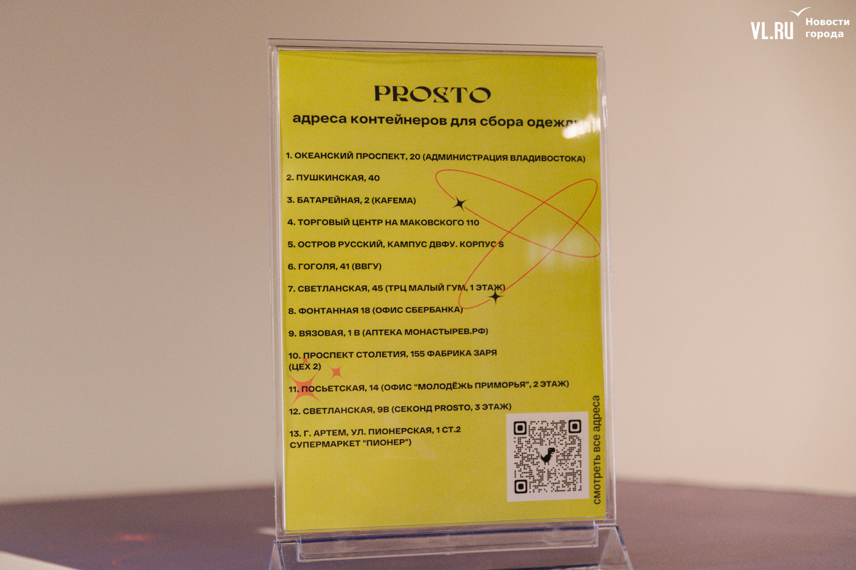 Напомним, во Владивостоке и Артёме работает 13 пунктов сбора, куда можно принести приличную, чистую и целую одежду. Если сомневаетесь, хорошая это вещь или нет, просто подумайте – смогли бы вы её отдать другу? Если да, то смело несите её в синие кубы, которые находятся по адресам: