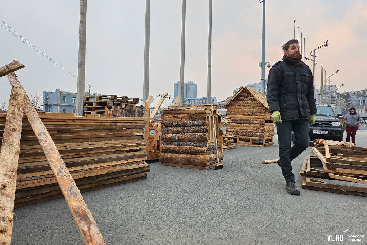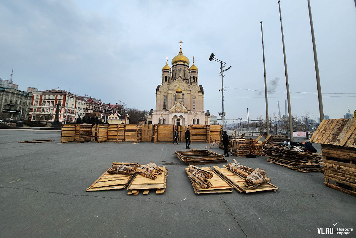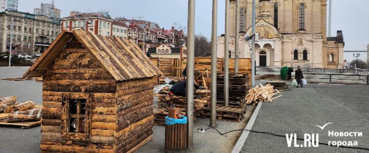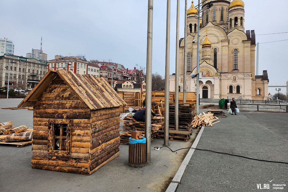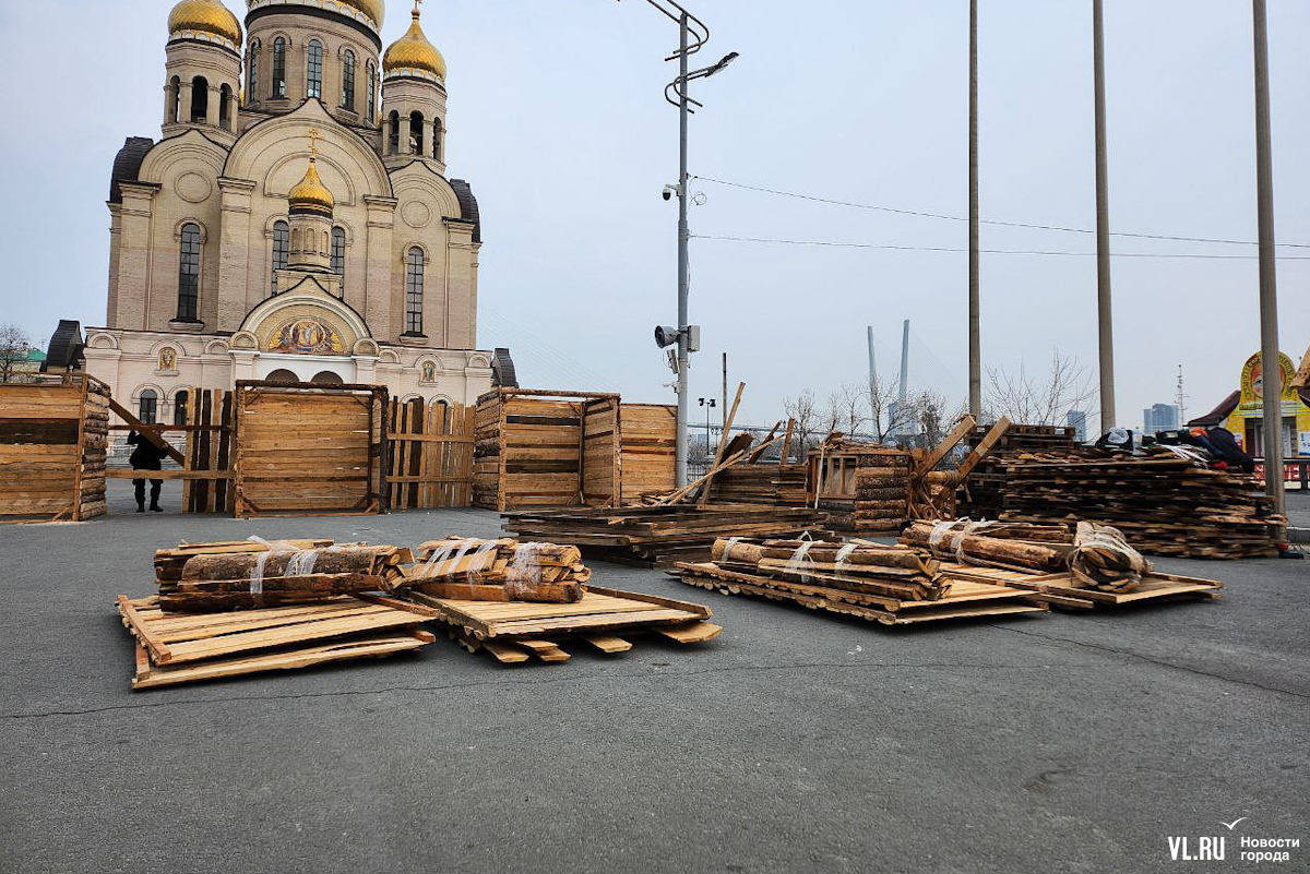 Празднование Масленицы запланировано в различных районах Владивостока, но основные гулянья развернутся на центральной площади 17 марта – сегодня здесь уже строят терема-избушки из досок и горбыля. Работы пока находятся в начальной стадии. Домики появляются по периметру будущей праздничной площадки, где развернутся мастер-классы, весёлые забавы, будут выпекать блины и сжигать чучело.